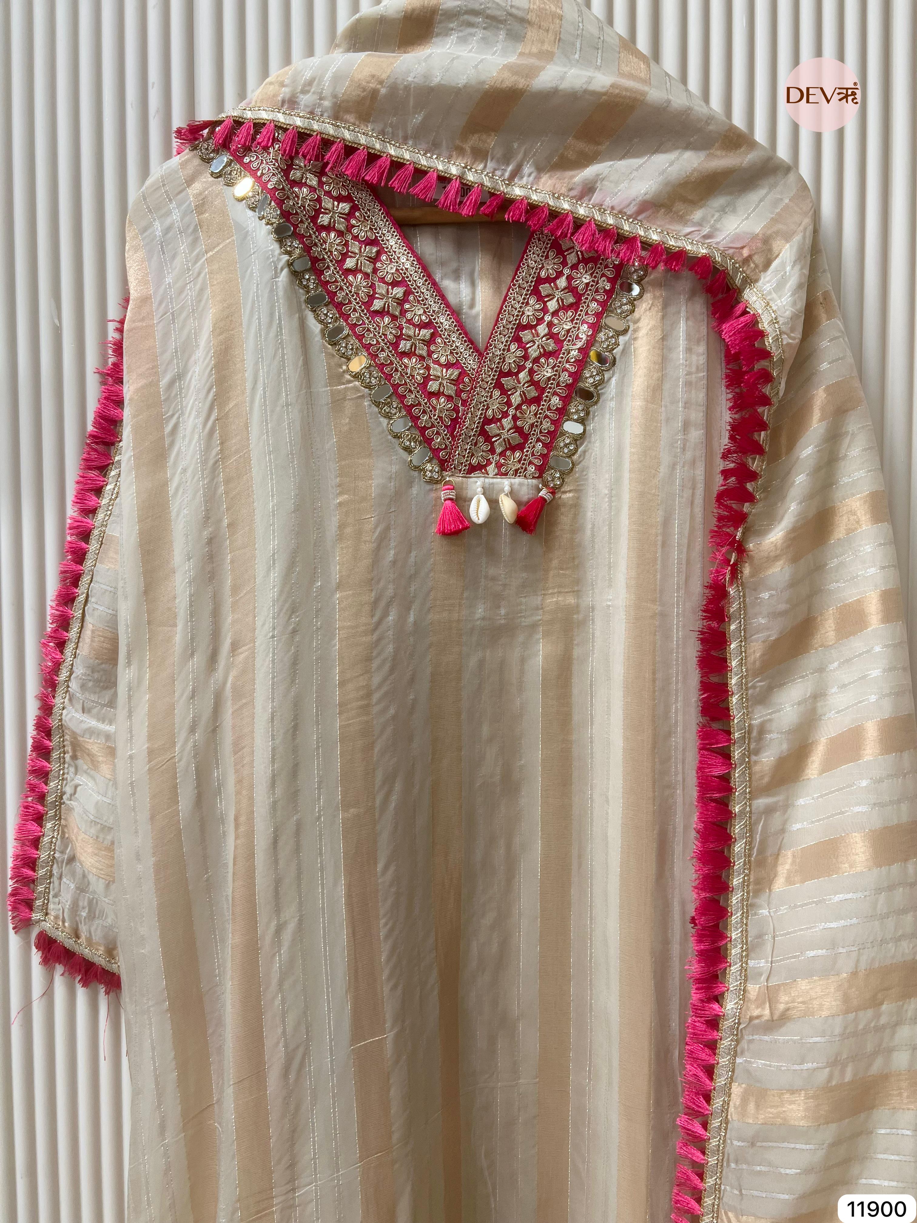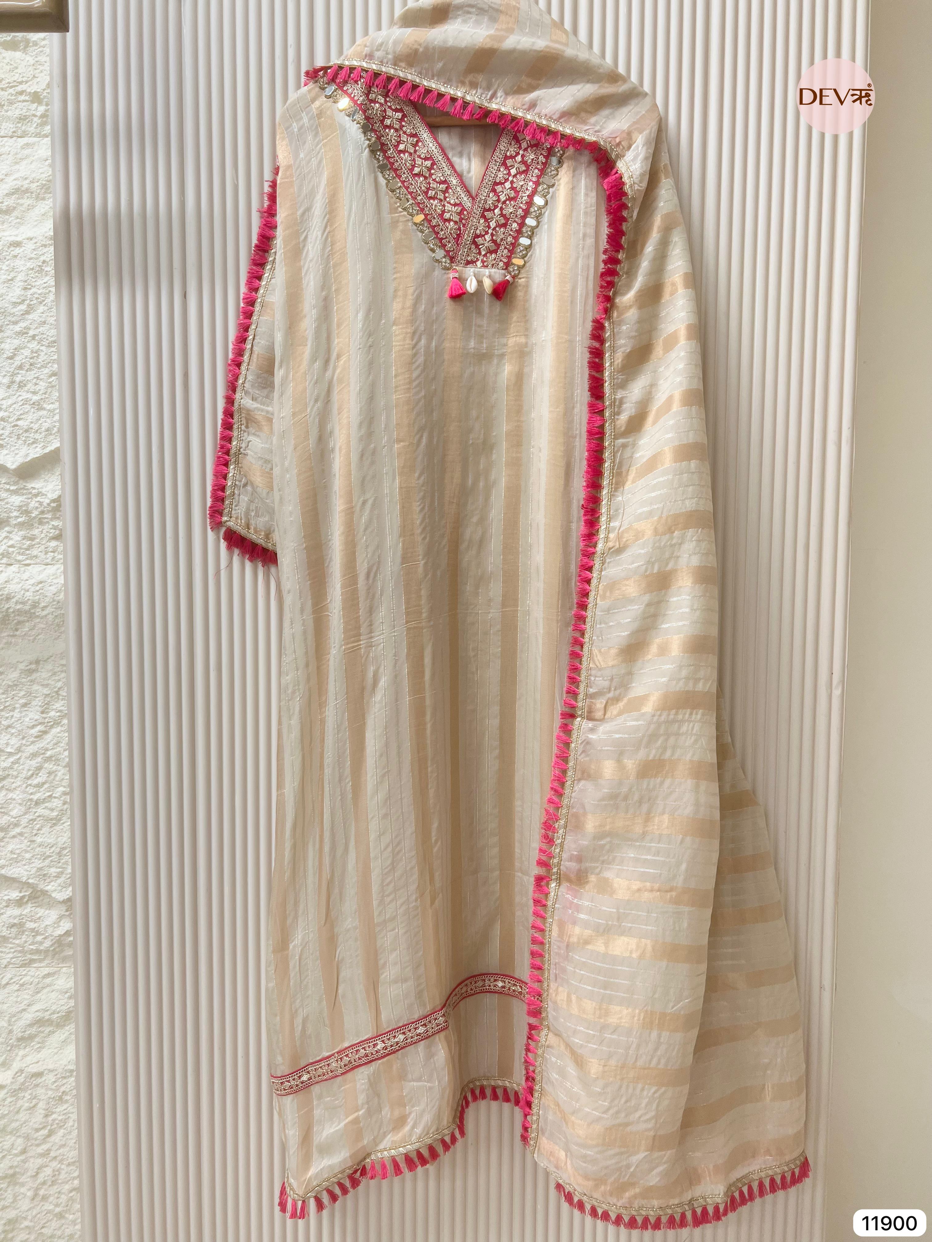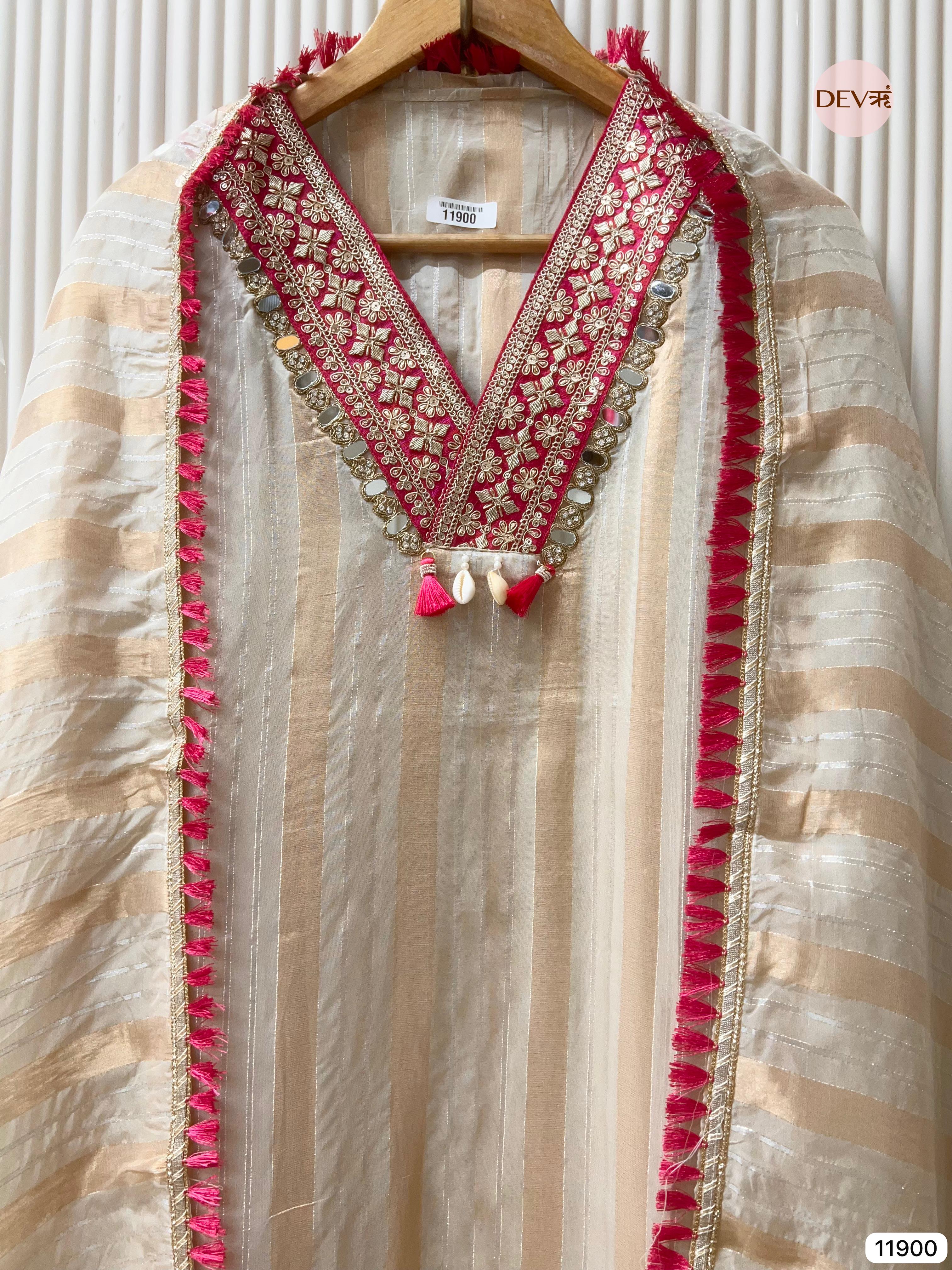 Off White Tissue Shimmer Silk Unstitched Hand Embroidered -Set Of 3
