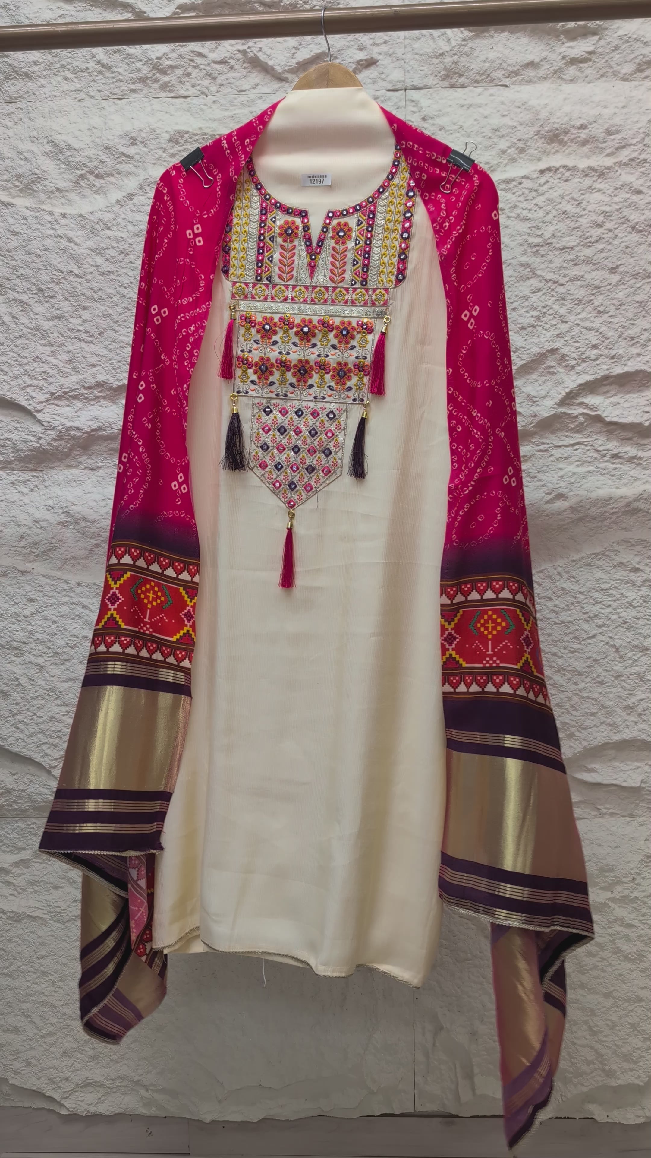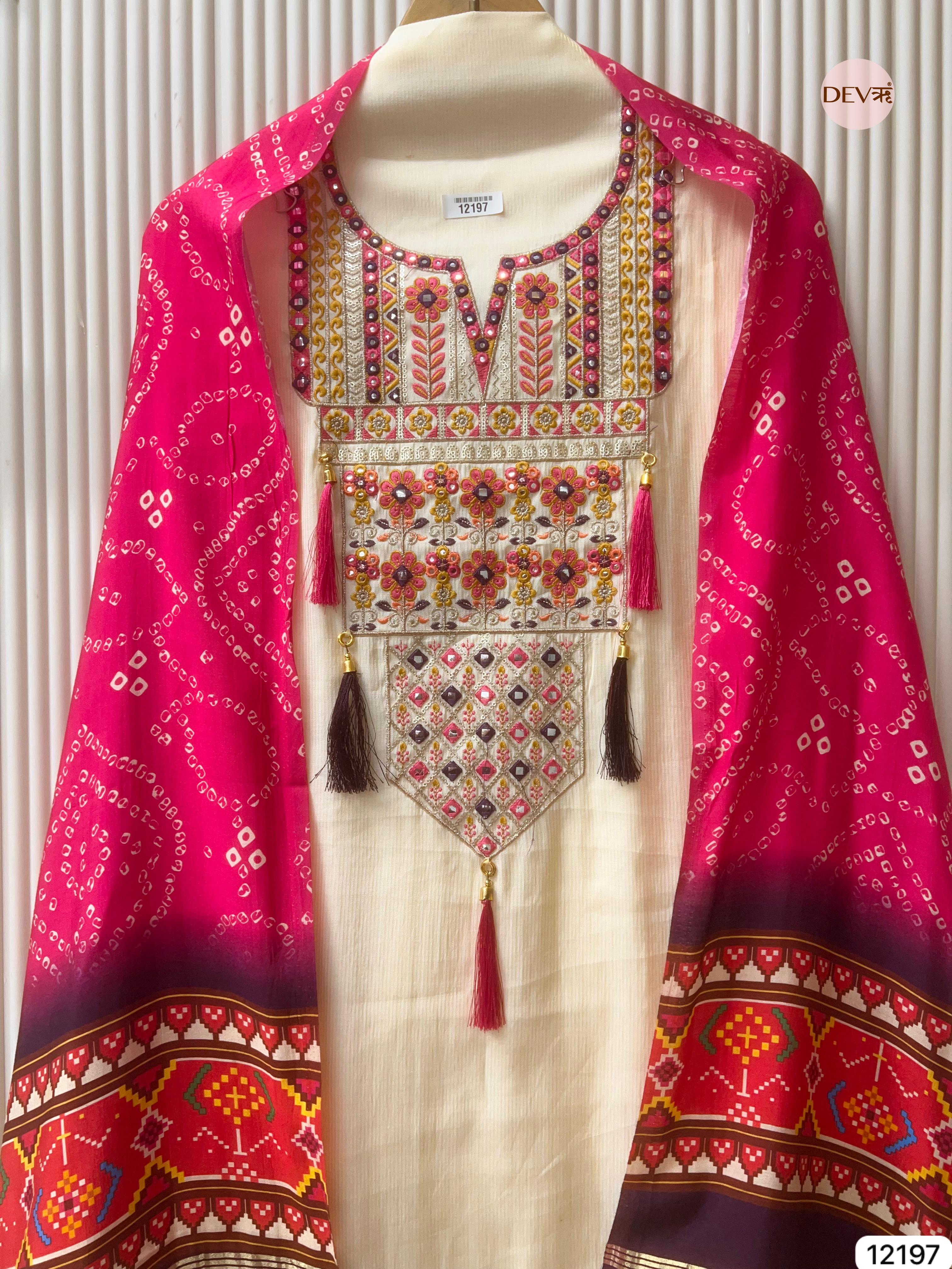 Shirt - Muslin unstitched with embroidered neckline and tassles