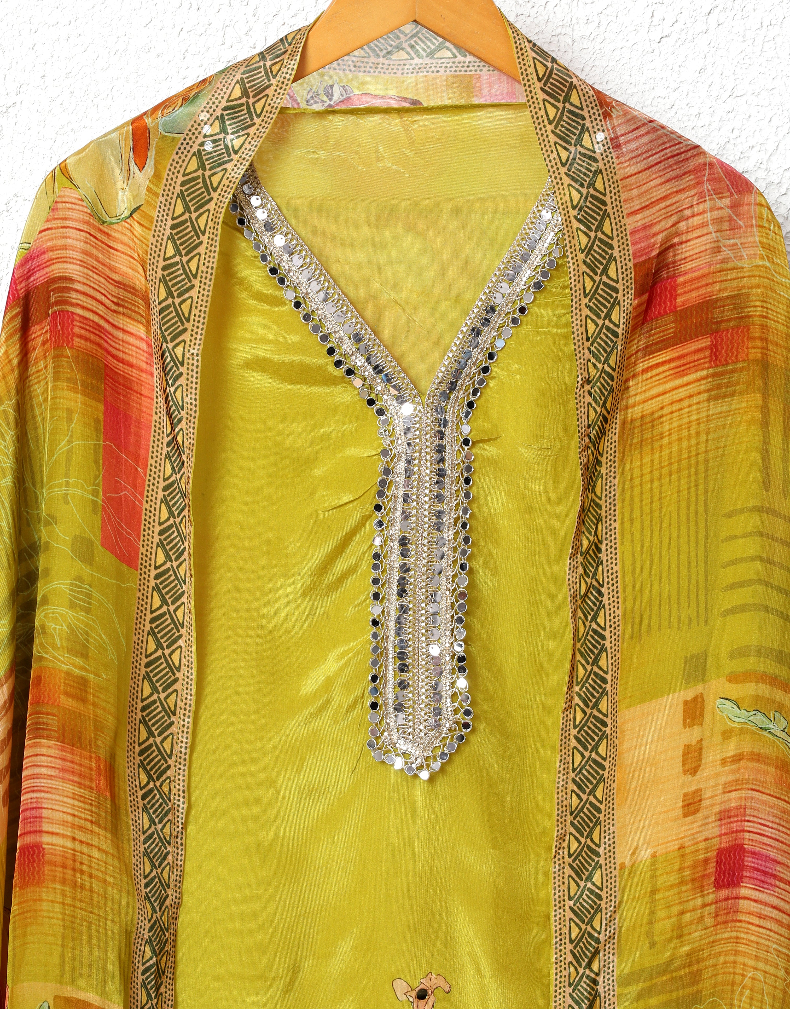 A vibrant unstitched set in rich mustard glass organza silk, featuring vivid floral prints accentuated with mirror and thread detailing. The fluid texture and colourful interplay create an elegant yet lively festive appeal.