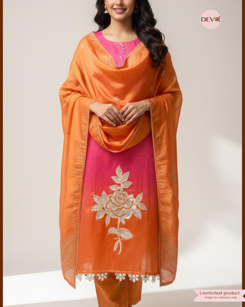 A striking blend of rich orange and deep pink in soft tissue shimmer silk, adorned with elegant metallic floral embroidery that adds a refined festive glow. The coordinated dupatta carries a subtle shimmer finish, completing this vibrant, sophisticated ensemble.