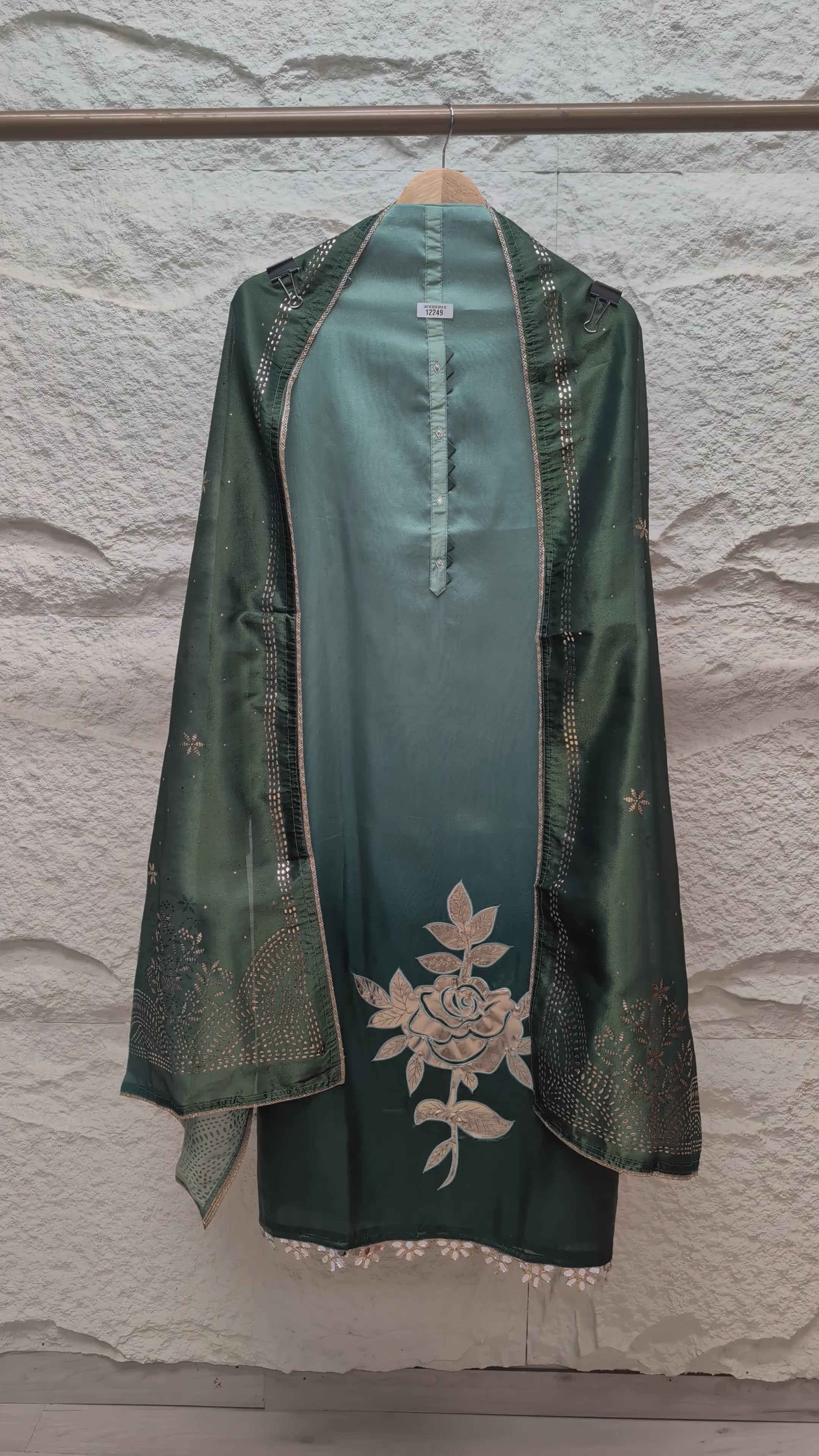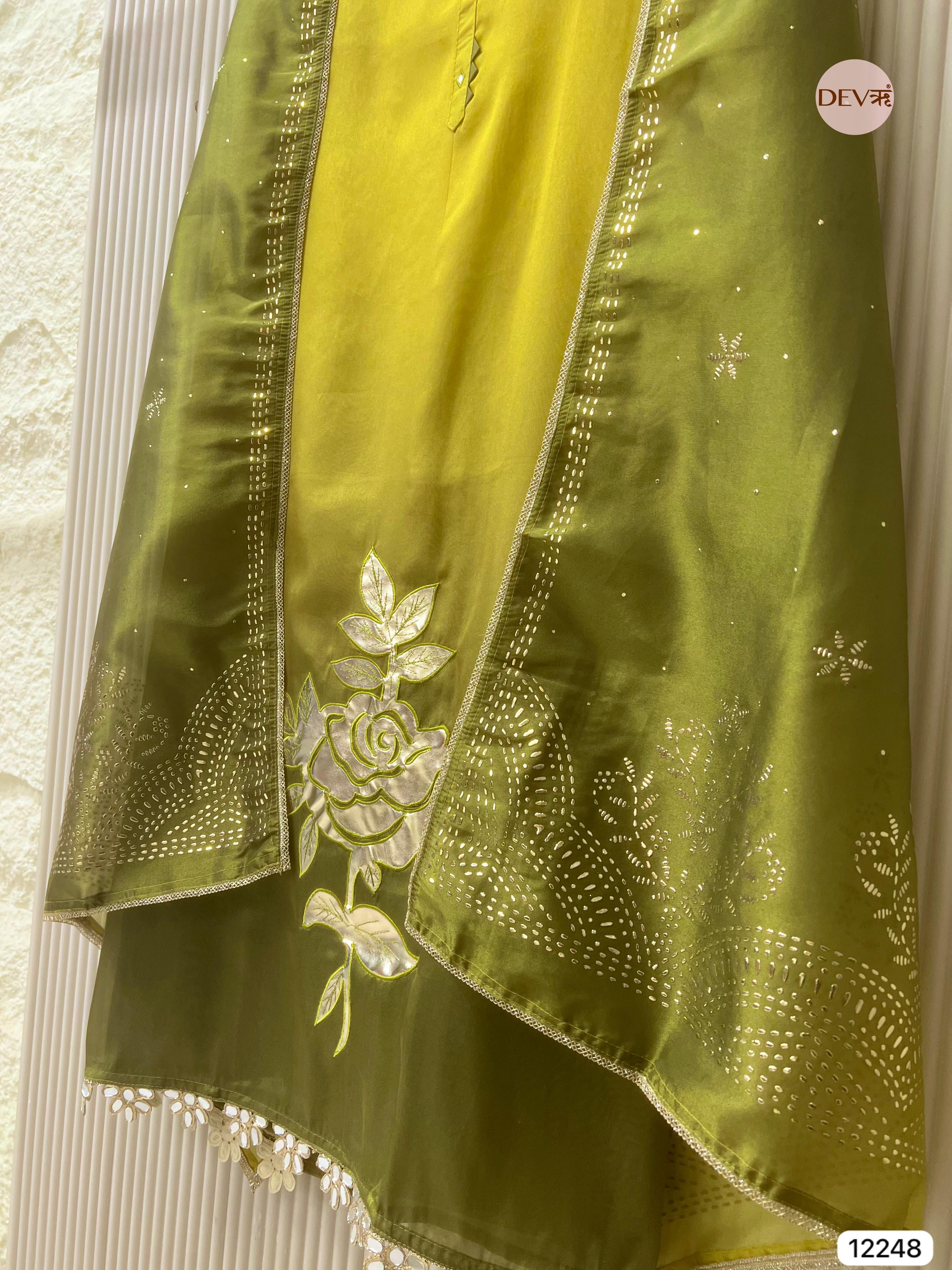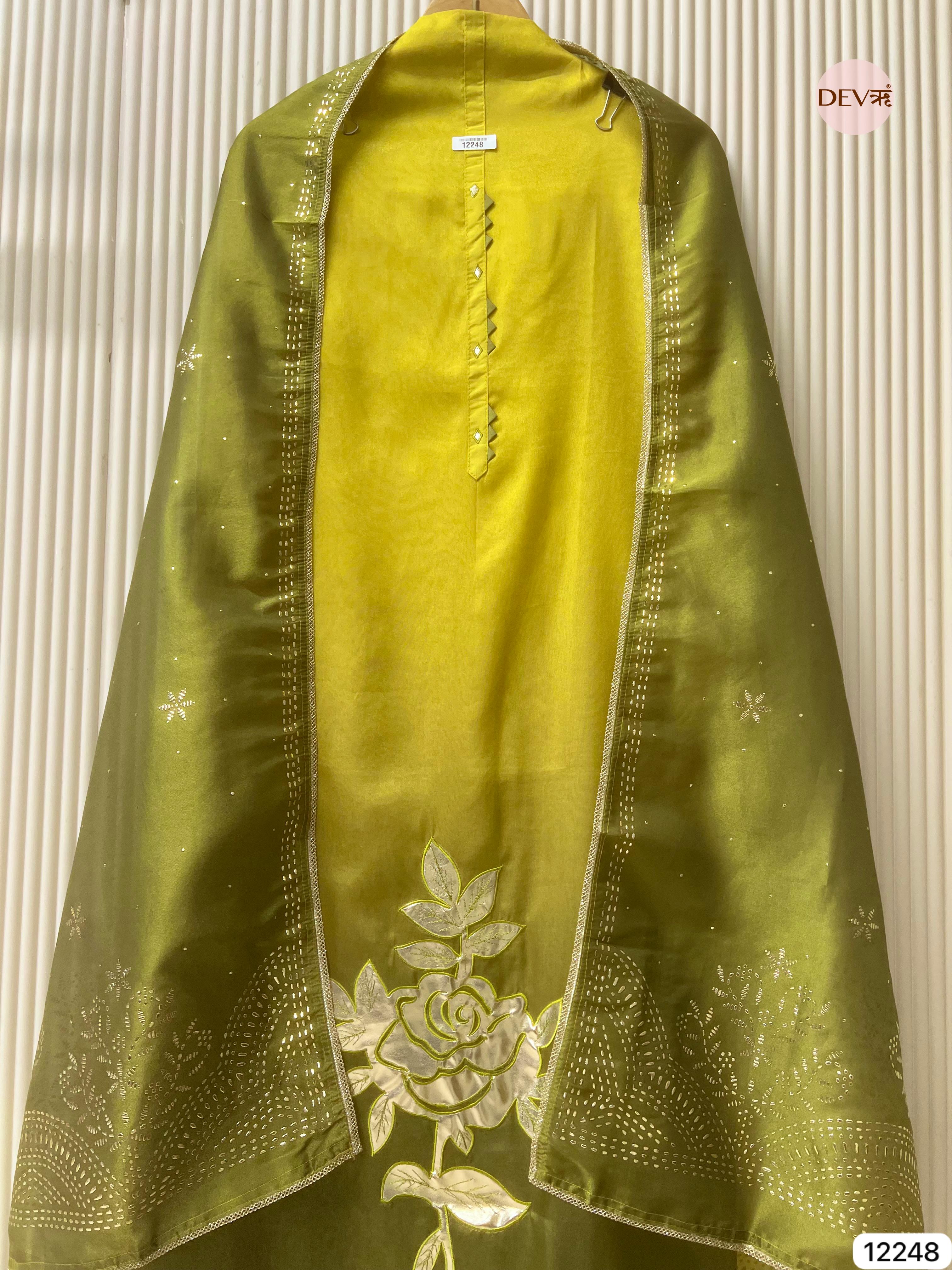 A refined olive-toned masterpiece crafted in soft tissue shimmer silk, featuring an elegant appliqué floral motif and delicate sequin embellishments that enhance its graceful sheen. The coordinated dupatta carries intricate embroidery inspired by traditional craftsmanship, making it an exquisite choice for festive and evening silhouettes.