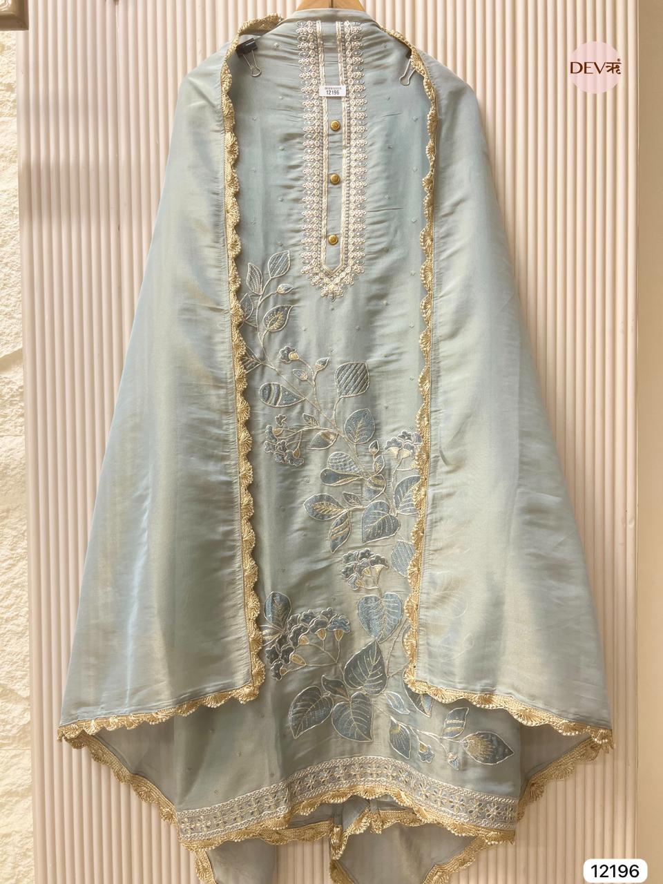 Ice Blue Shimmer Silk Embroidered Unstitched 3-Piece Suit (Devri – D.No 12196)