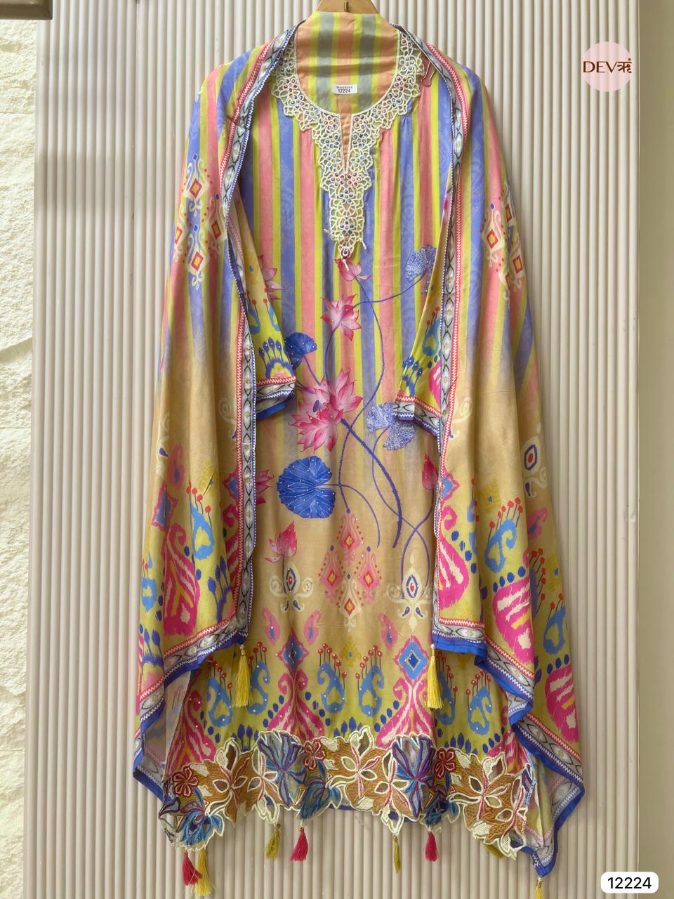 A lively blend of pastel and vibrant hues flows across this soft muslin canvas, highlighted by striped patterns, floral artistry and intricate border work. The fabric’s gentle drape enhances the colourful detailing, creating a refreshing and expressive look while maintaining Devri’s signature refined subtlety.