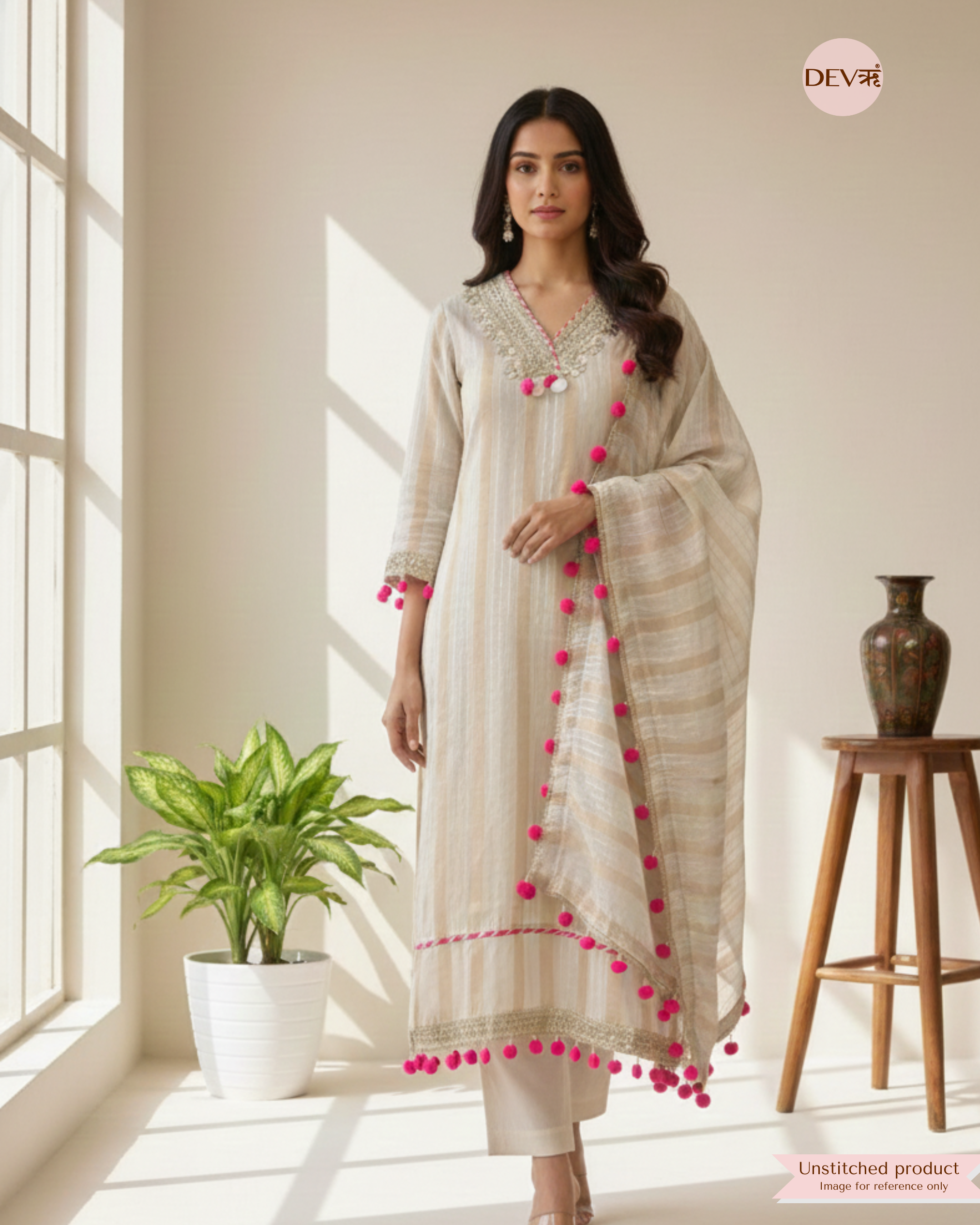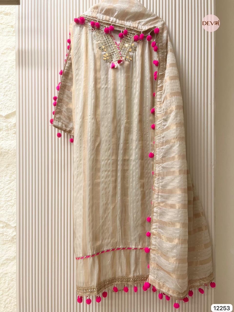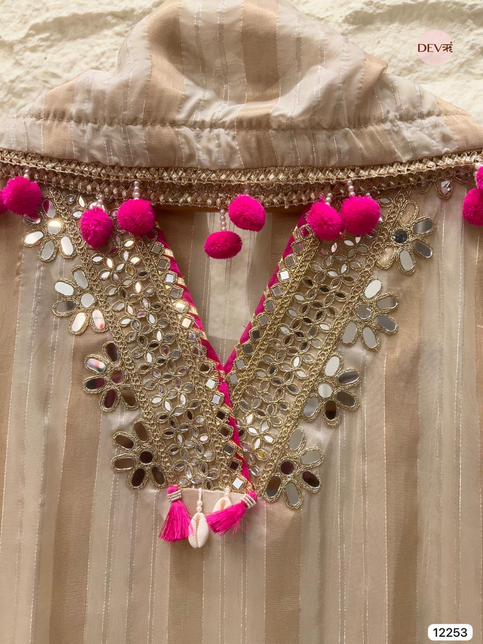 A soft beige shimmer base is elevated with delicate golden embroidery and vibrant pink tassel accents, creating a graceful blend of elegance and playful detailing. The subtle sheen of tissue shimmer silk enhances the striped texture, offering a refined yet lively aesthetic in Devri’s signature understated tone.