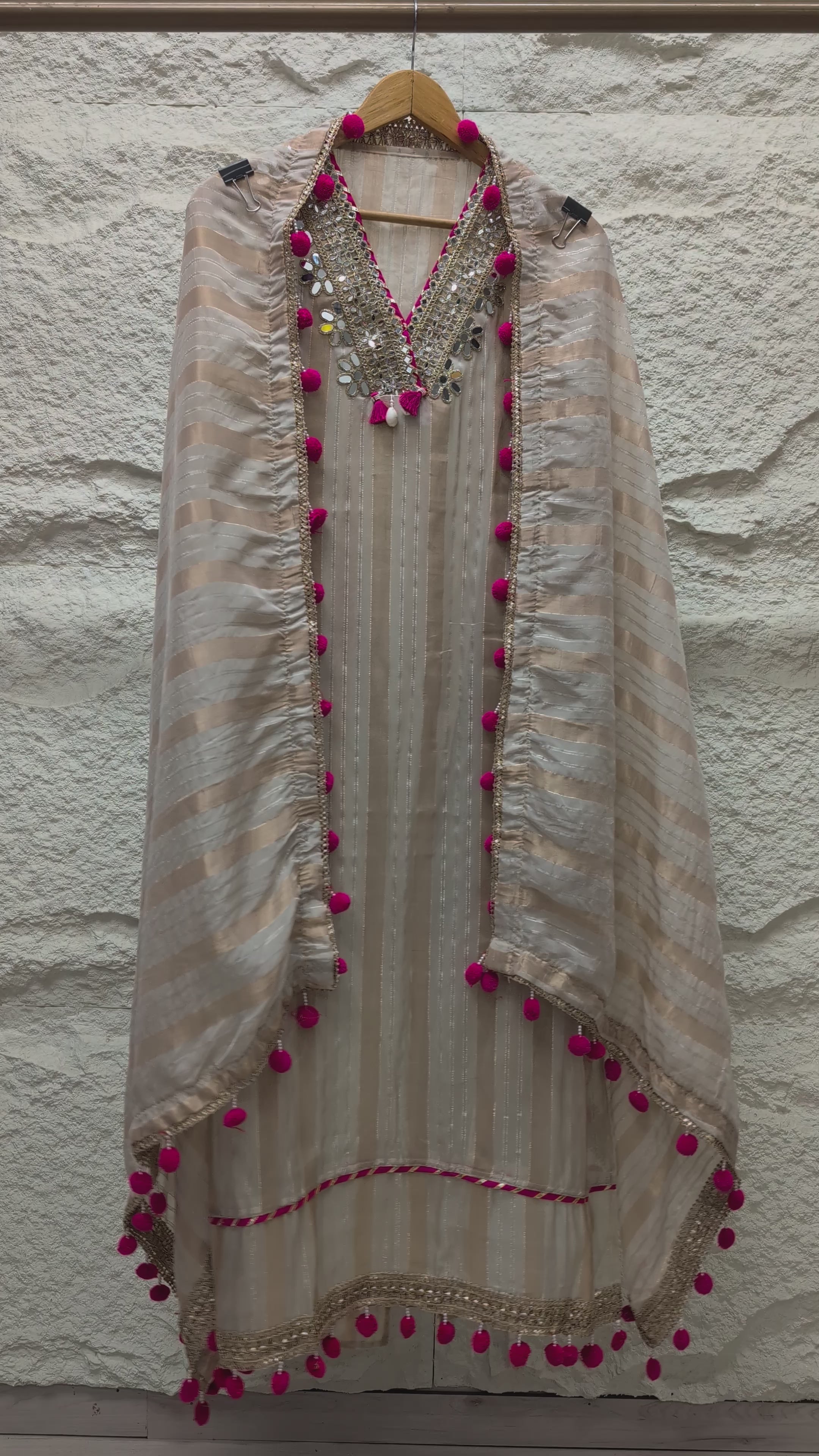 Detailing: Embroidered neckline with mirrorwork and subtle textured stripes