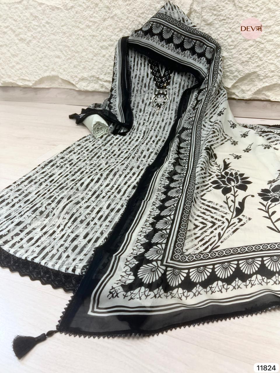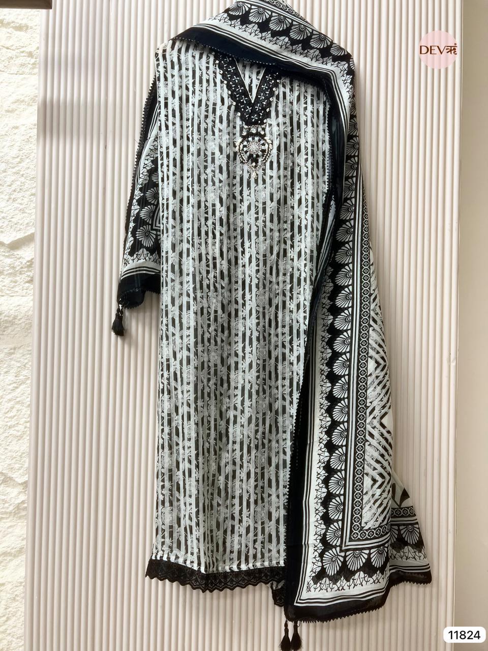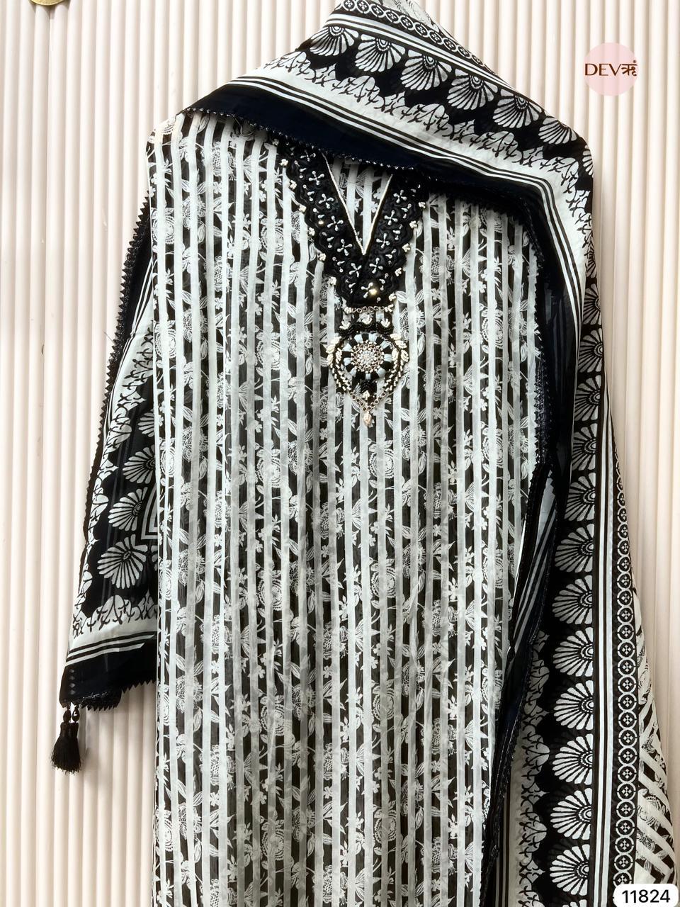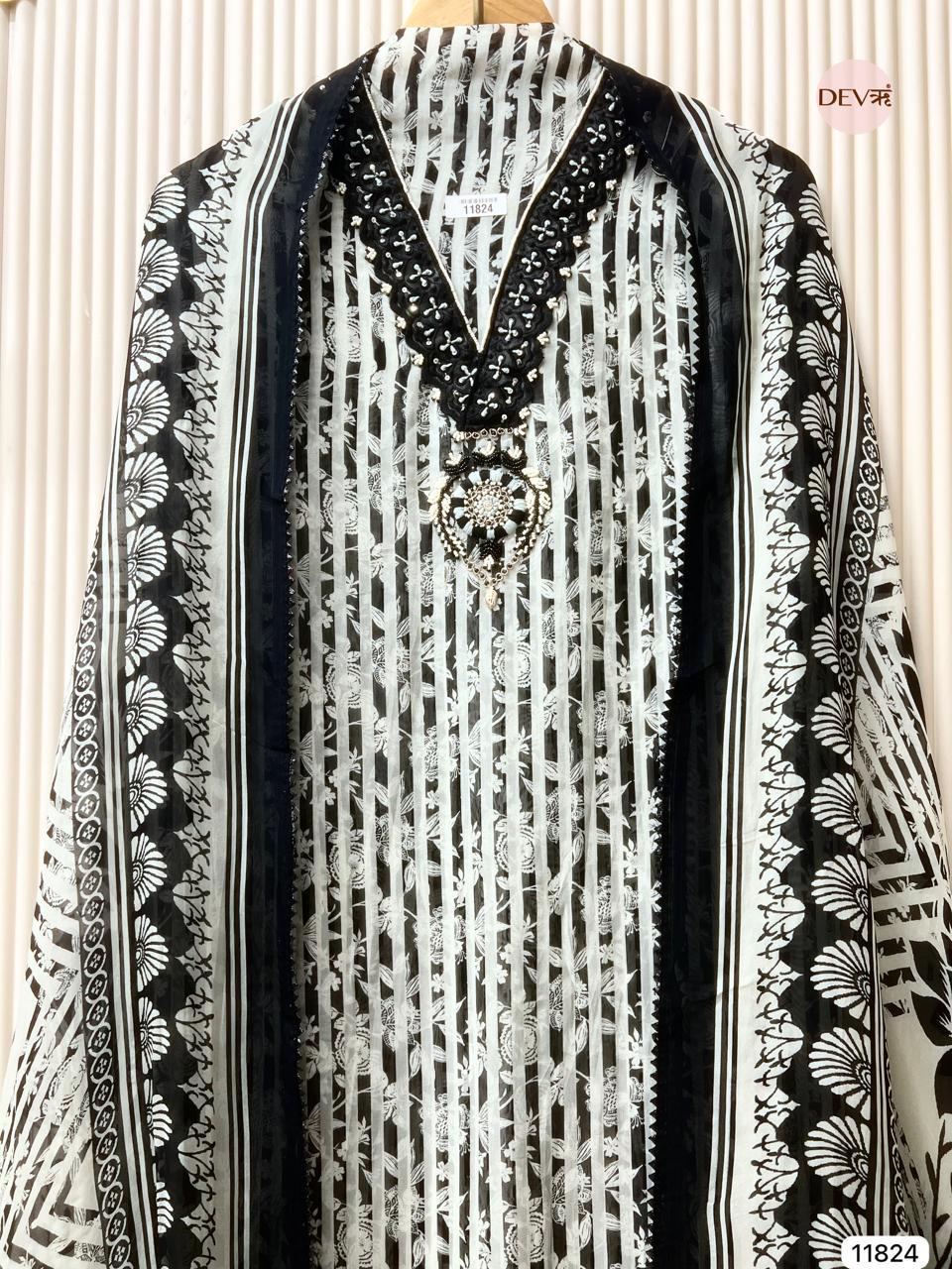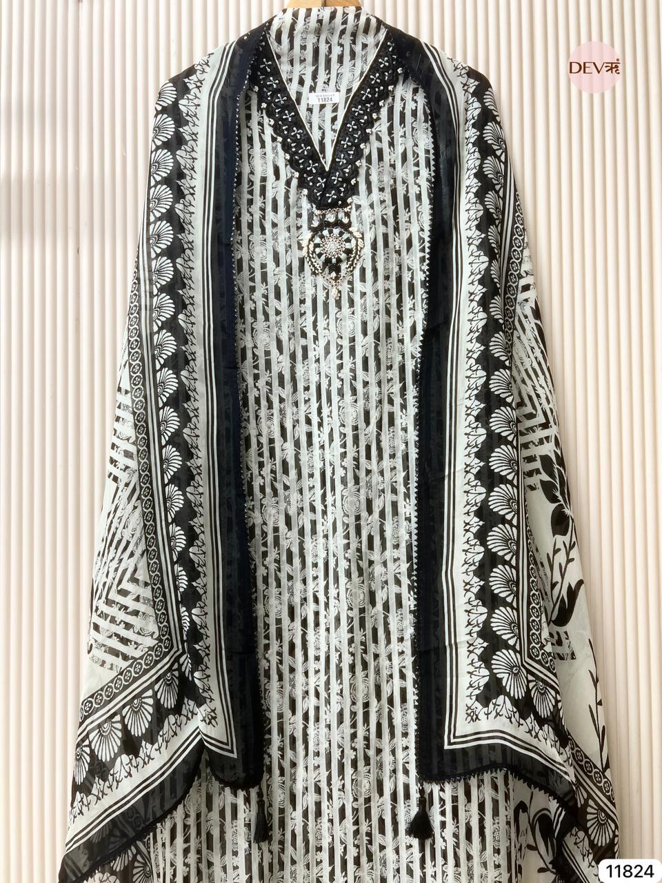 A striking black and ivory unstitched ensemble crafted in sheer organza, featuring linear prints balanced with delicate embroidery and mirror accents at the neckline. The lightweight fabric creates a graceful transparency, while the coordinated organza dupatta with bold borders adds a refined, contemporary edge.