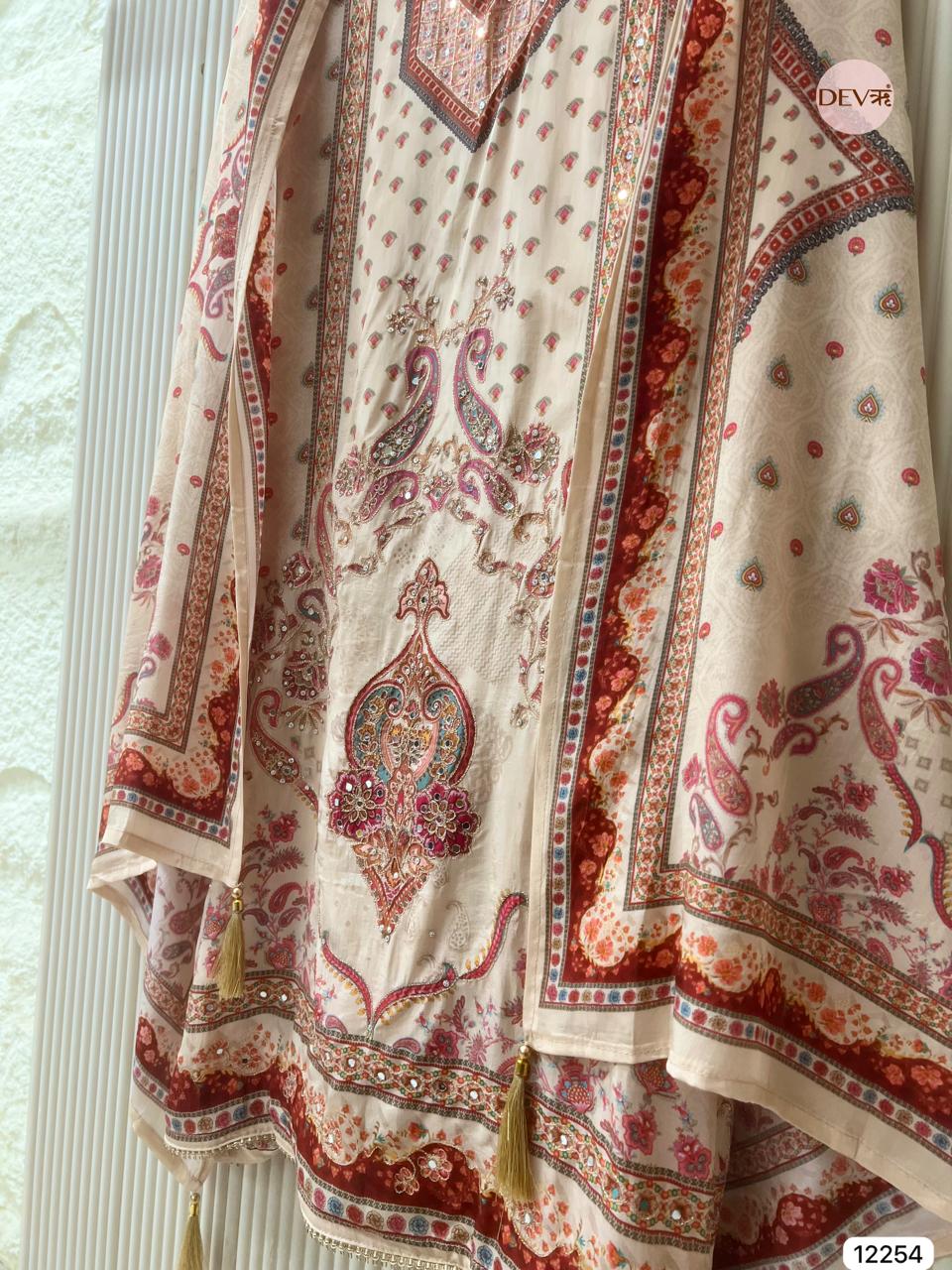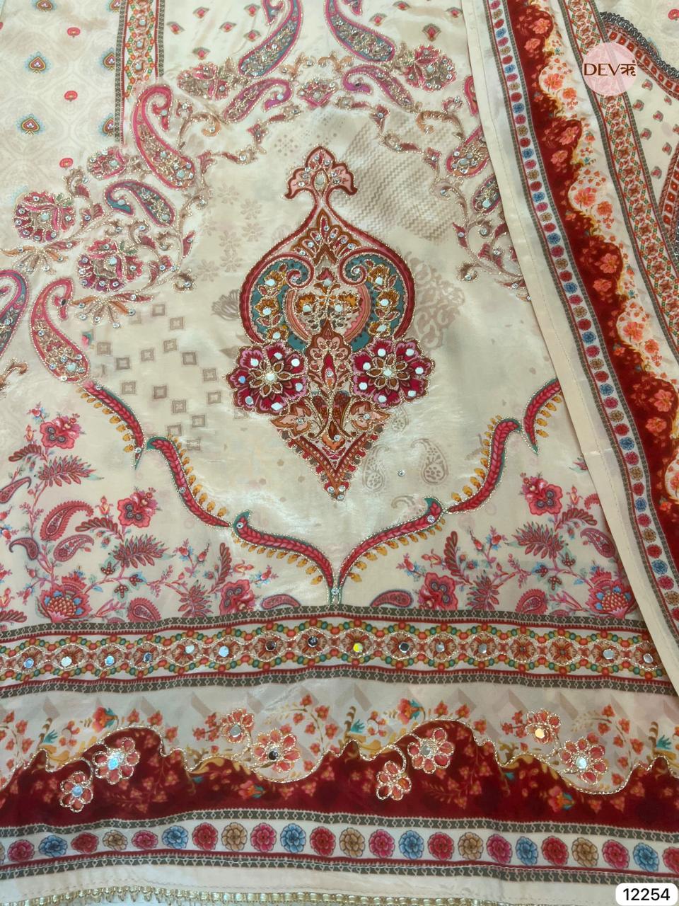 A soft beige palette is elevated with intricate ethnic prints and subtle sheen on fine glass organza, creating an elegant composition that feels both refined and artful. Delicate motifs and harmonious borders add depth and richness while maintaining Devri’s signature understated sophistication.