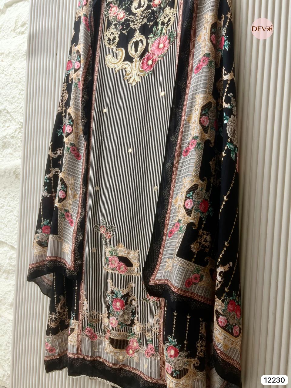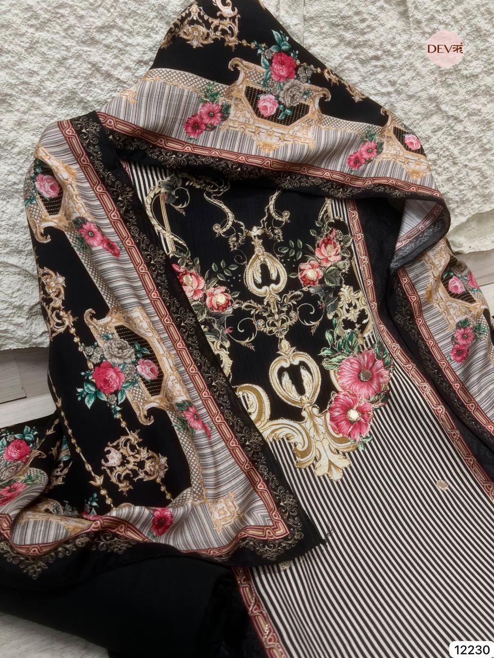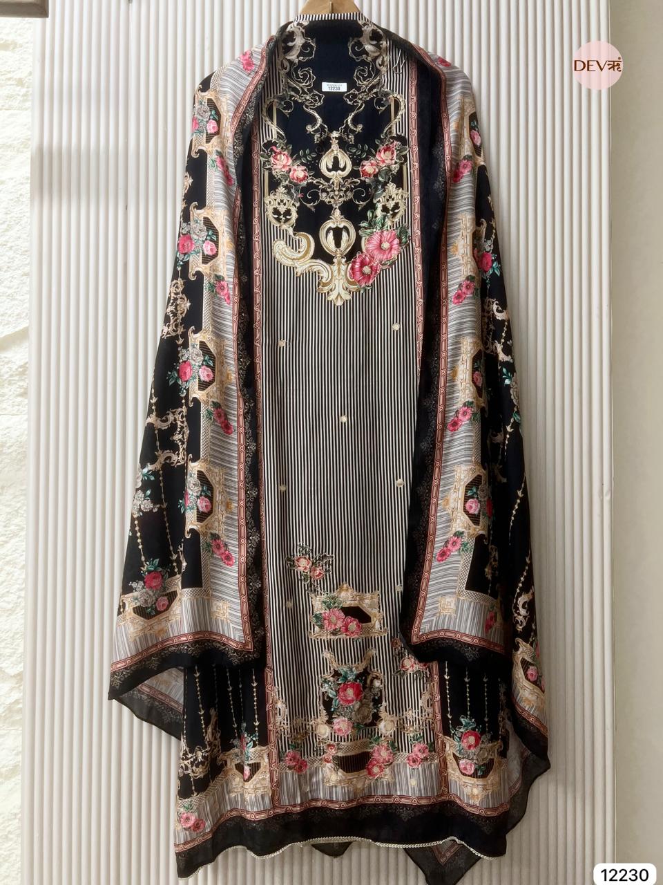 A striking black muslin suit featuring an artistic blend of ornate motifs and delicate florals, arranged over soft vertical stripes for a refined yet statement look. The luxurious drape of pure muslin enhances the intricate printwork, while the matching dupatta completes the ensemble with seamless, coordinated elegance.