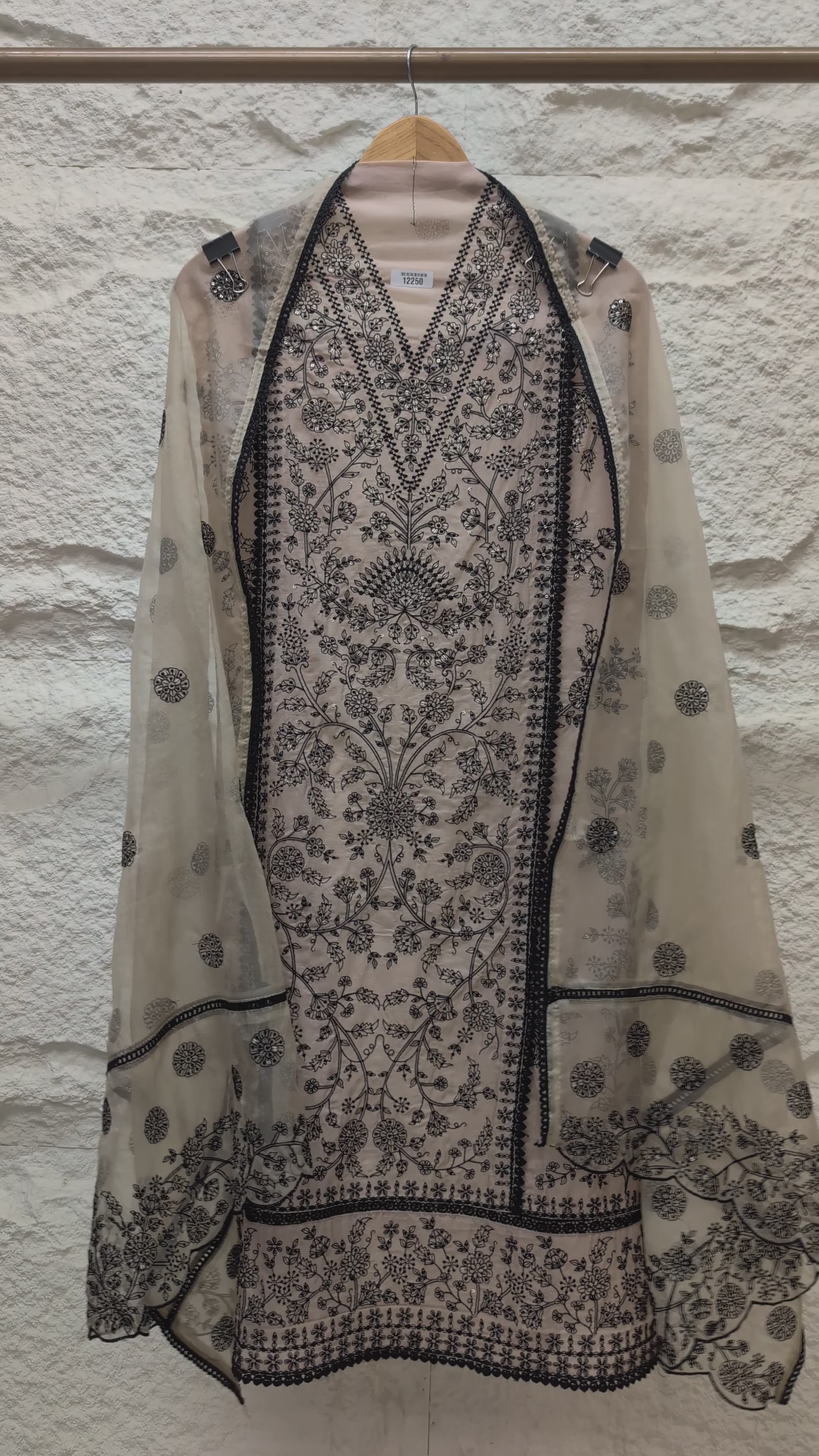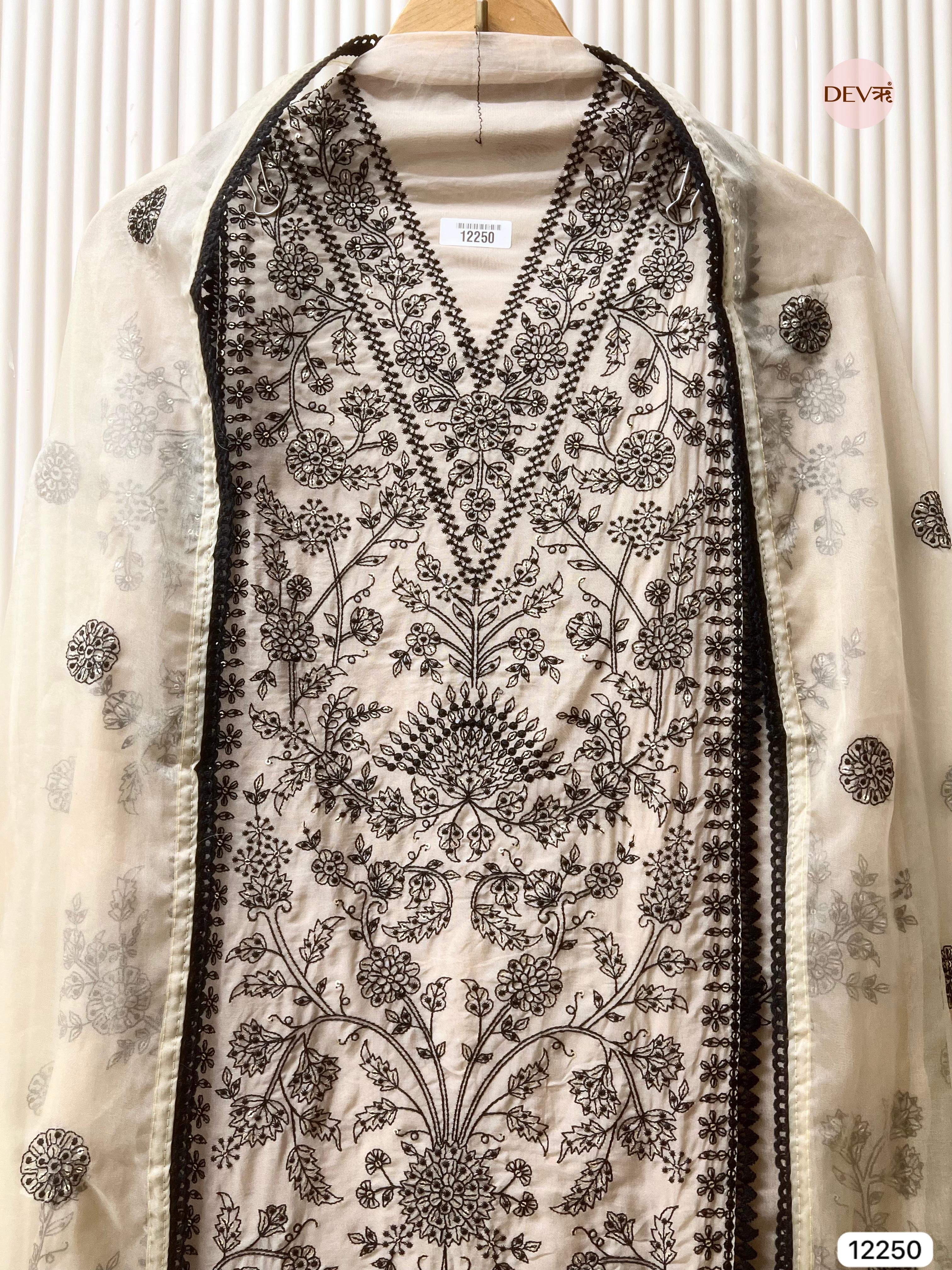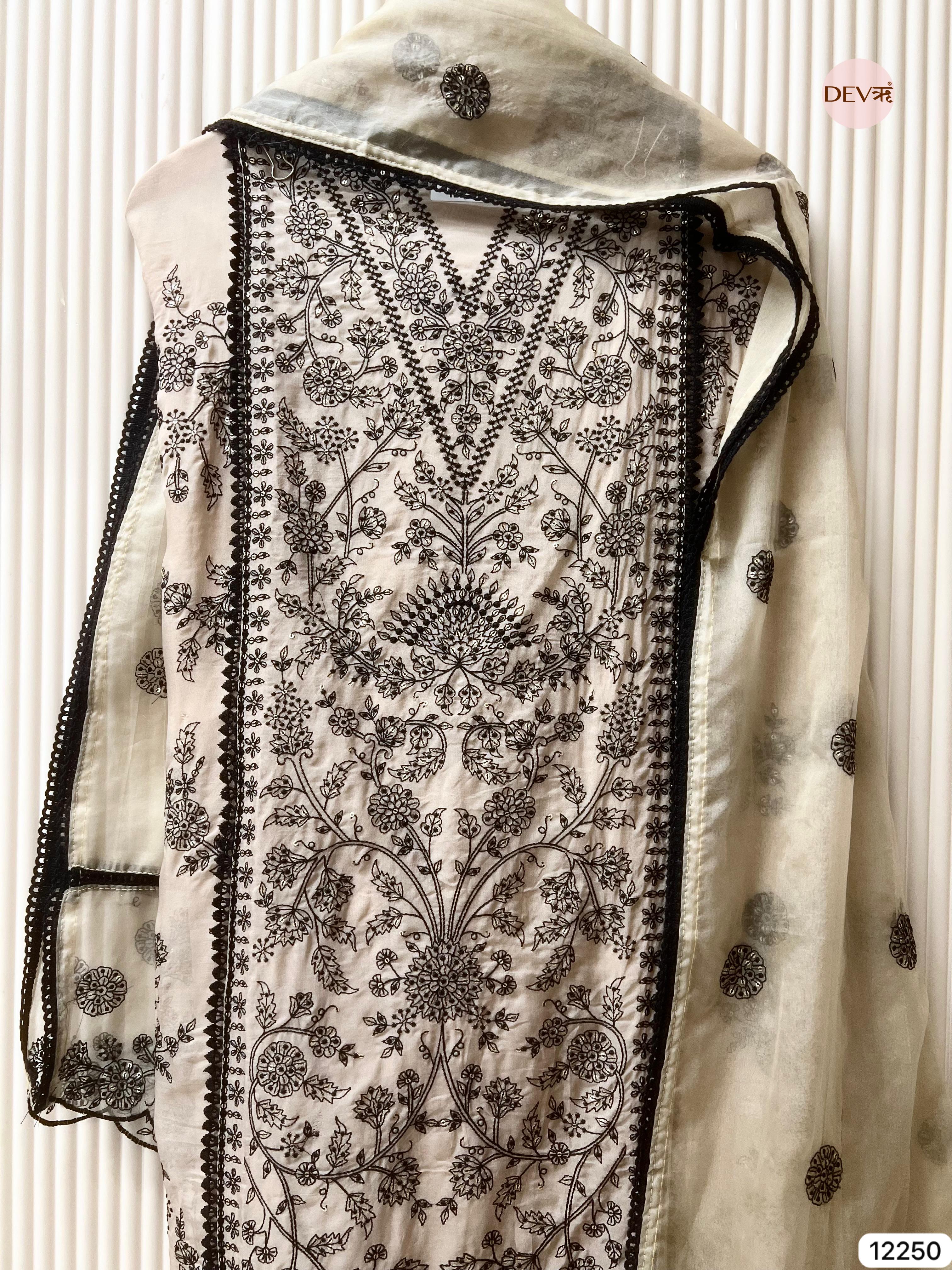 An elegant ivory suit crafted in pure organza, adorned with intricate black thread embroidery that creates a striking yet refined contrast. The delicate motifs flow seamlessly across the shirt, complemented by a soft organza dupatta featuring matching embroidered accents that enhance the set’s understated sophistication.