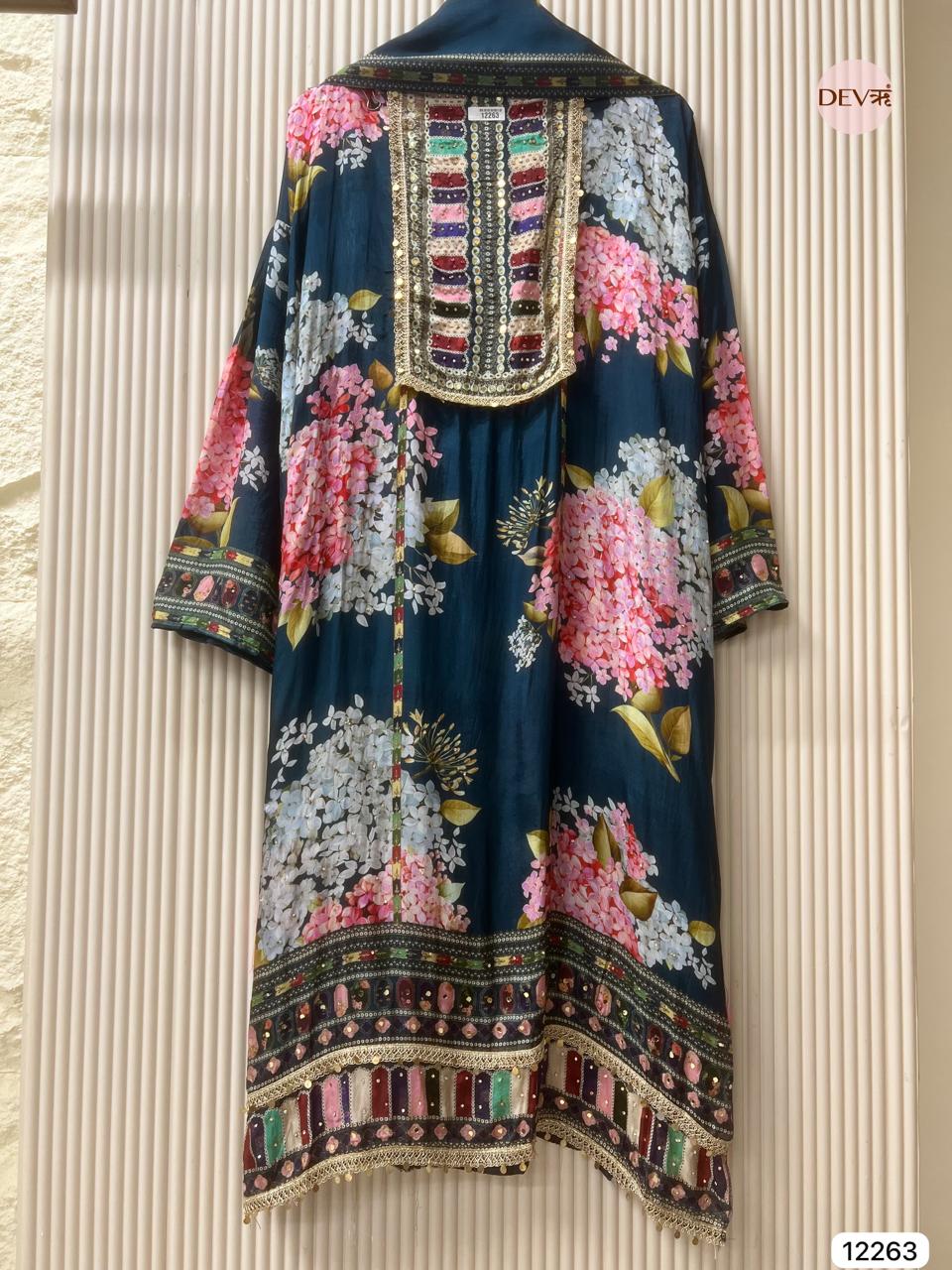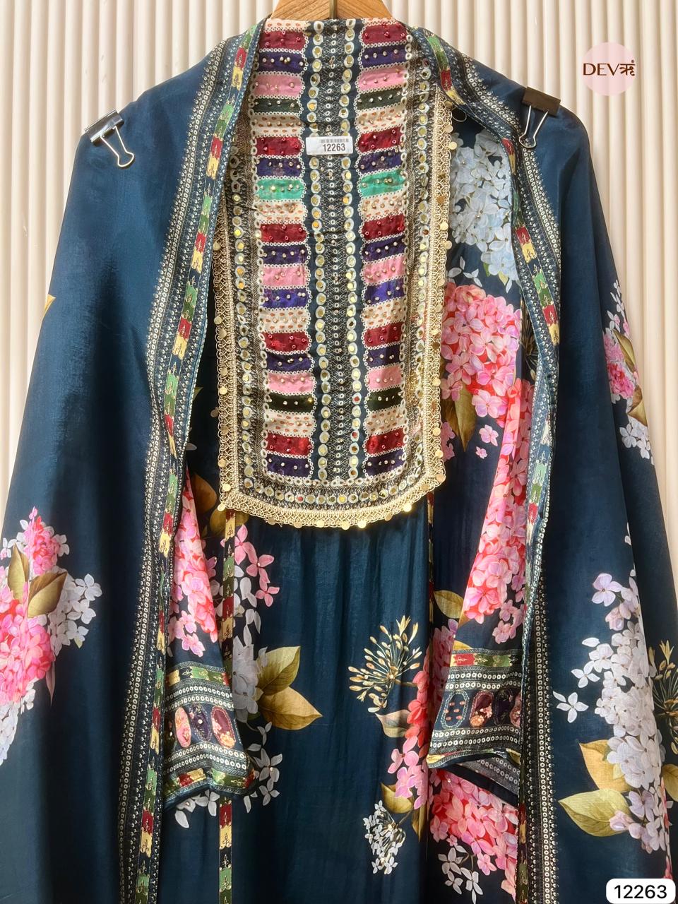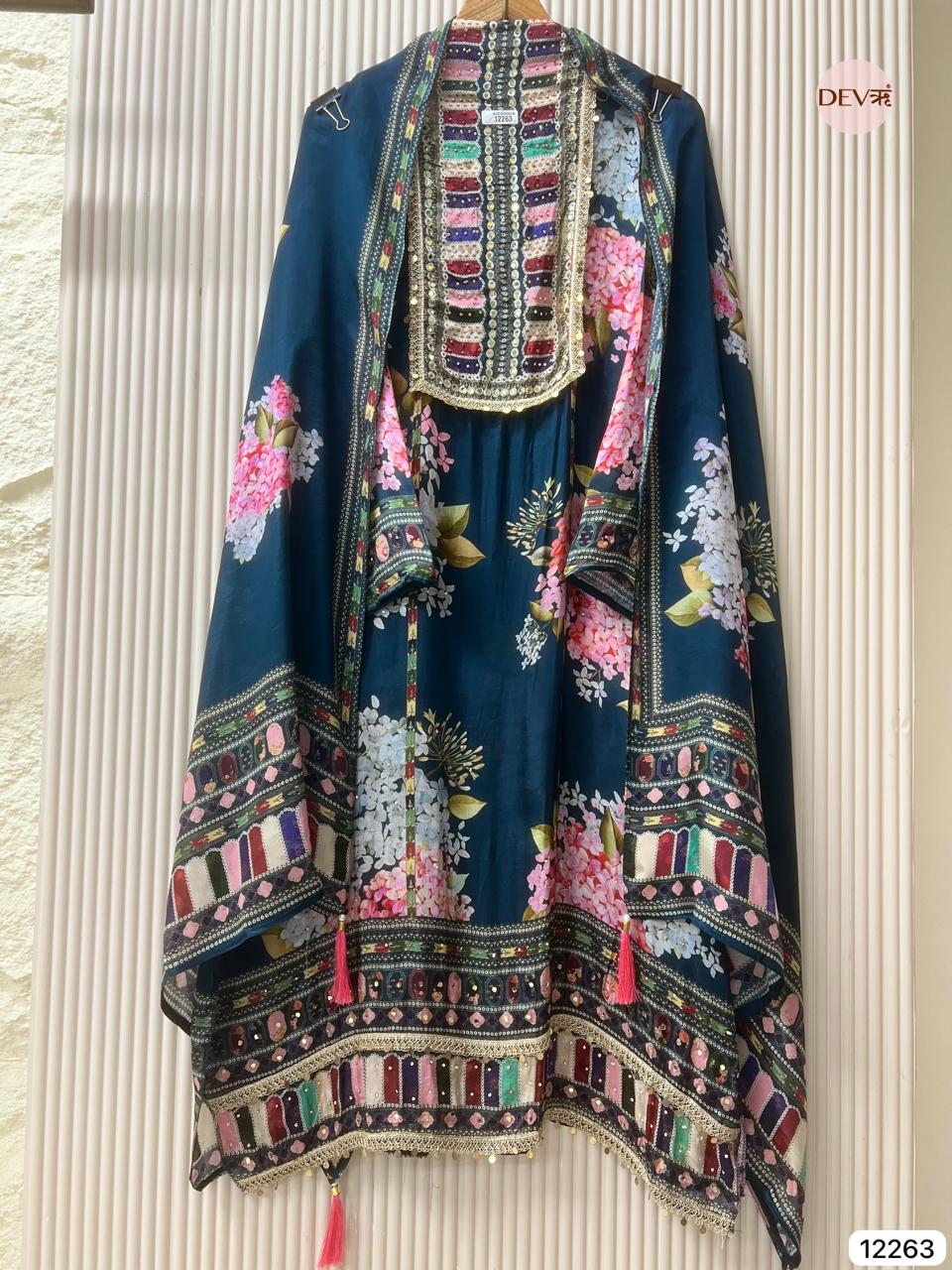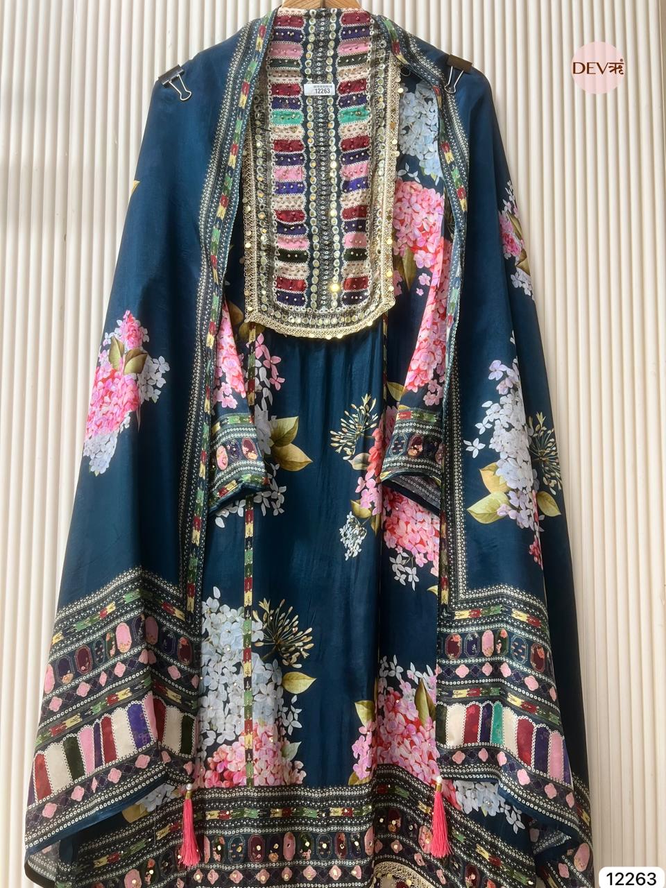 A rich teal glass organza base is adorned with vibrant floral prints and a detailed multicolour neckline that adds striking visual depth. The matching glass organza dupatta mirrors the same expressive palette and intricate borders, creating a lightweight, elegant ensemble with Devri’s refined, modern softness.