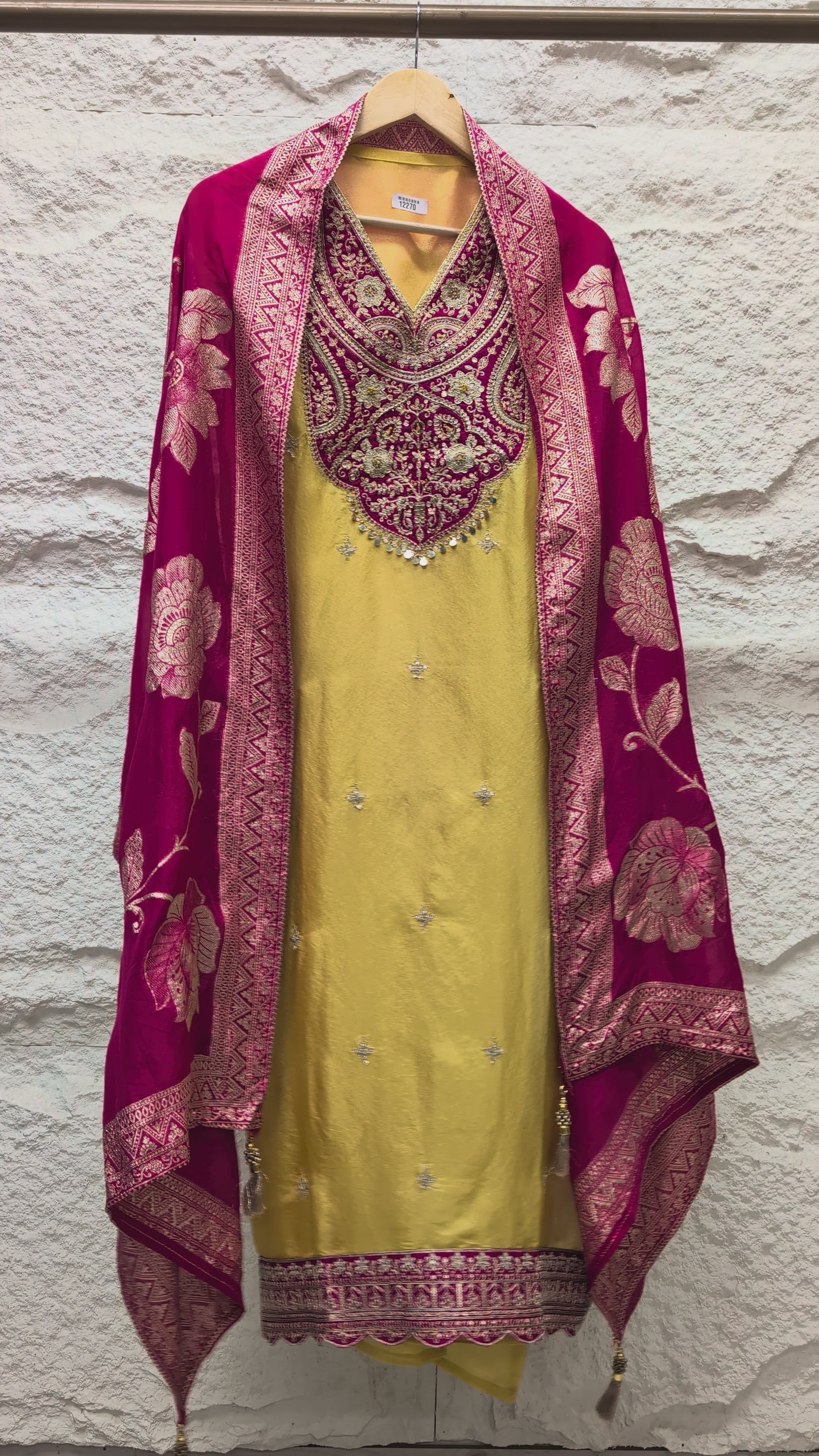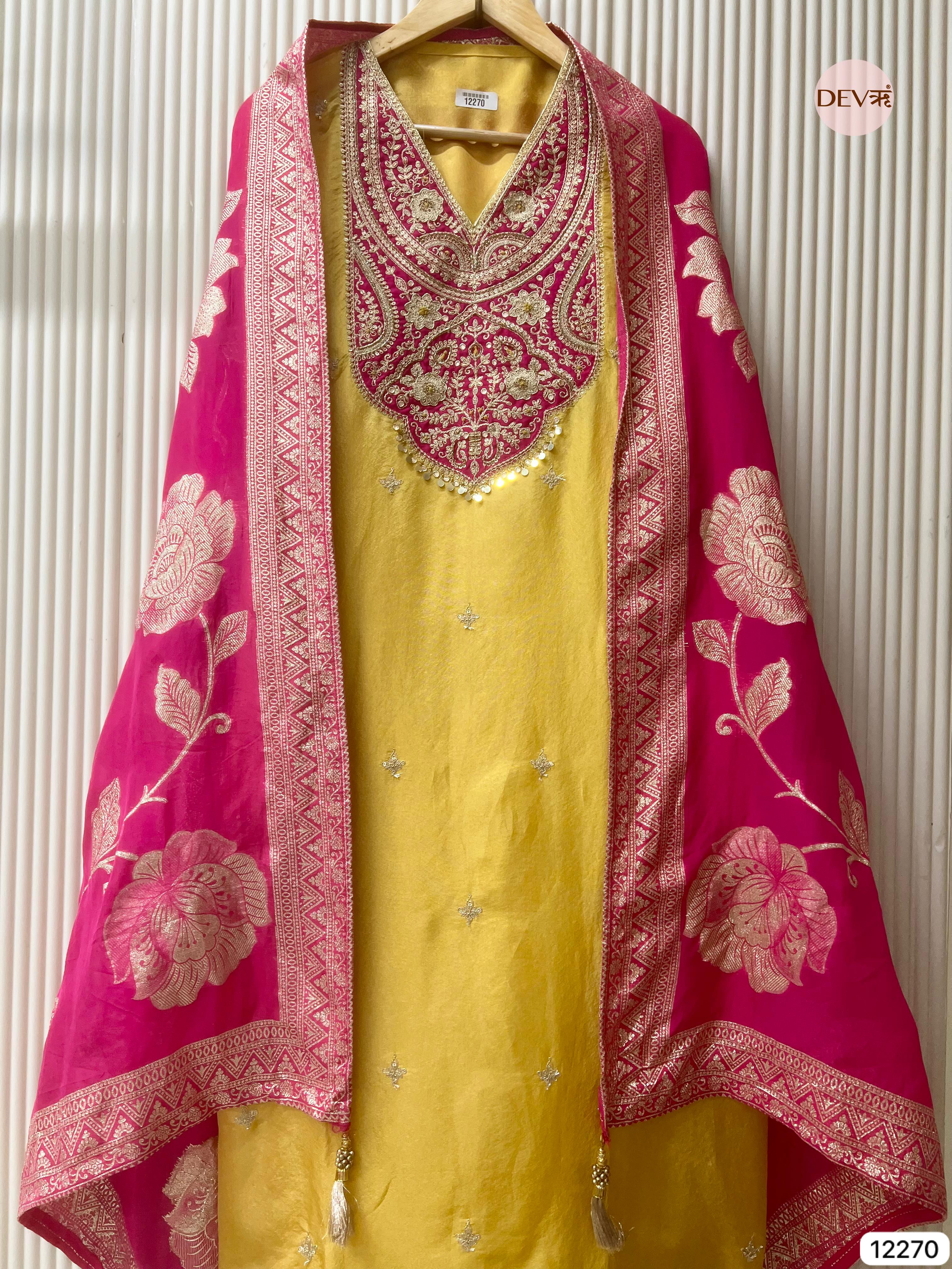 A radiant yellow shimmer silk shirt is paired with intricate pink embroidery that adds depth and elegance, beautifully complemented by a vibrant organza dupatta adorned with bold floral motifs. The textures and tones blend softly, creating a refined and festive look in true Devri style.