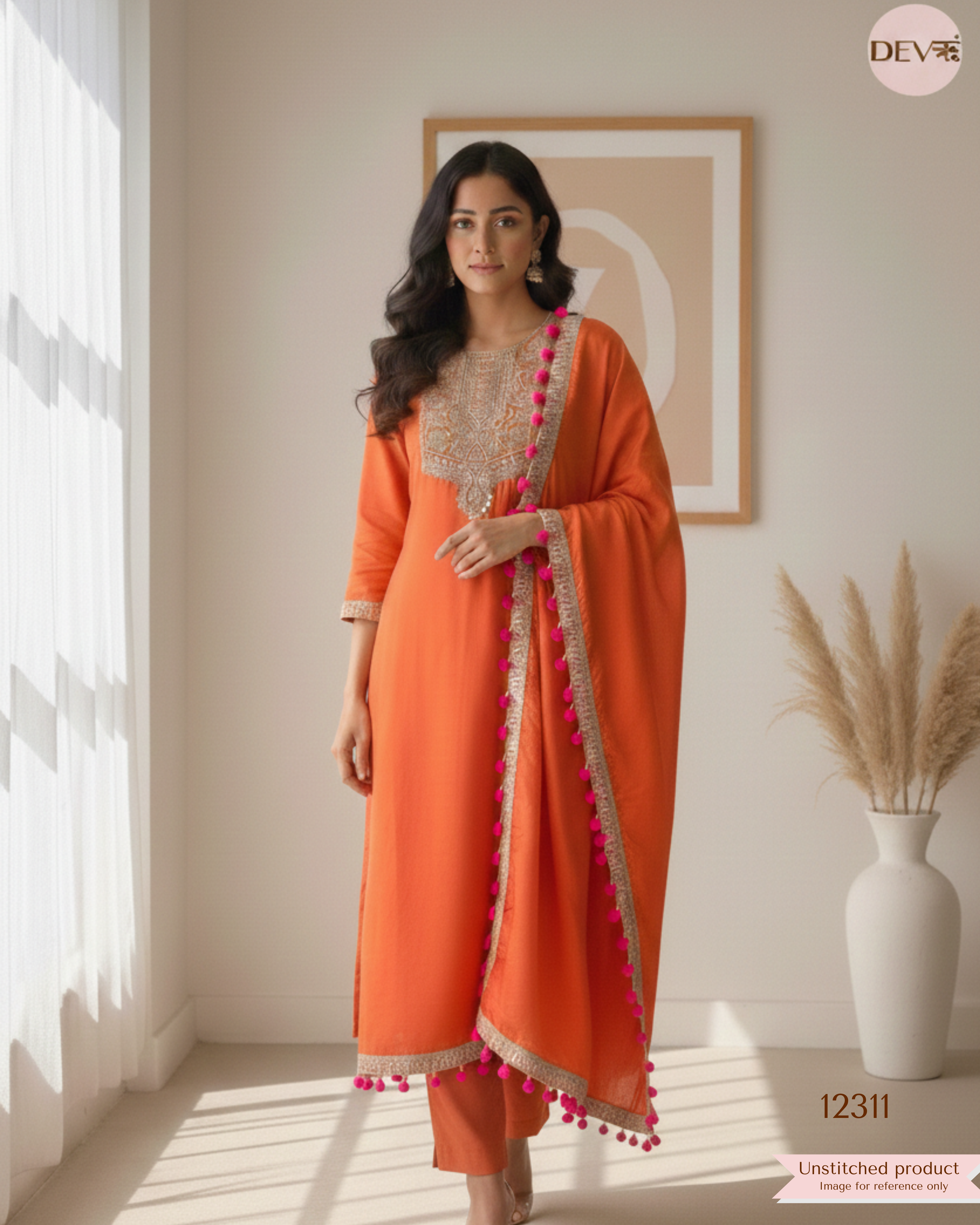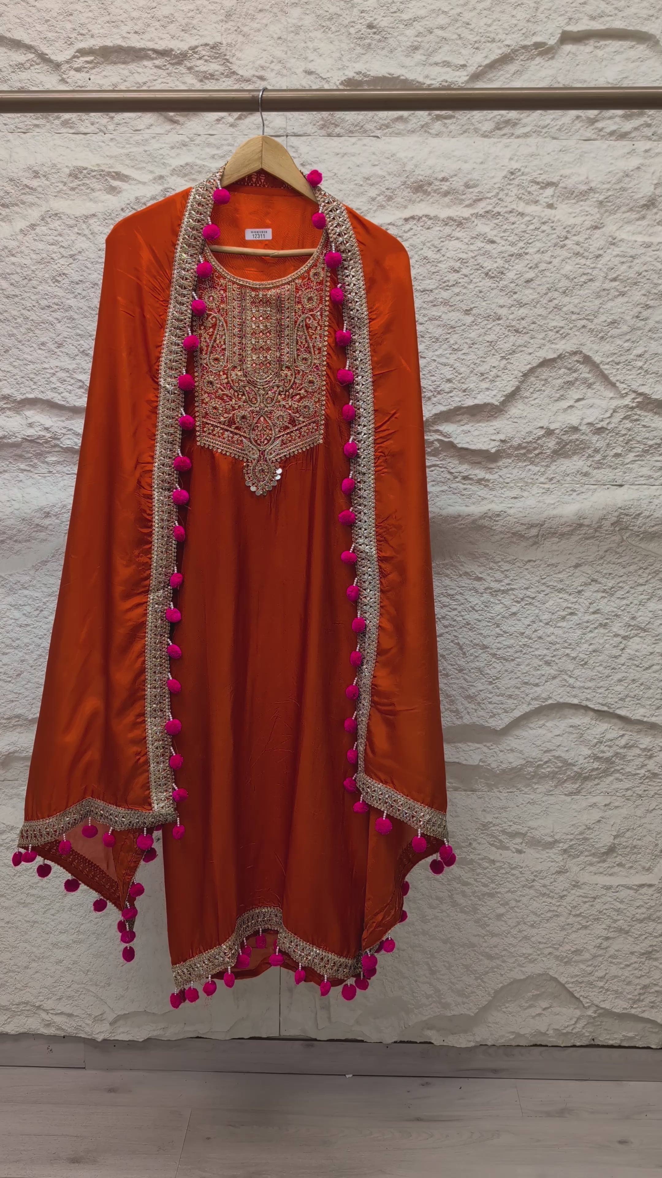 A striking orange suit in delicate glass organza, highlighted with intricate golden embroidery that brings a refined festive glow. The lustrous fabric catches the light beautifully, while the coordinated dupatta with ornate lace and vibrant pink tassels adds a rich, celebratory finish.