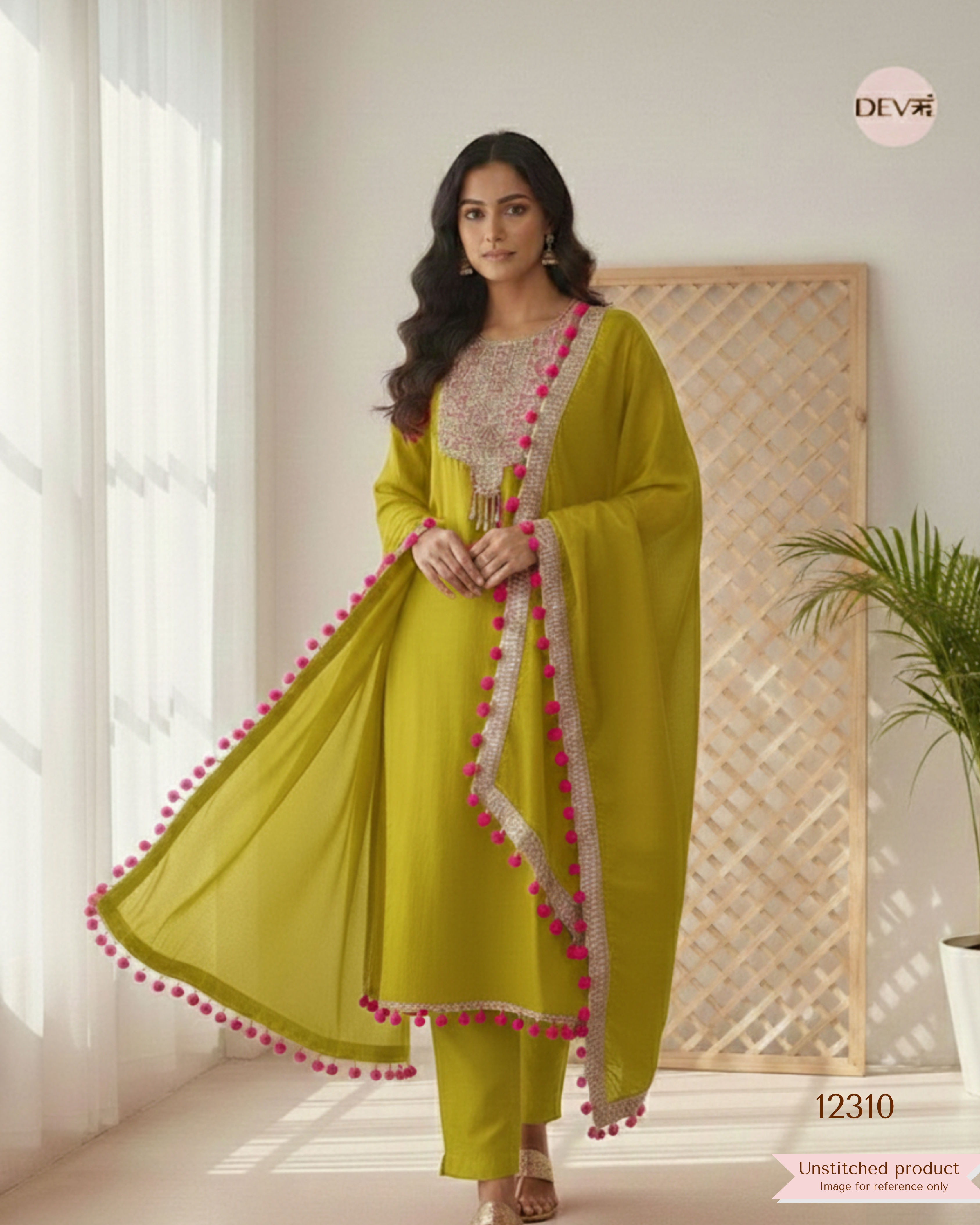 Lime Green Glass Organza Embroidered Unstitched 3-Piece Suit (Devri – D.No 12310)