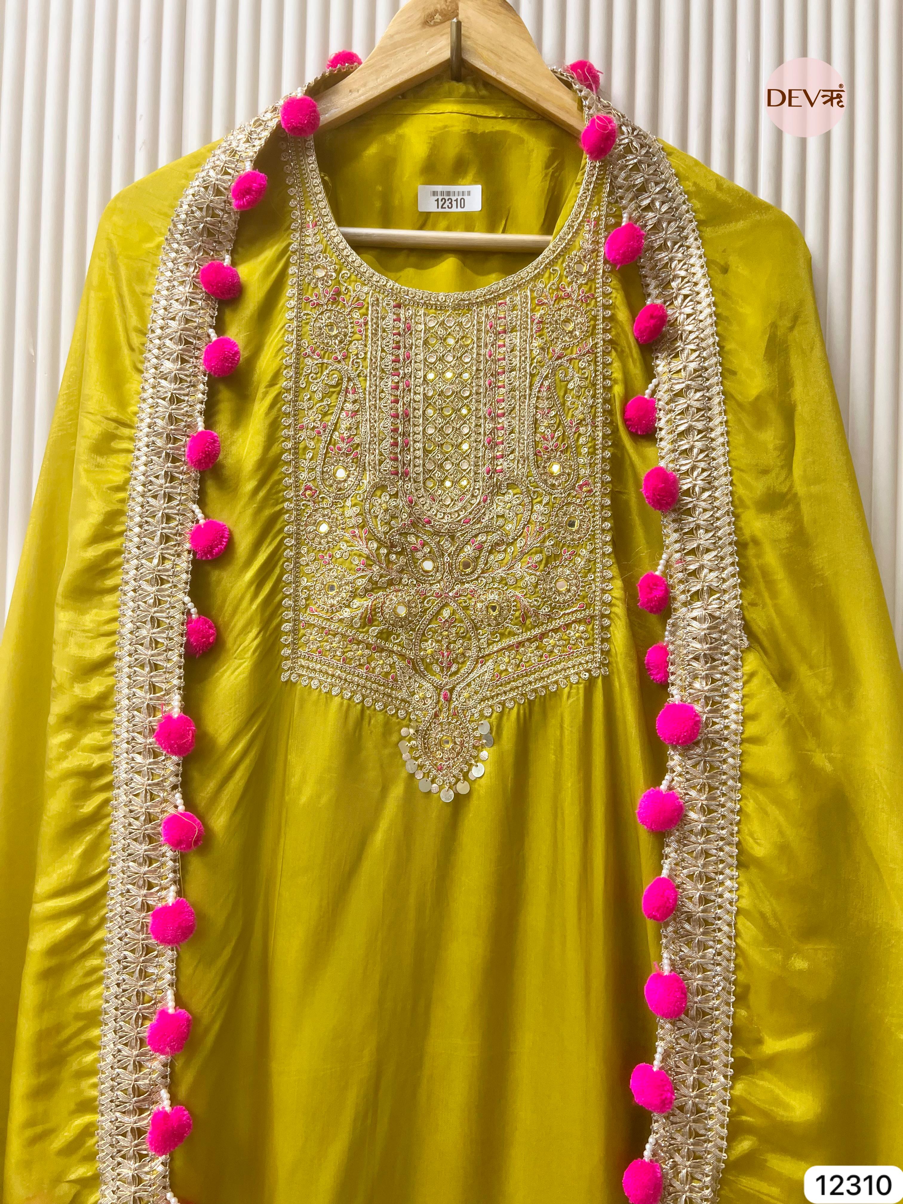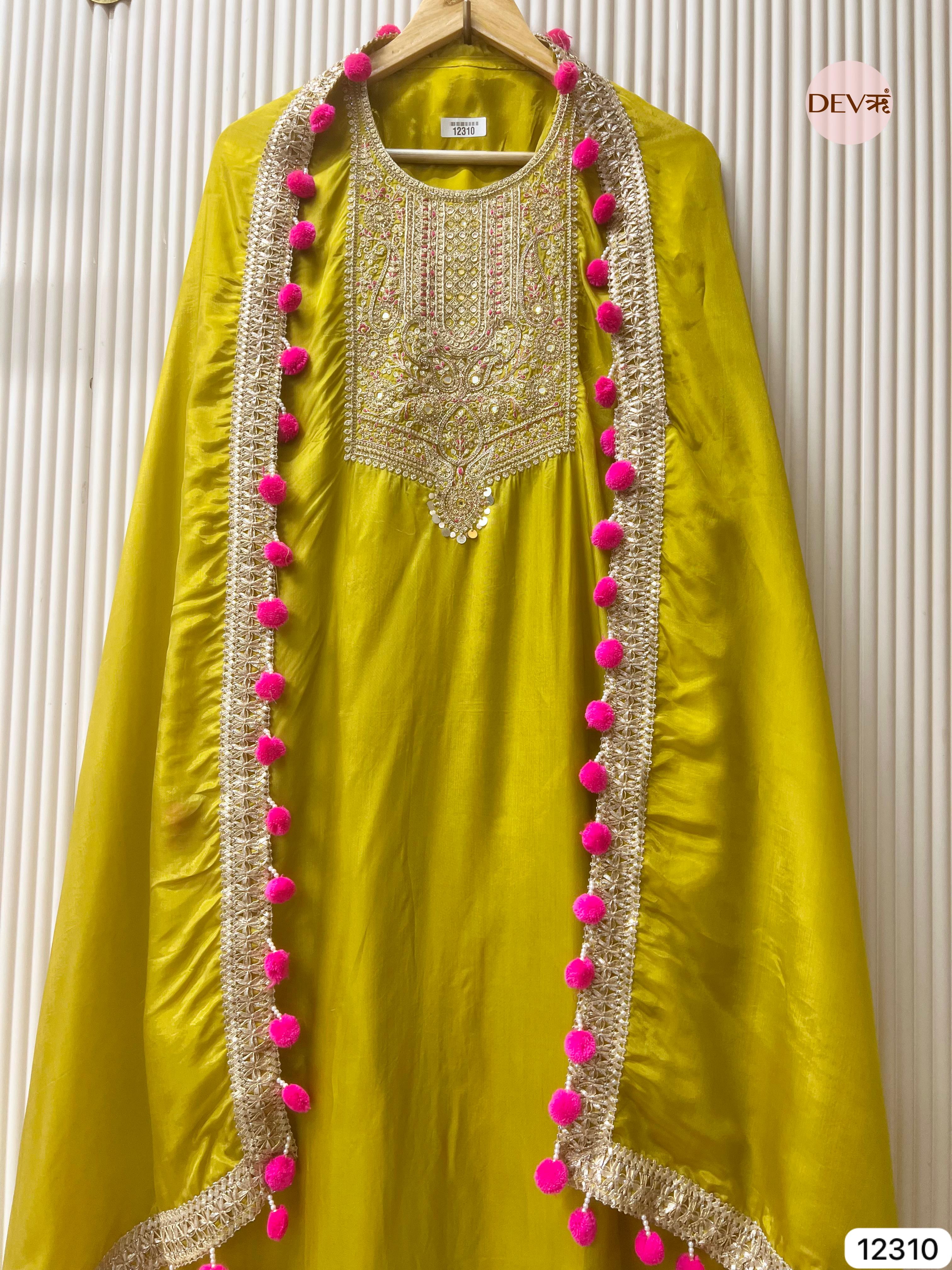 A luminous lime green suit crafted in sheer glass organza, elevated with intricate golden embroidery that adds refined depth and festive radiance. The lightweight fabric drapes gracefully, while the matching dupatta—finished with lace borders and vibrant pink tassels—brings a playful yet elegant contrast.