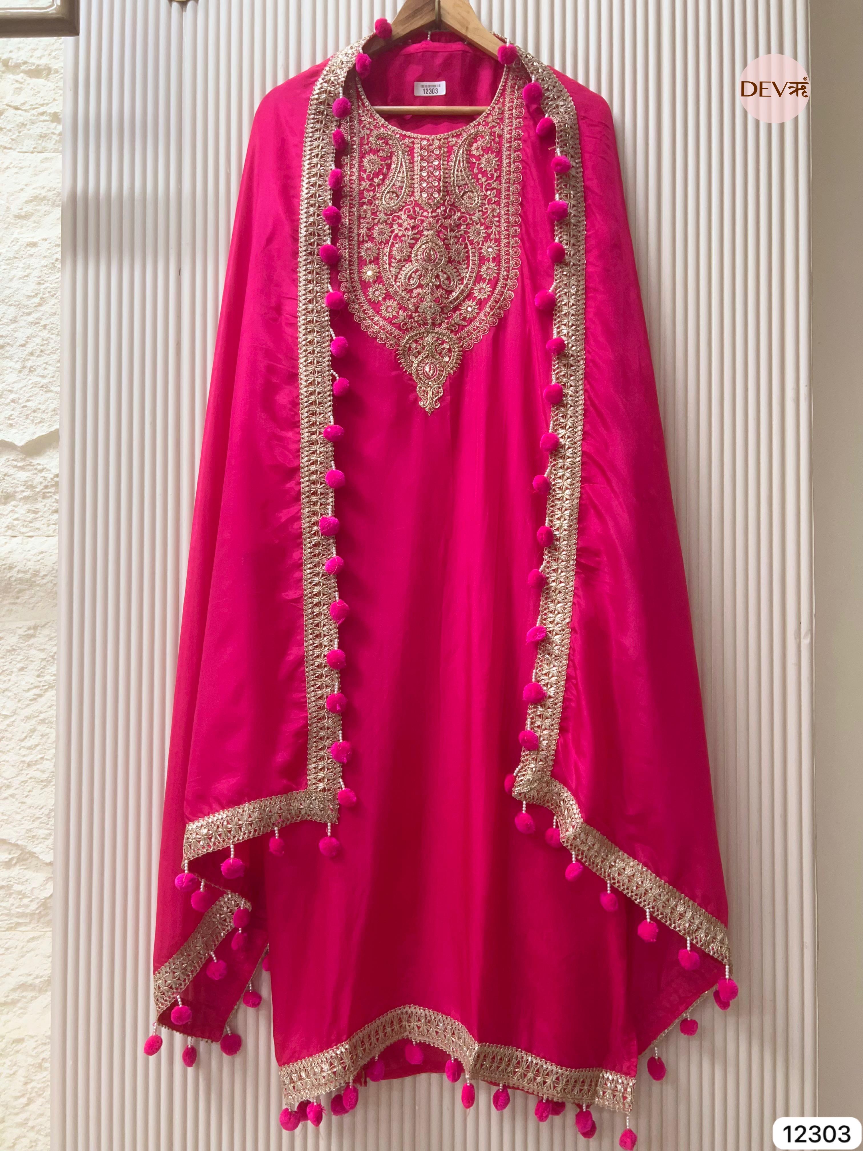 A striking rani pink suit crafted in lustrous glass organza, featuring intricate golden embroidery that enhances its rich, vibrant tone. The fabric’s soft sheen and refined detailing bring an elegant balance of festivity and sophistication characteristic of Devri’s signature aesthetic.