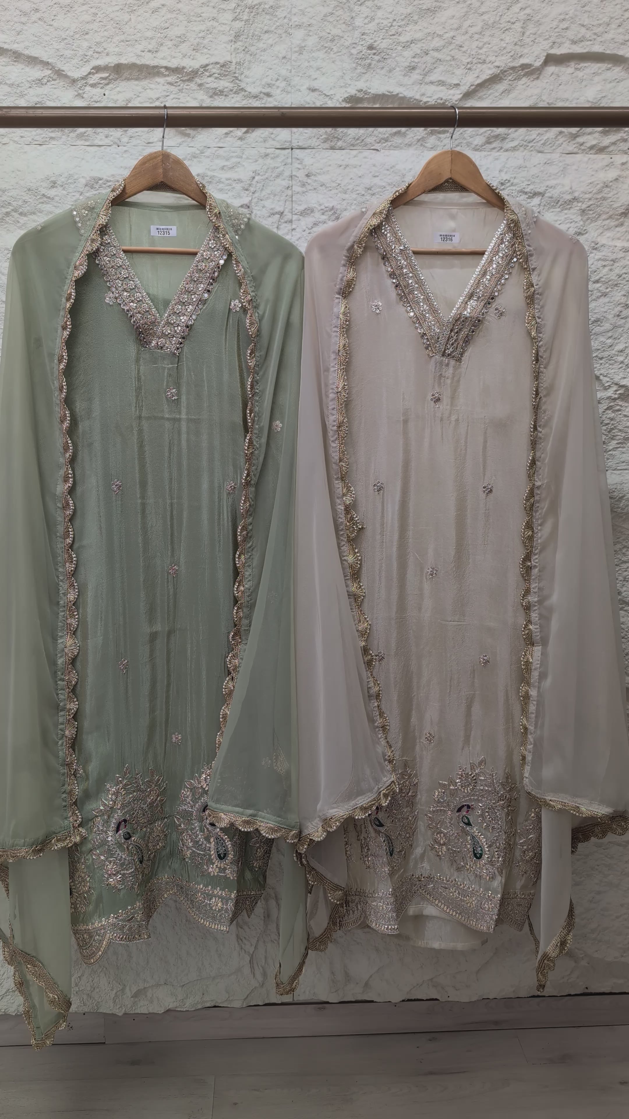 A timeless ivory palette brings understated elegance to this shimmer silk unstitched suit, detailed with delicate embroidery that softly enhances the fabric’s natural sheen for a refined, graceful finish.