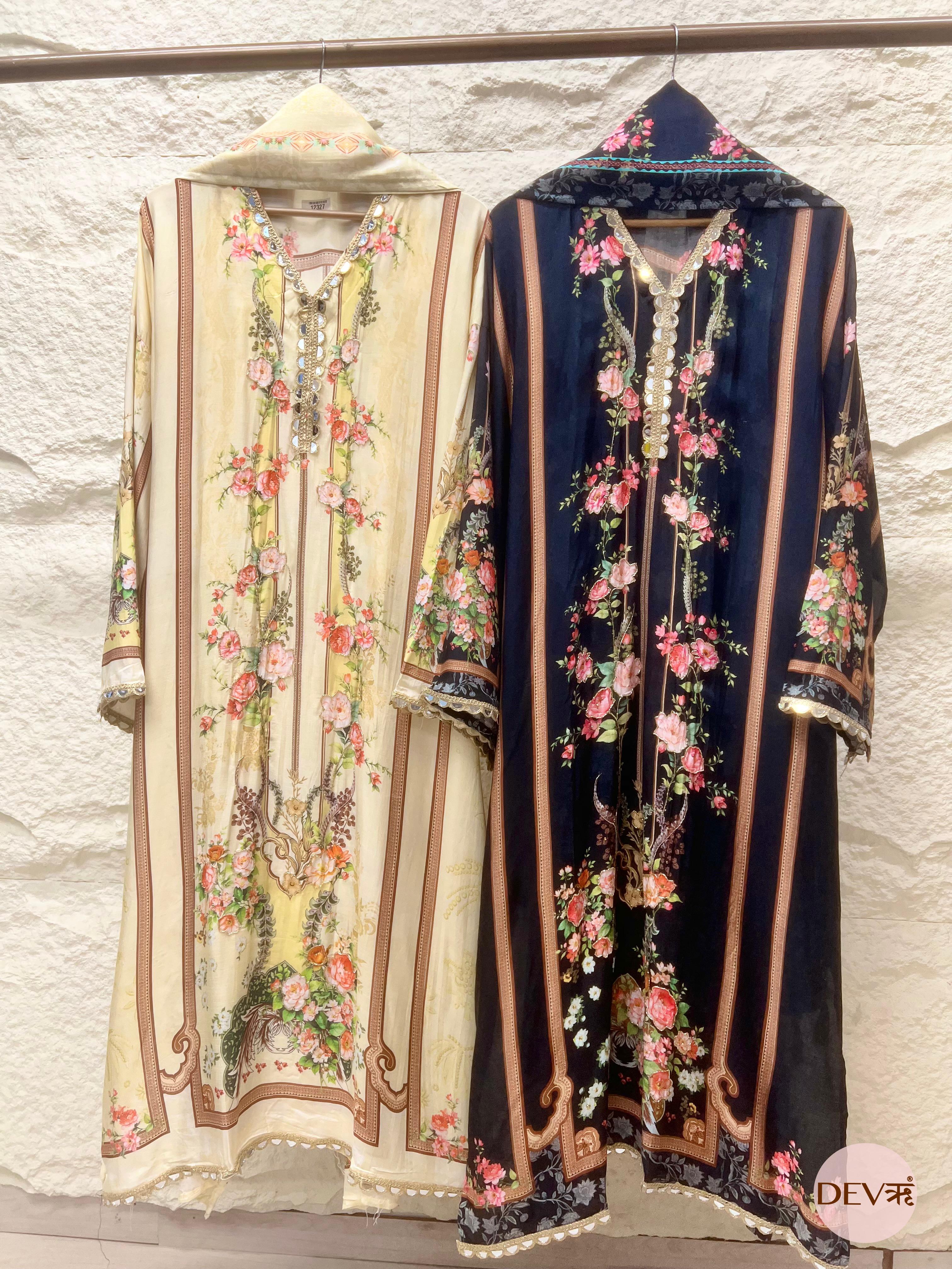 A deep navy base lends depth and elegance to this muslin unstitched suit, enriched with intricate floral prints and refined detailing that create a striking yet graceful visual balance.