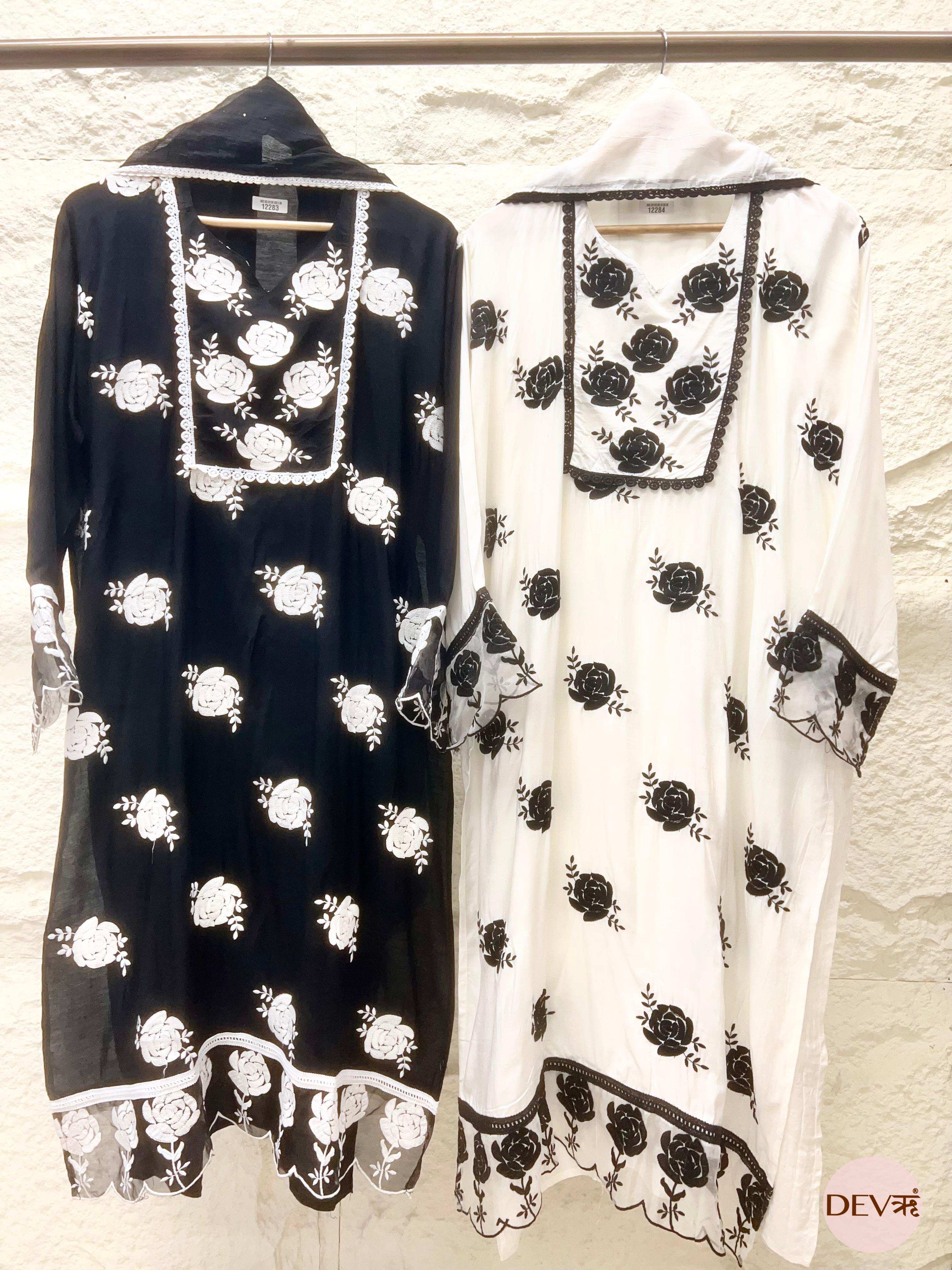 An elegant ivory base defines this muslin unstitched suit, accented with bold black embroidery that creates a refined contrast and lends the ensemble a clean, contemporary appeal.