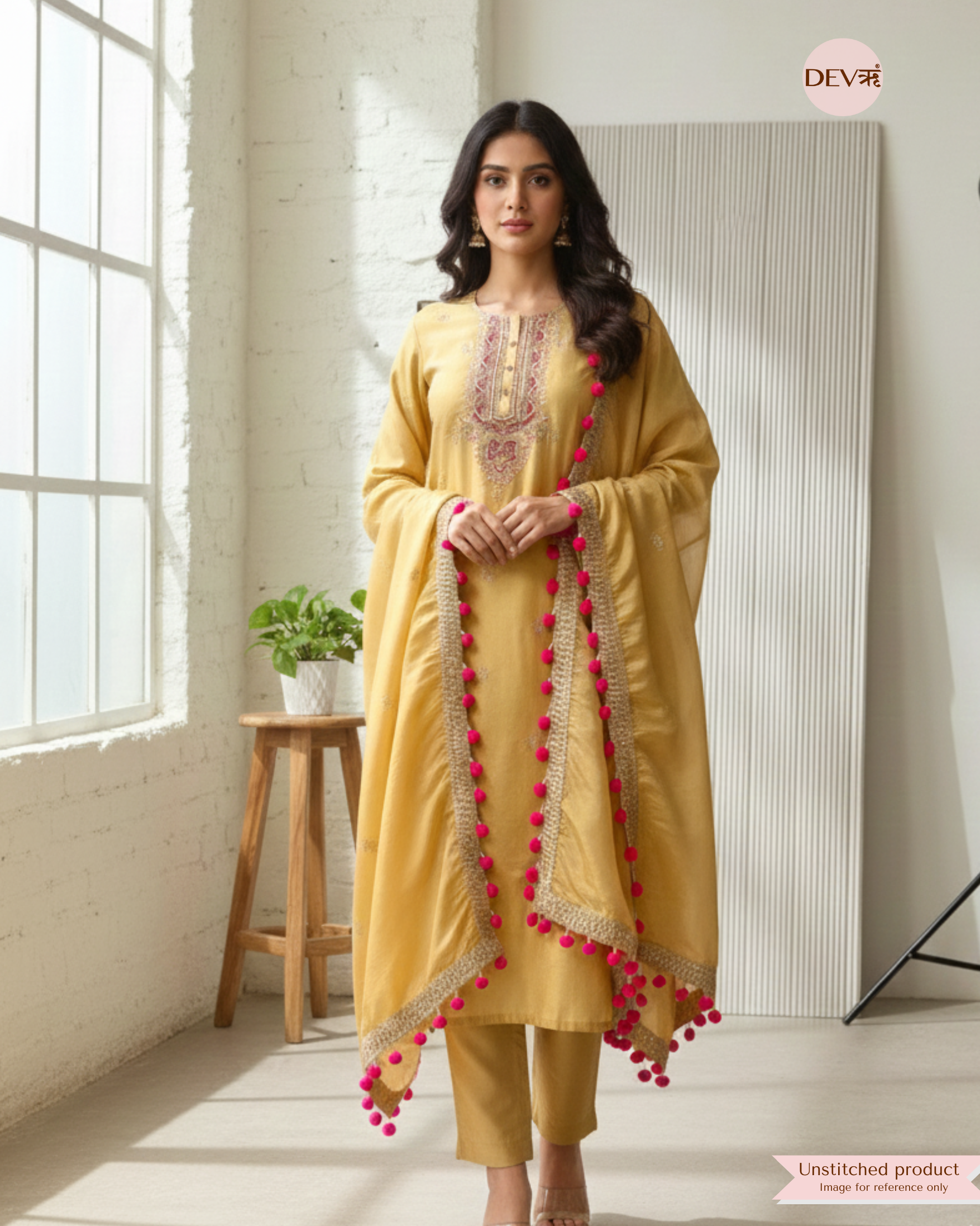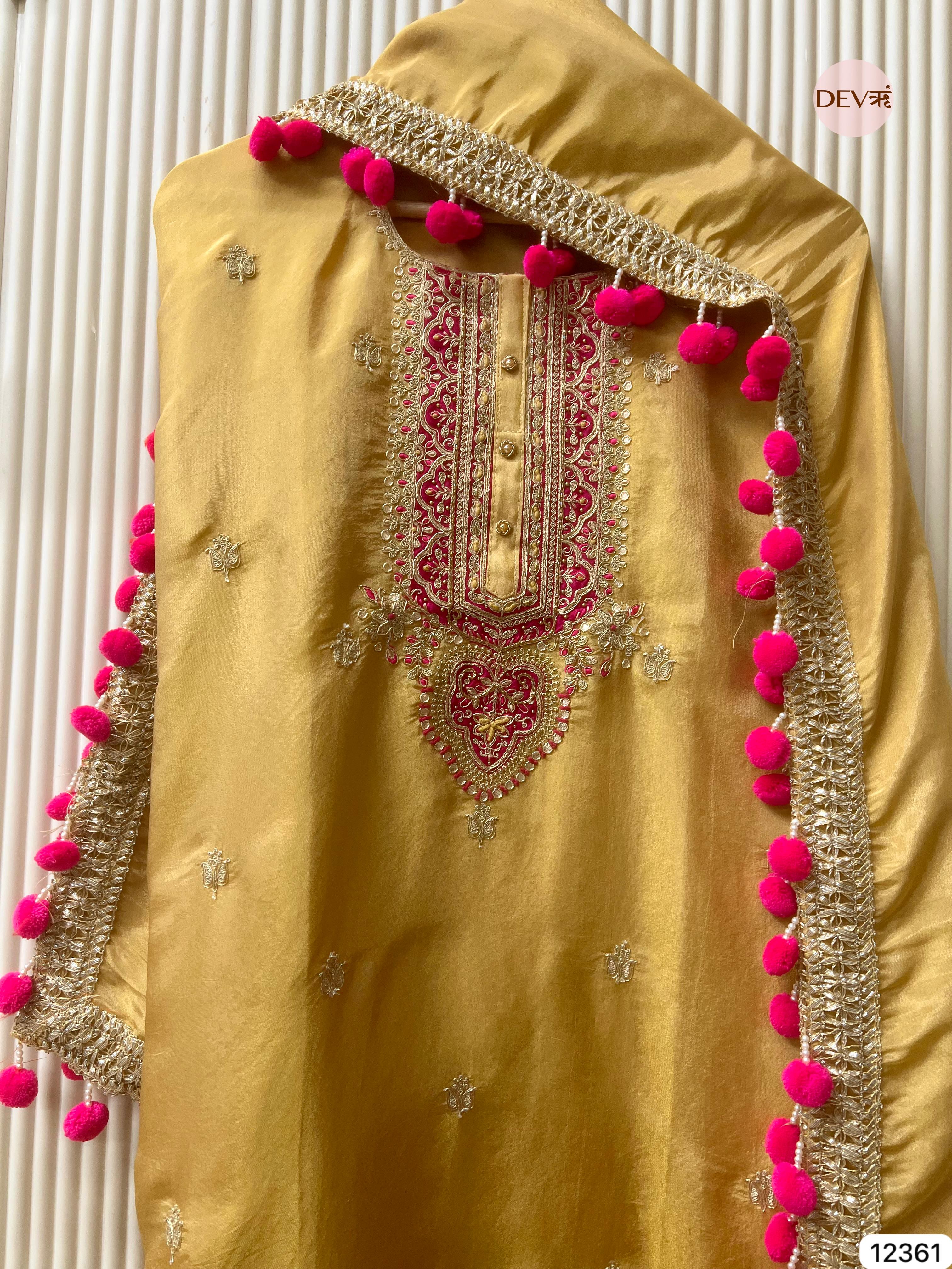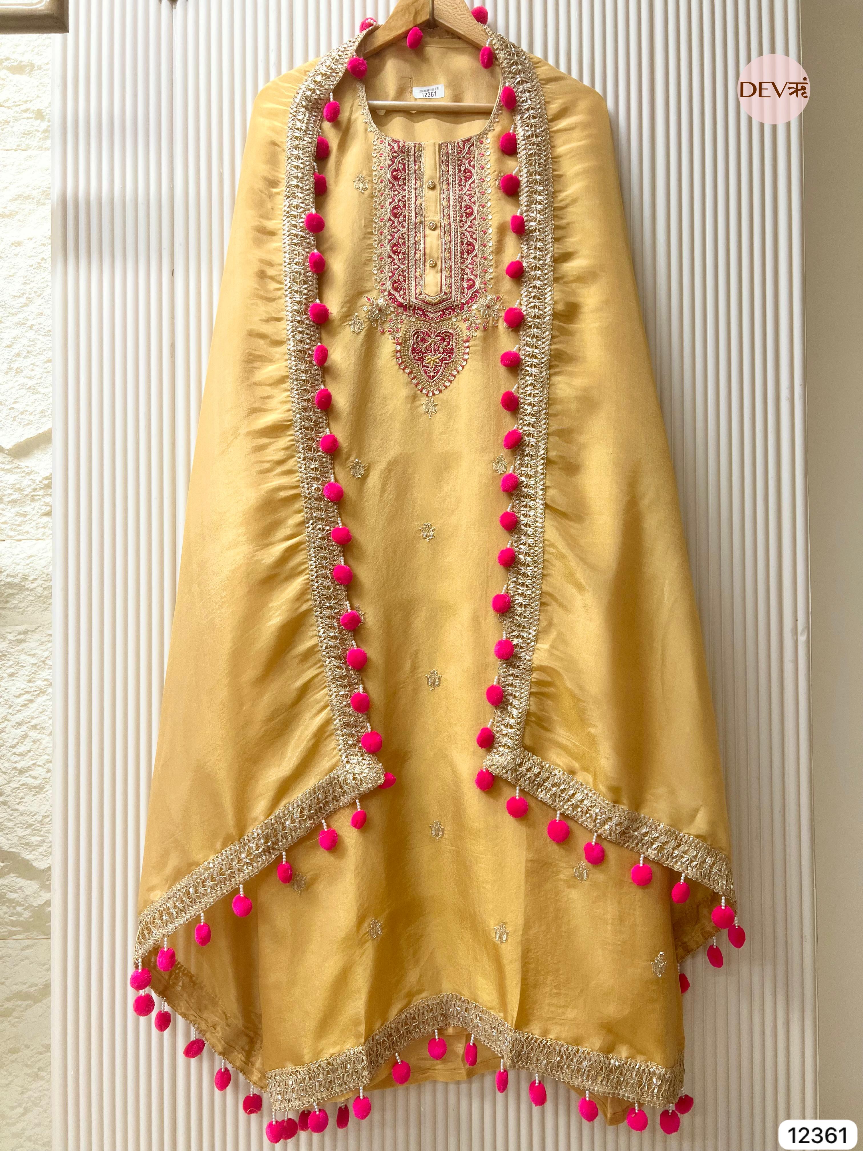 A rich mustard unstitched suit crafted in luminous shimmer silk, highlighted with intricate hand embroidery along the neckline for a regal yet refined look. The matching shimmer silk dupatta is finished with ornate borders and playful tassel detailing, creating a balanced blend of elegance and festive charm in Devri’s signature aesthetic.