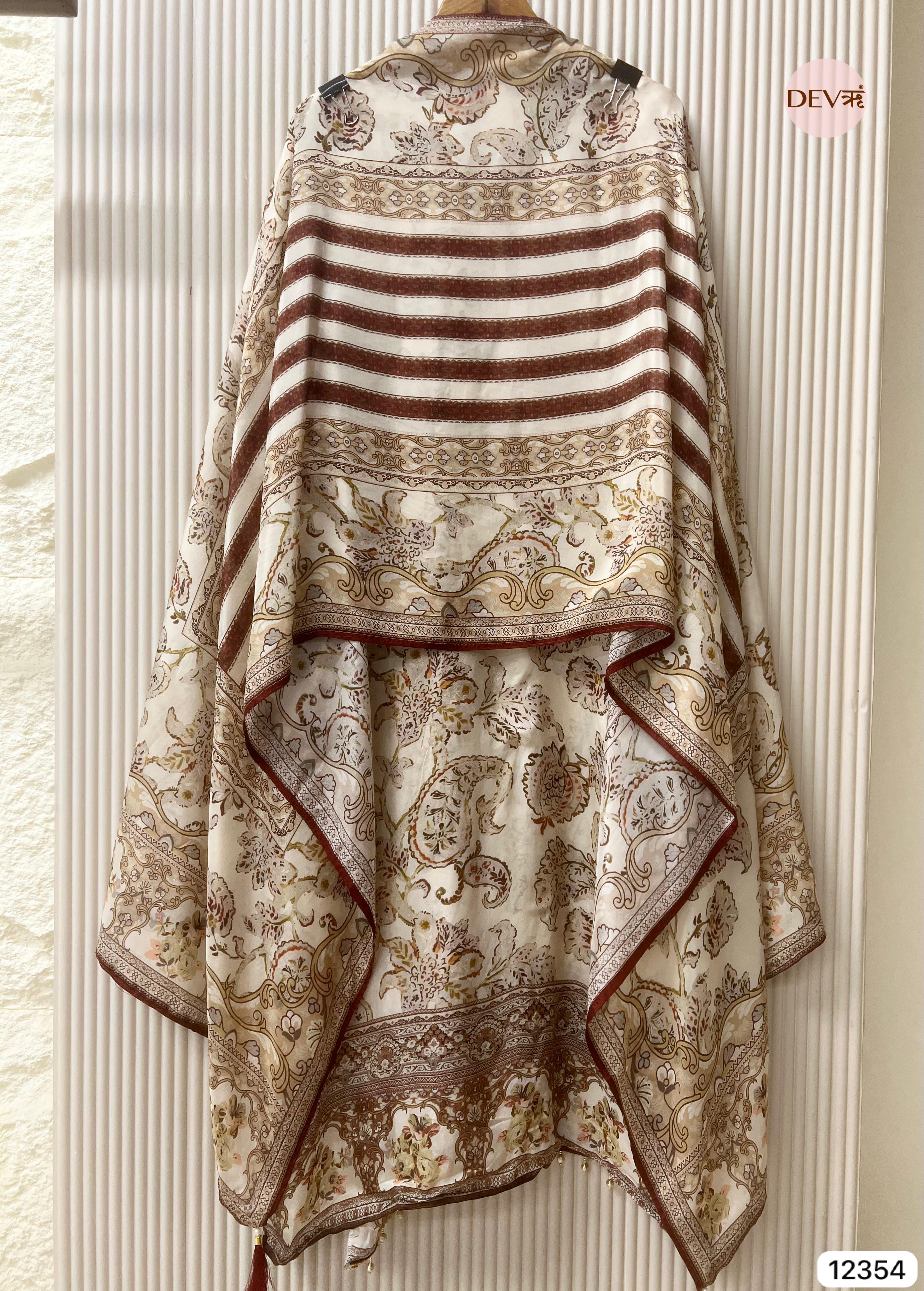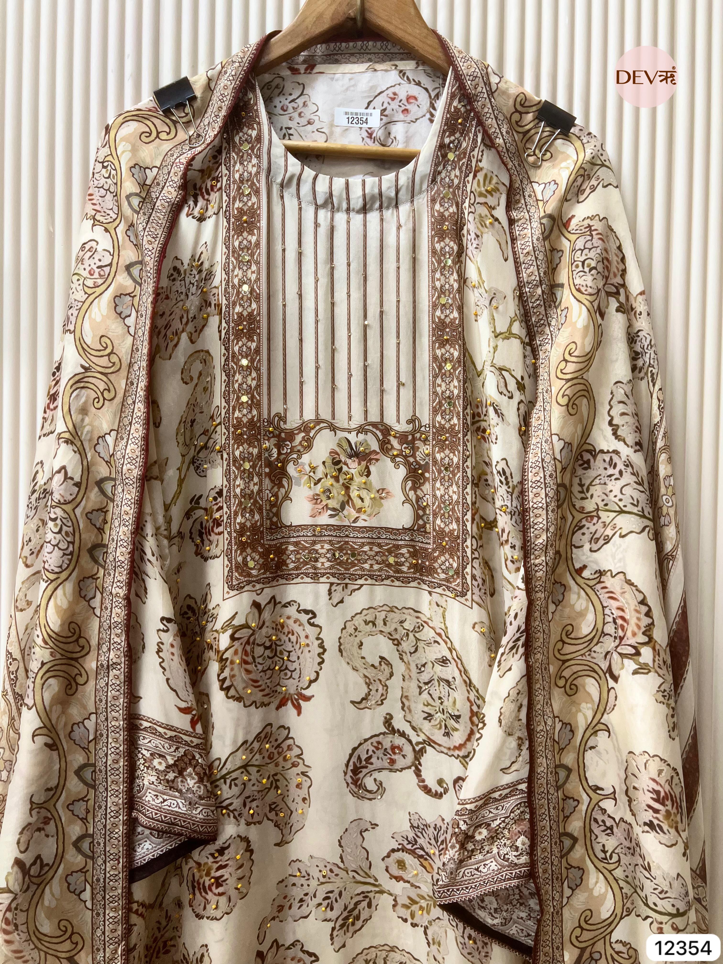An ivory organza silk ensemble adorned with refined printed motifs and delicate accent detailing. The sheer, lightweight texture lends an airy elegance, while the ornate borders and subtle highlights create a balanced composition that feels graceful and timeless in Devri’s understated aesthetic.