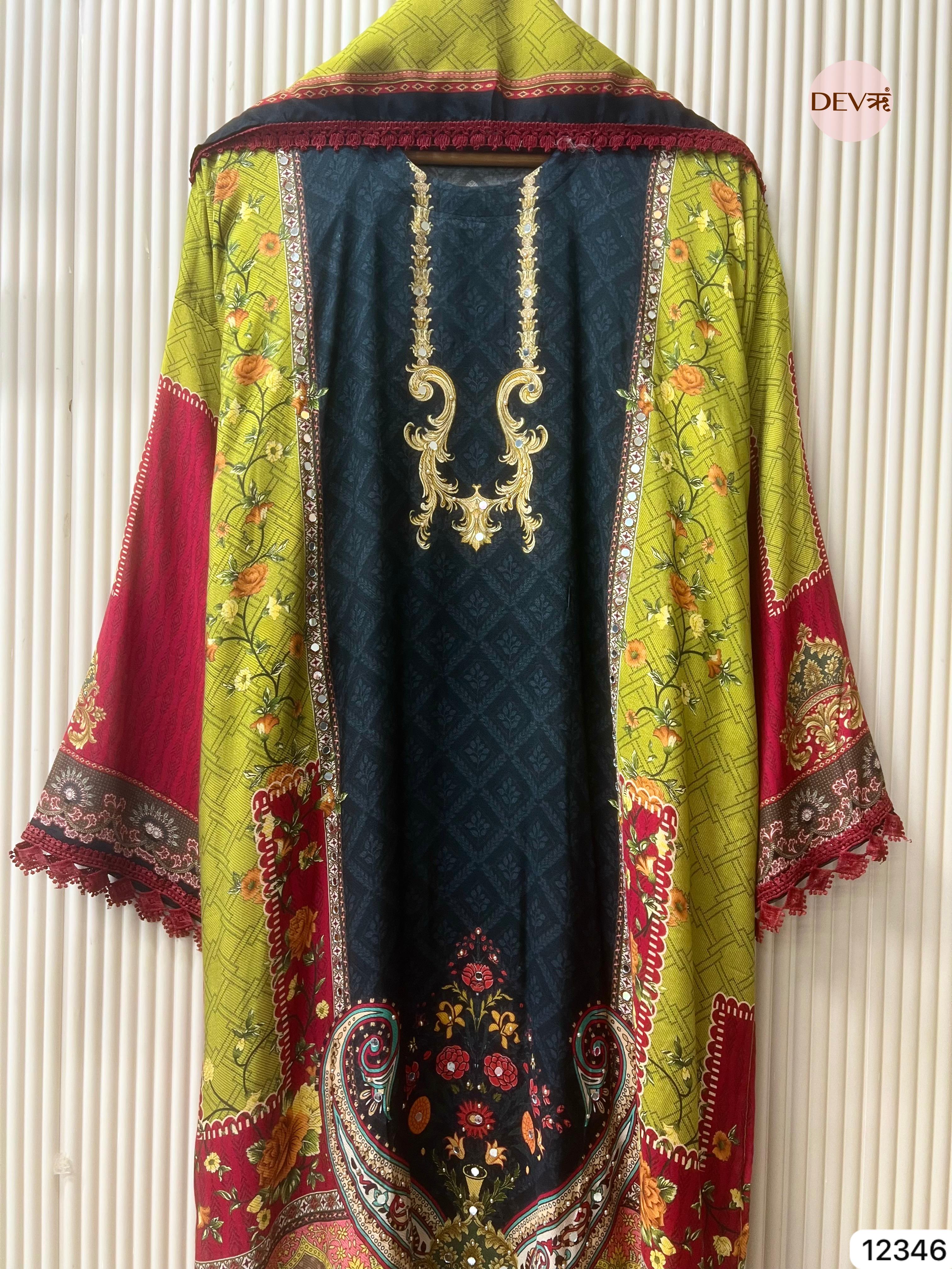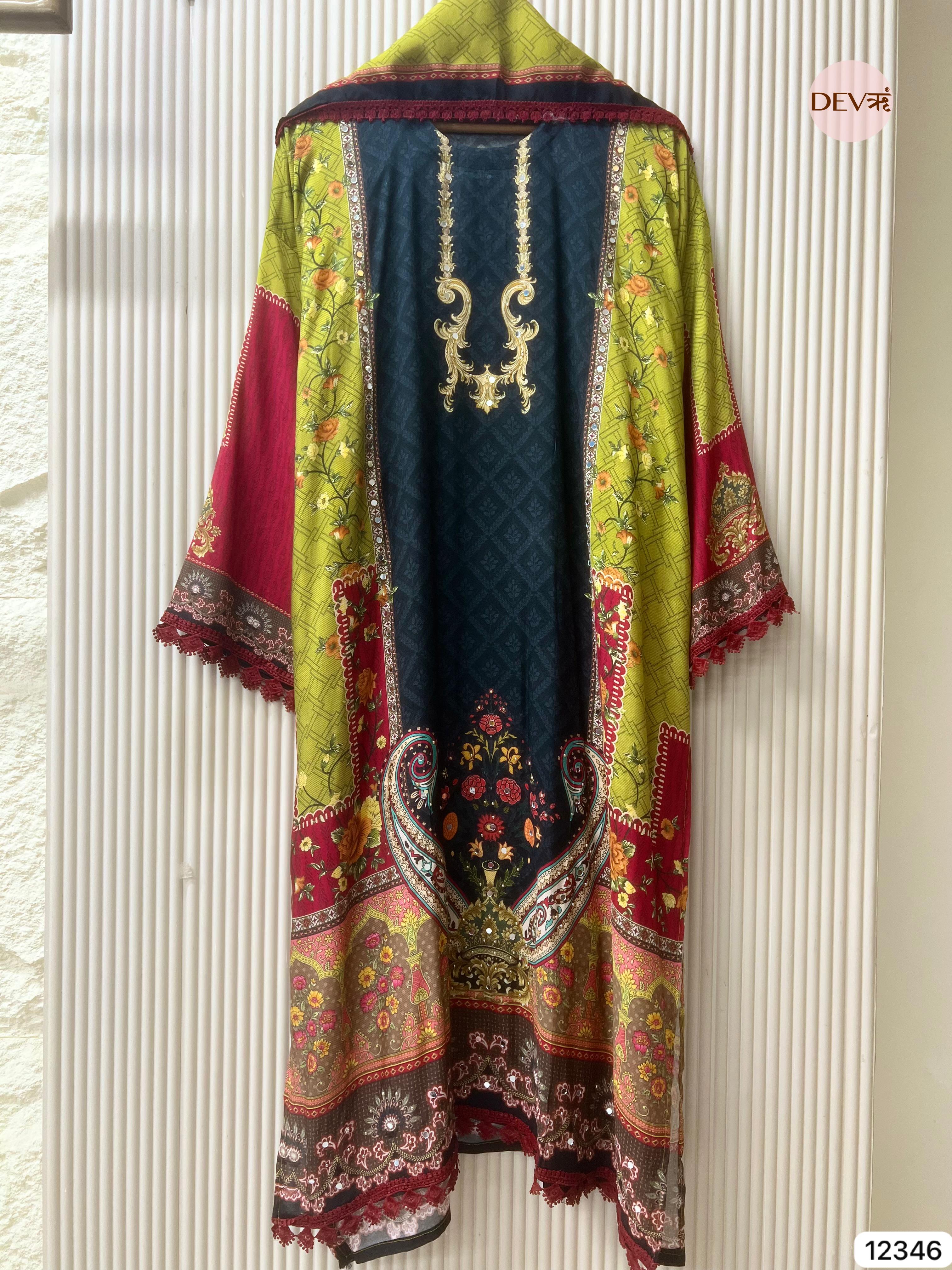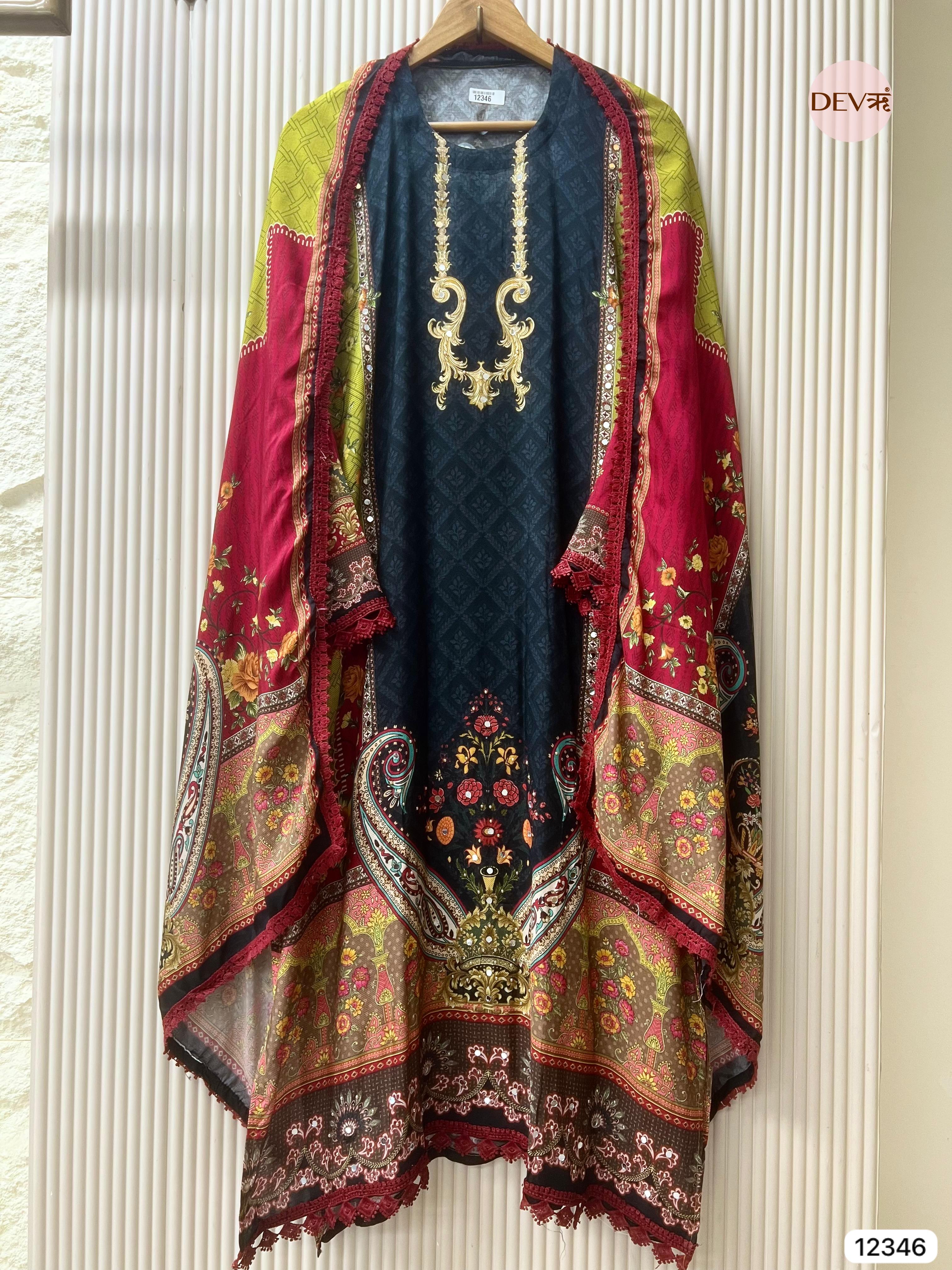 A richly composed deep teal muslin suit set adorned with intricate prints and ornate neckline embroidery. The contrast muslin dupatta features layered motifs and detailed borders, bringing depth and character while maintaining Devri’s refined, elegant appeal.