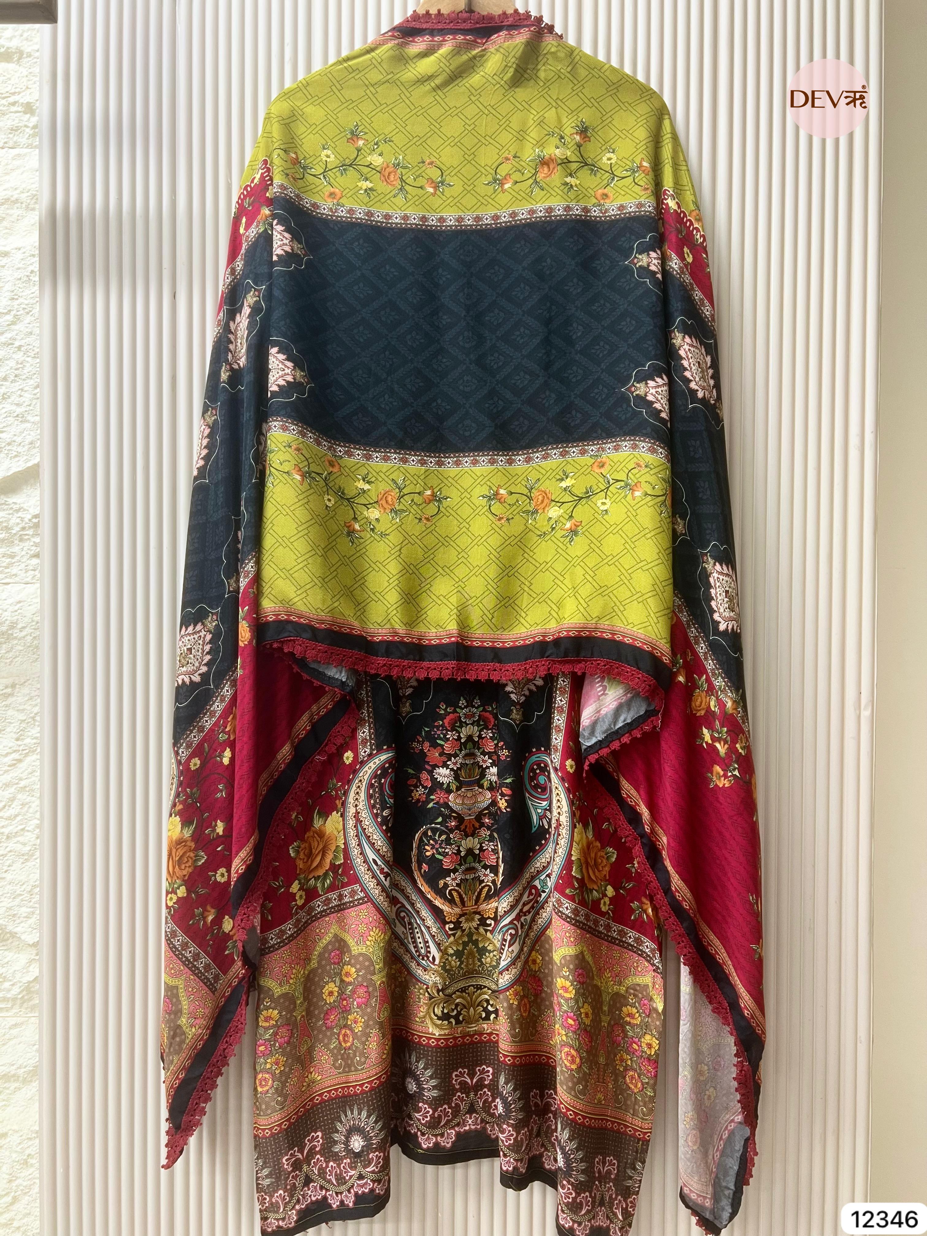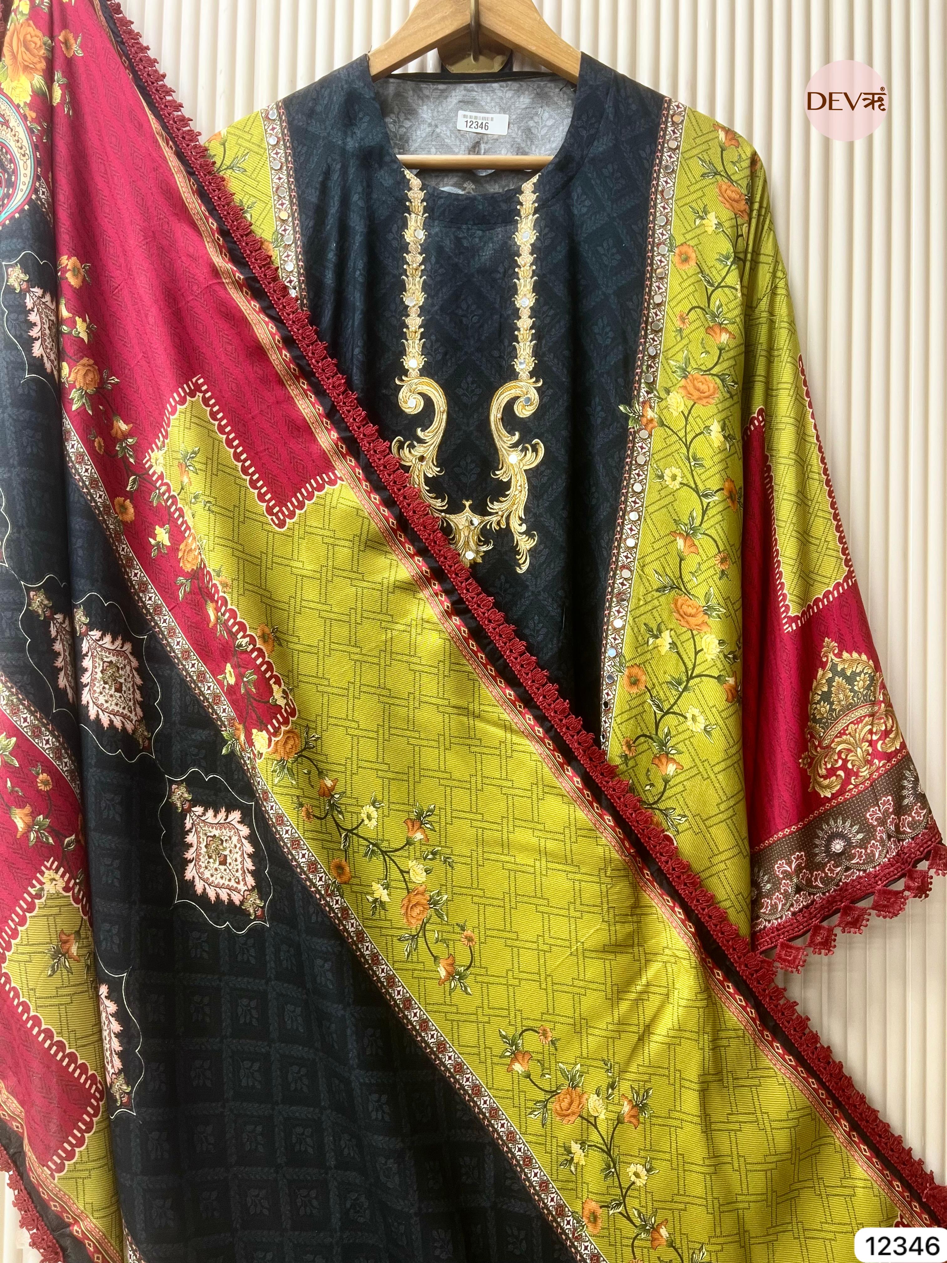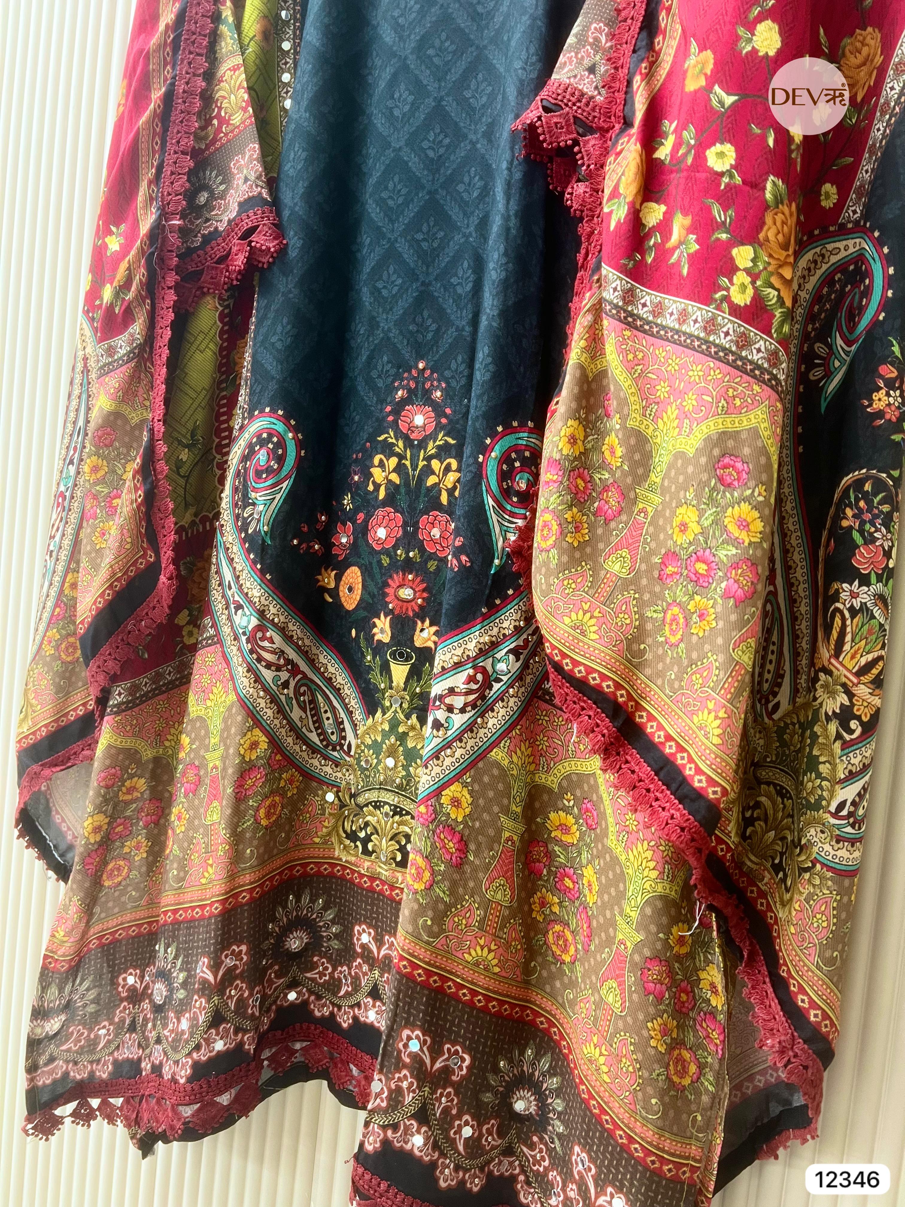 A richly composed deep teal muslin suit set adorned with intricate prints and ornate neckline embroidery. The contrast muslin dupatta features layered motifs and detailed borders, bringing depth and character while maintaining Devri’s refined, elegant appeal.