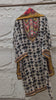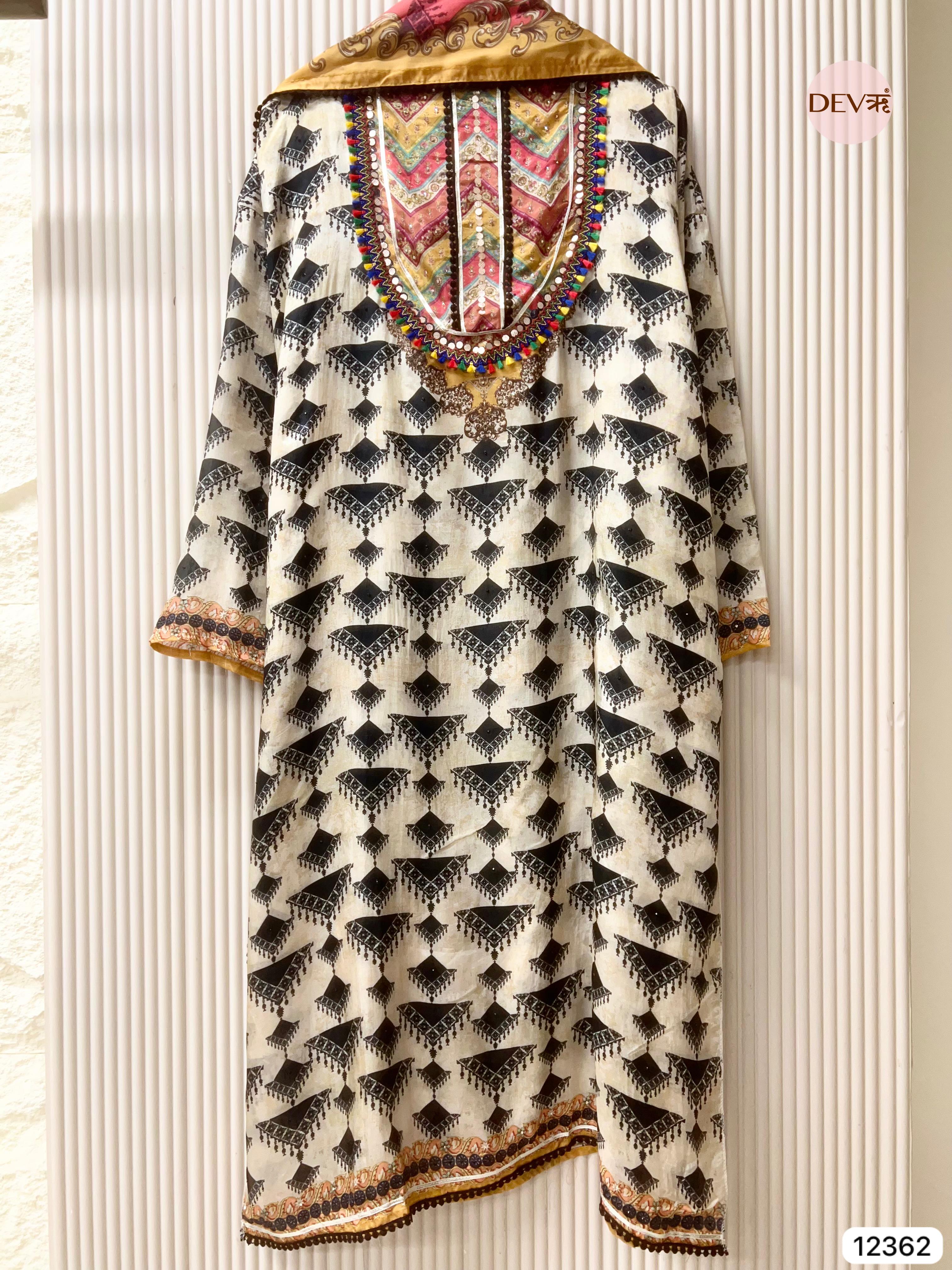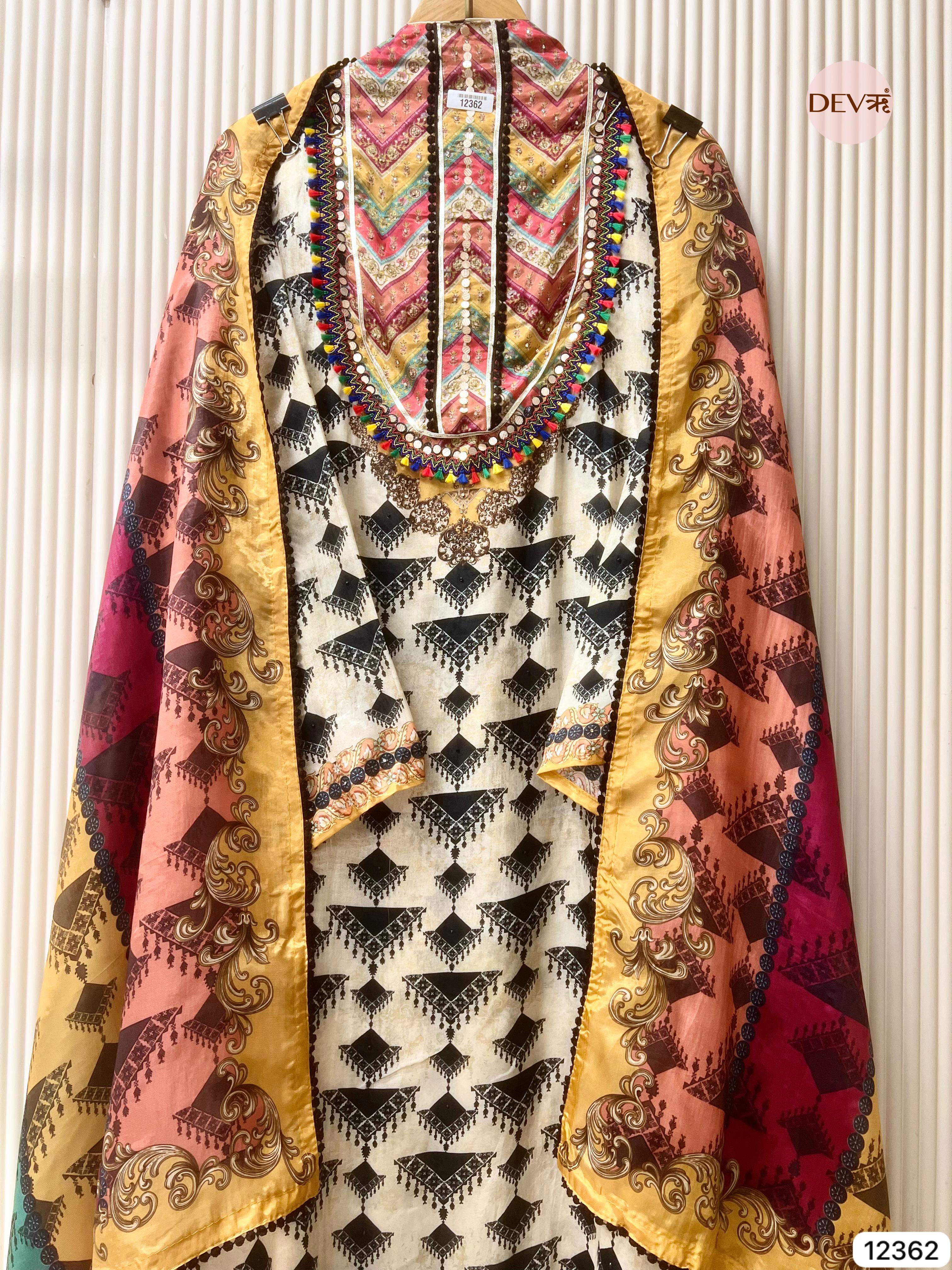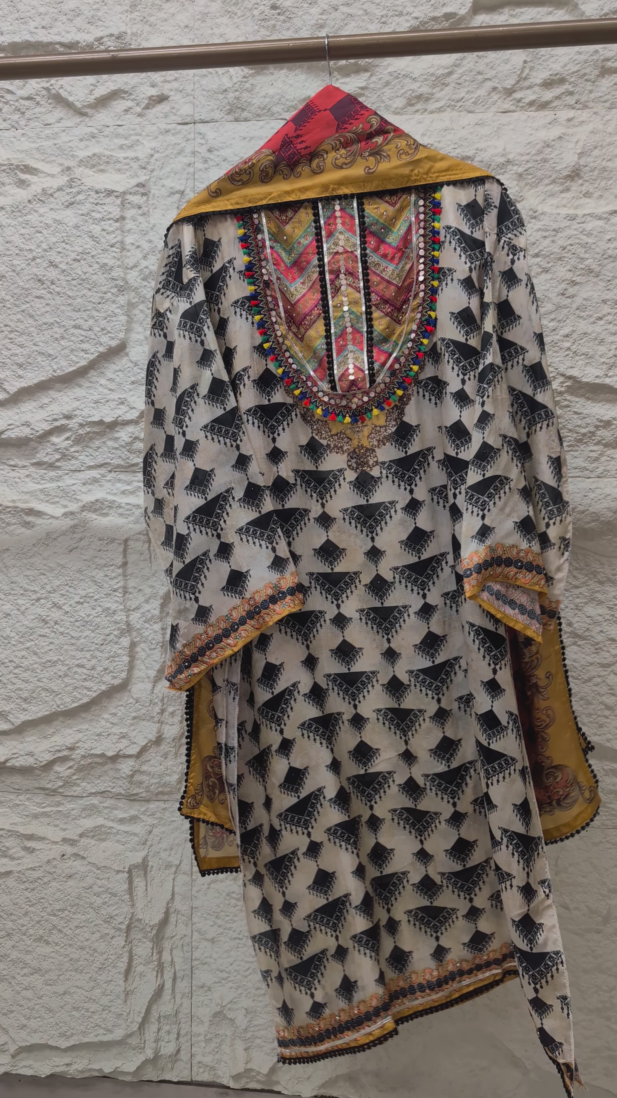 An elegant ivory organza silk ensemble accented with striking geometric prints and a richly embellished neckline. The contrast of bold motifs against a soft, sheer base creates a refined visual rhythm, while the multicolour dupatta adds depth and artistic character to the overall look.