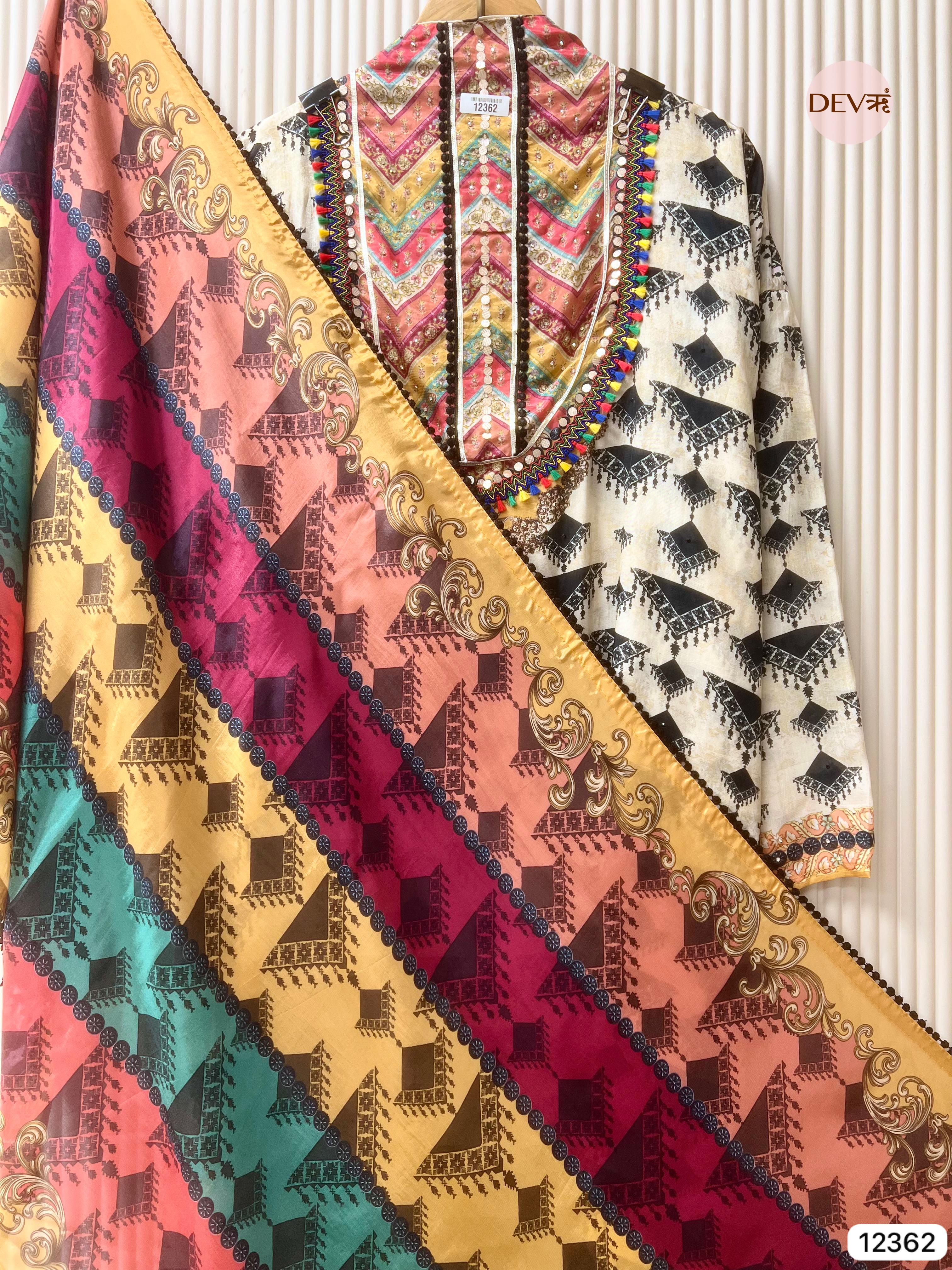 Ivory Multicolour Organza Silk Printed Unstitched 3-Piece Suit (Devri – D.No 12362)
