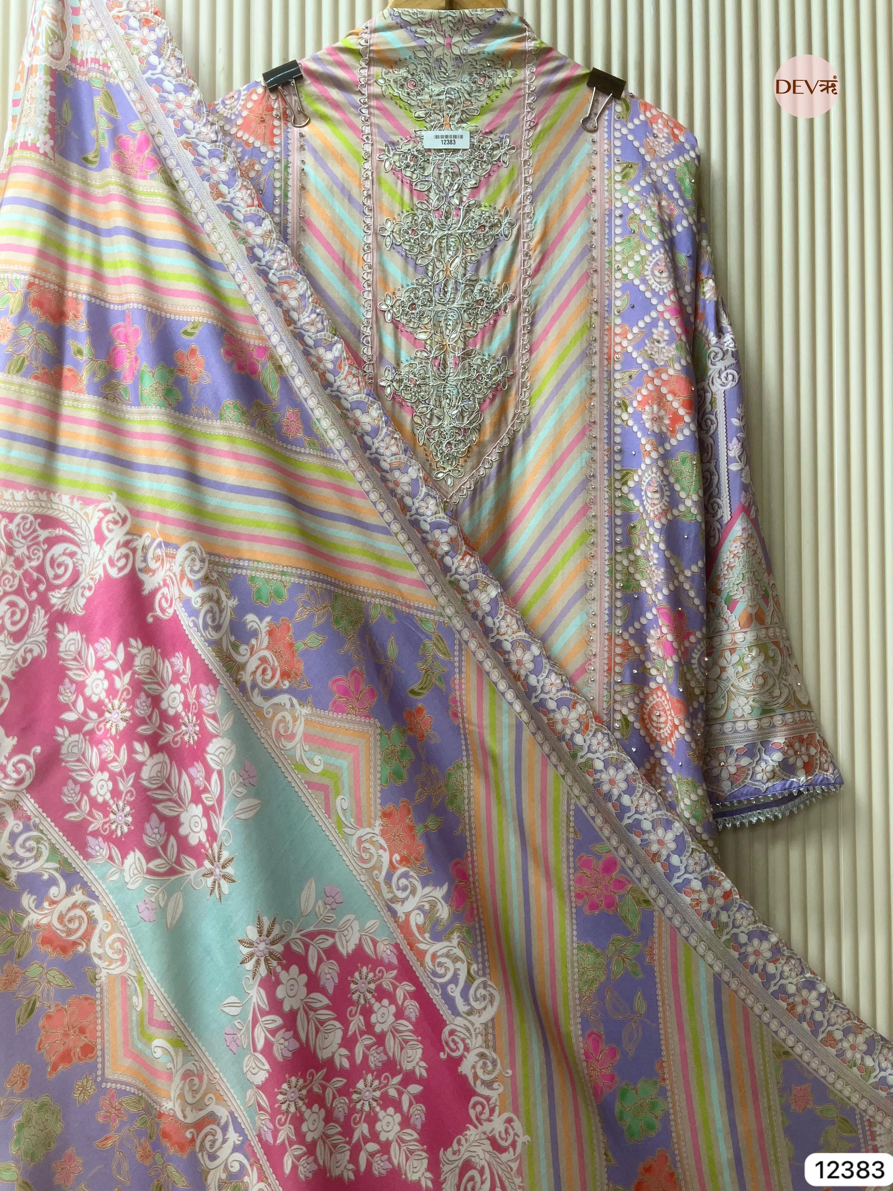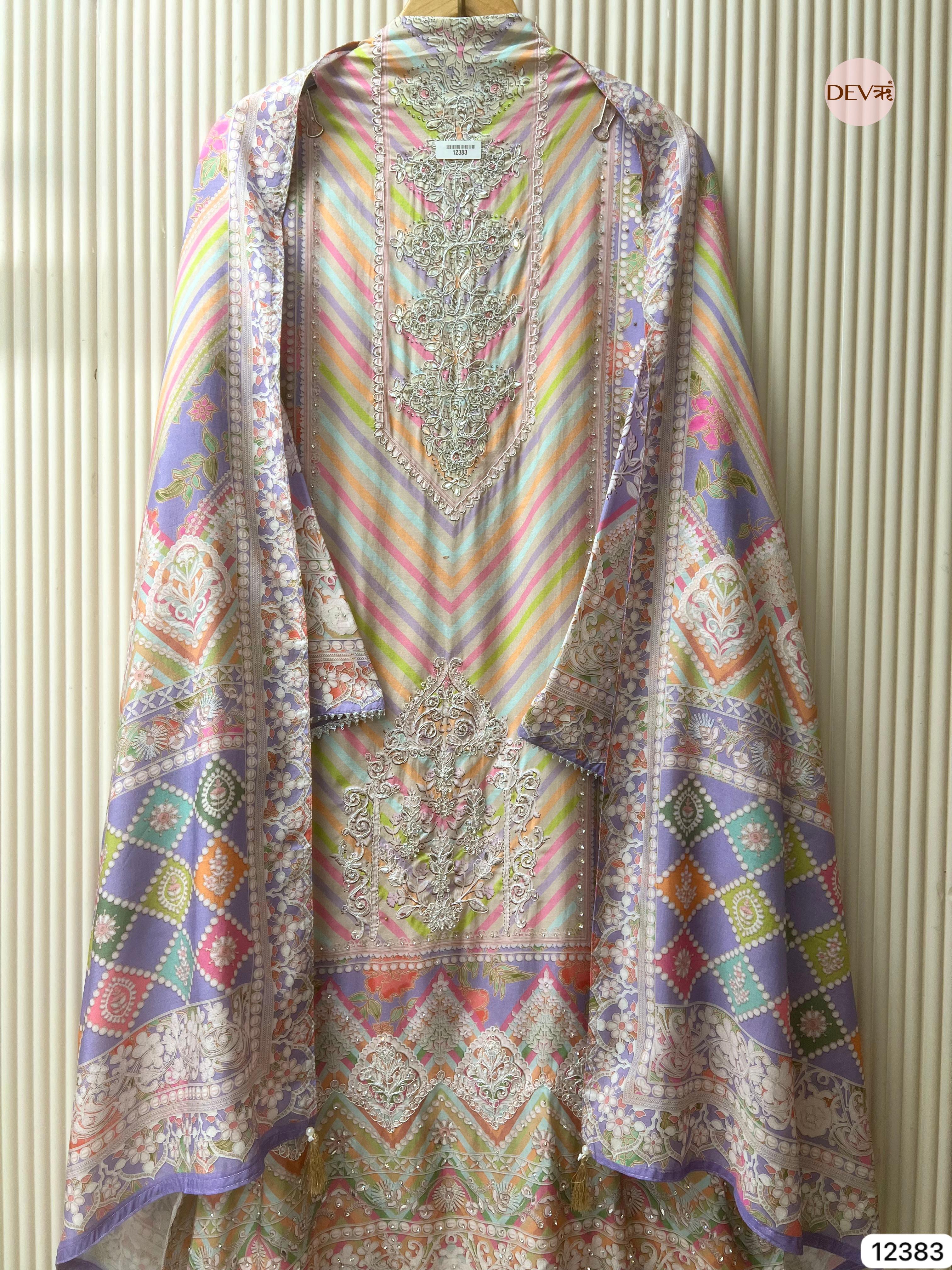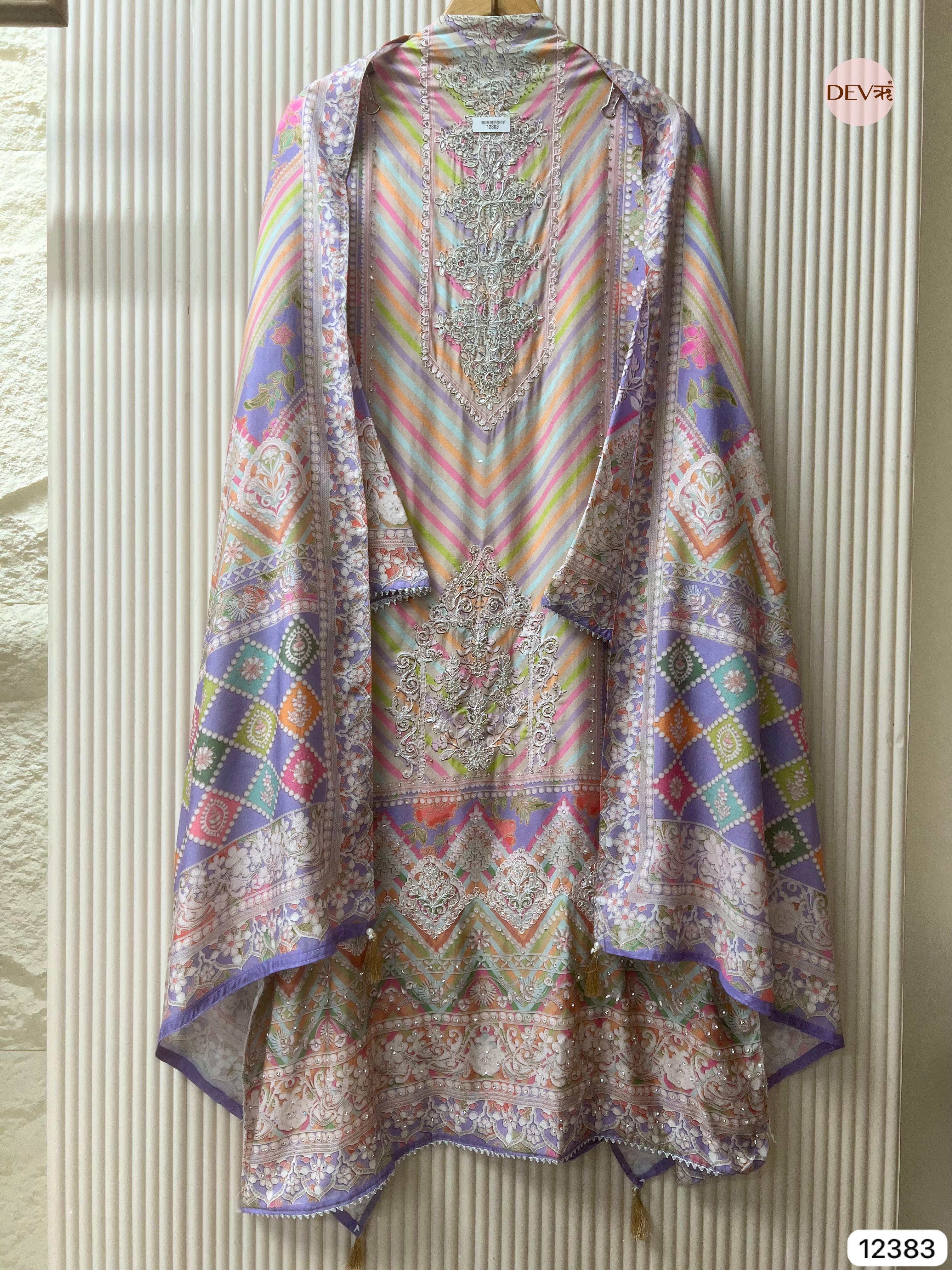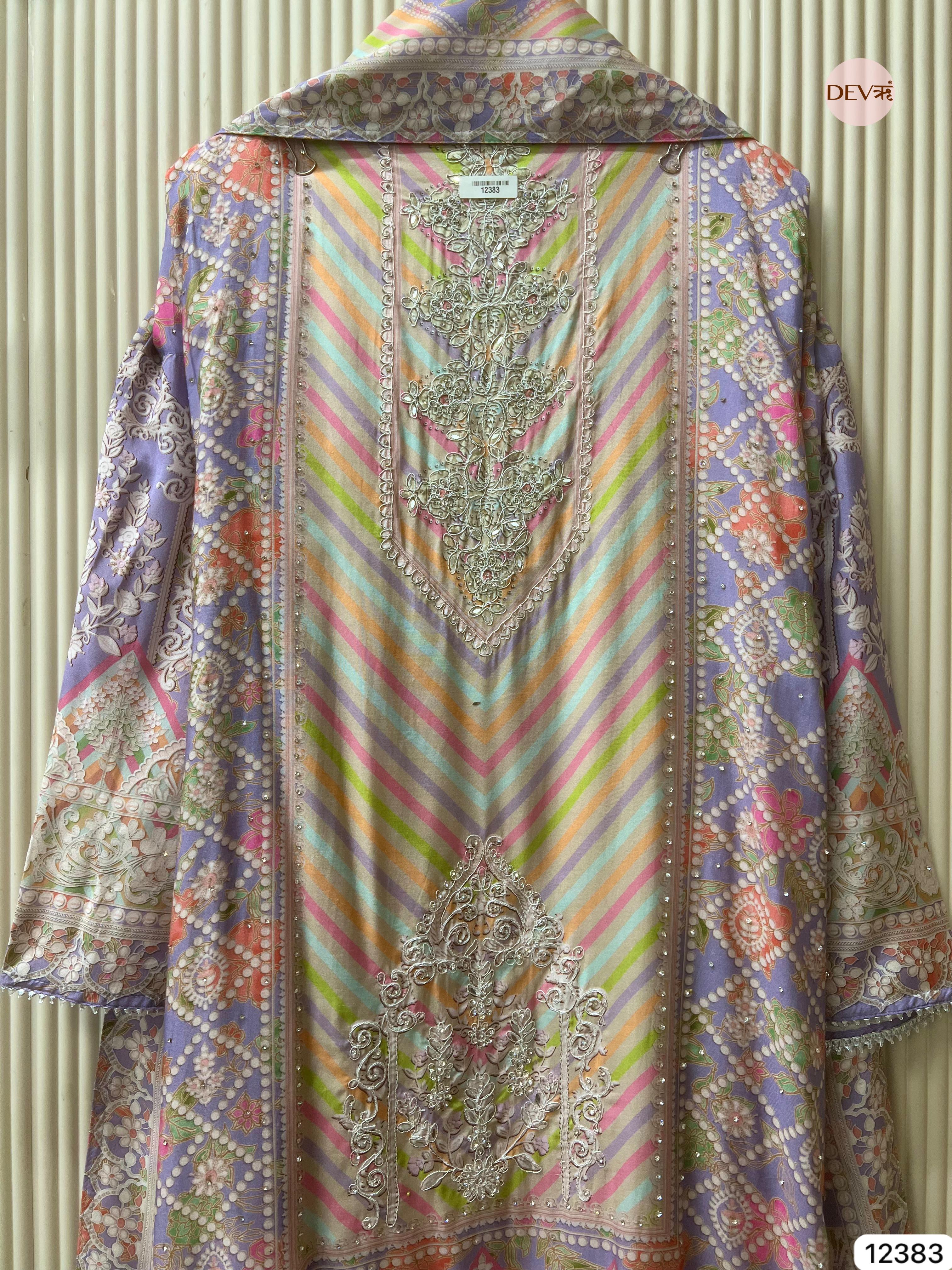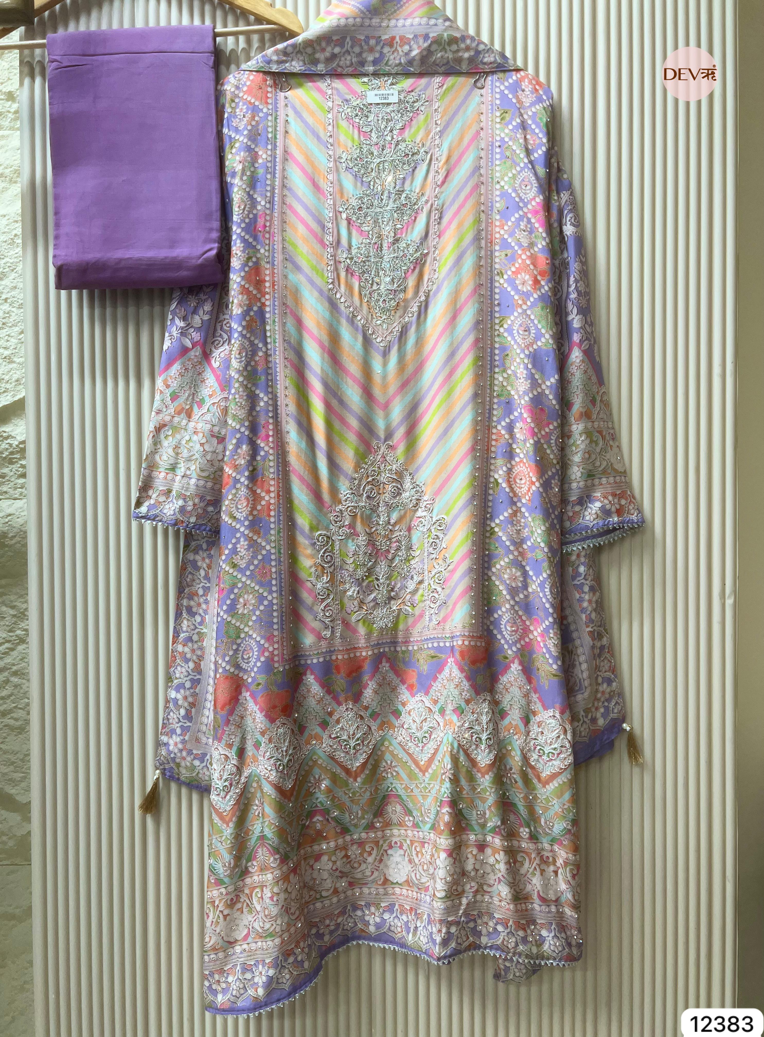 A graceful multicolour ensemble crafted in soft muslin fabric, showcasing delicate printed artistry with a gentle, flowing texture. The design reflects Devri’s understated elegance, blending soothing tones with refined detailing for a timeless everyday appeal.