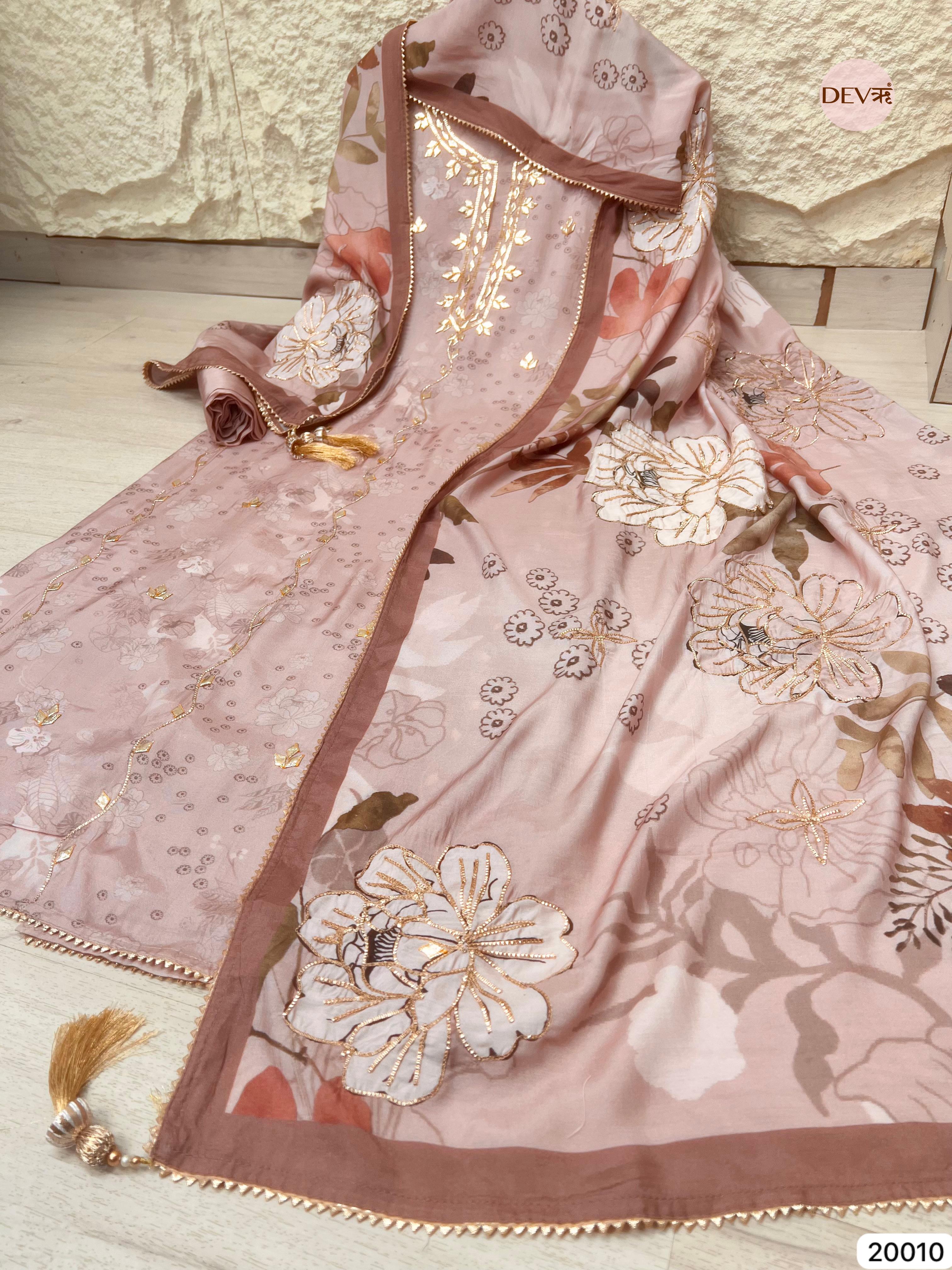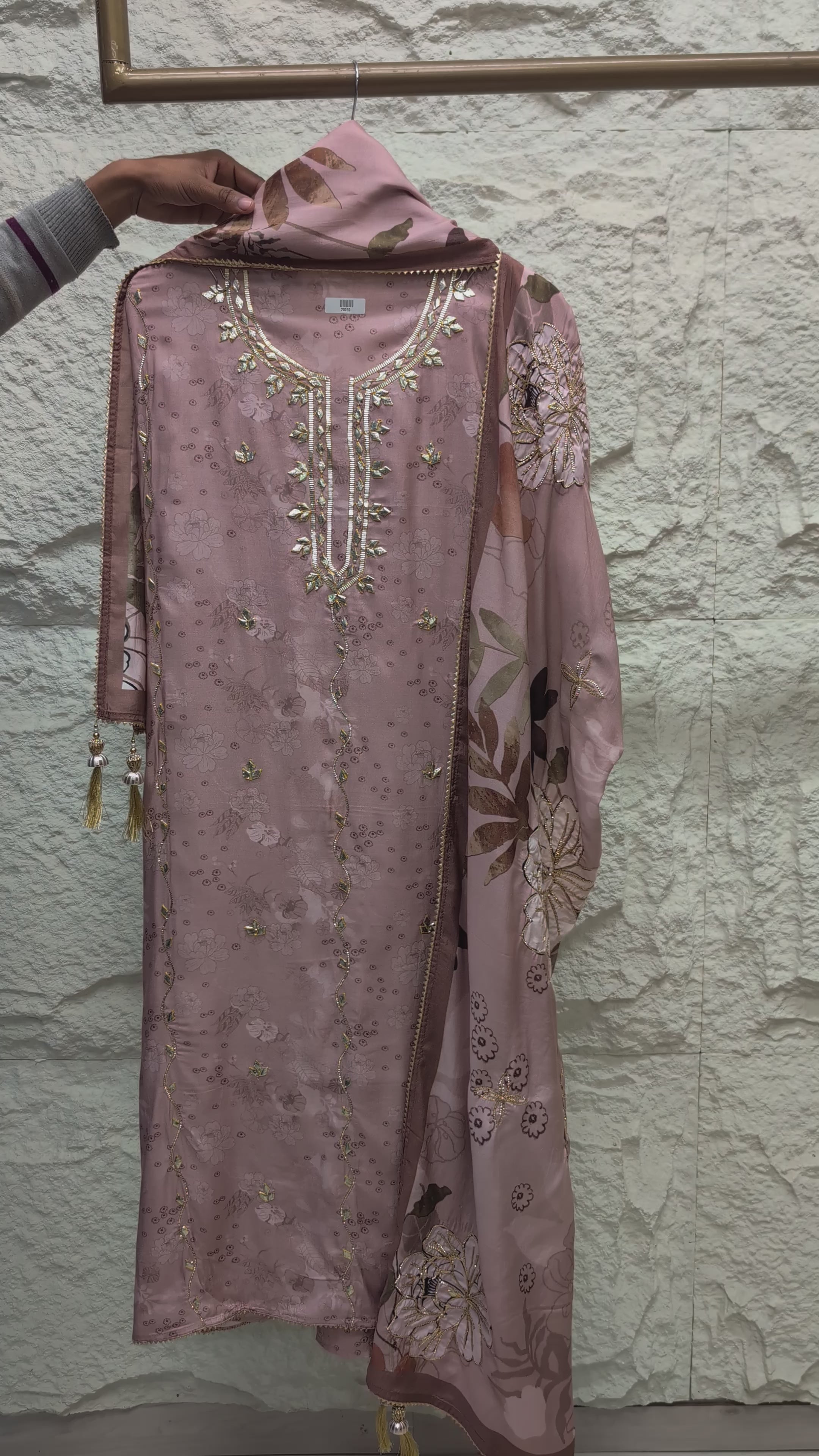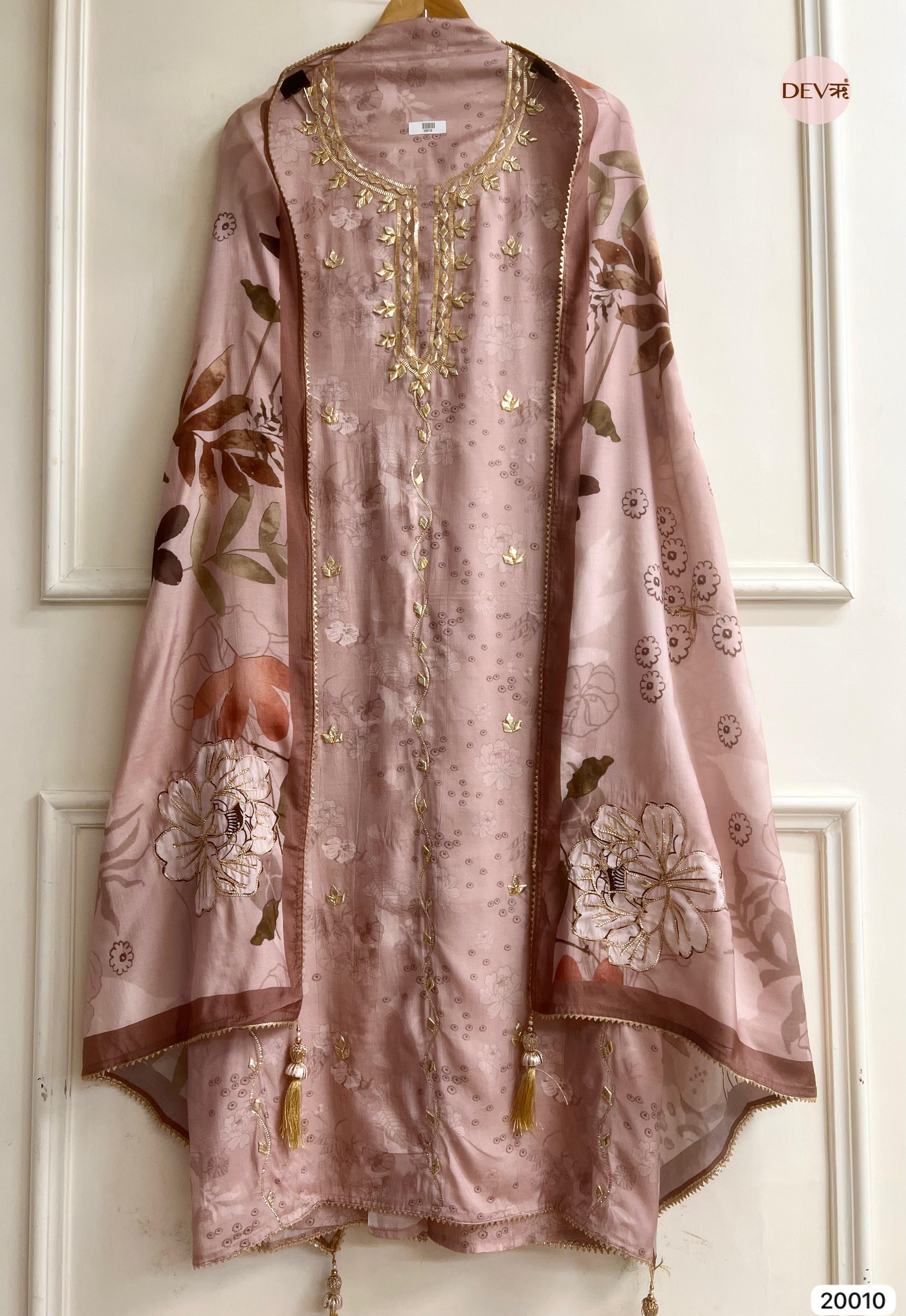 This sophisticated mauve ensemble is rendered in premium muslin fabric, offering a soft luster and an effortless drape. The shirt is detailed with an exquisite Gota-work neckline and delicate hand-embroidered floral motifs that lend an artisanal touch to the tonal floral print. Paired with a coordinated muslin dupatta featuring heavy floral border embroidery and a smooth shantoon bottom, this suit epitomizes Devri’s signature understated luxury.