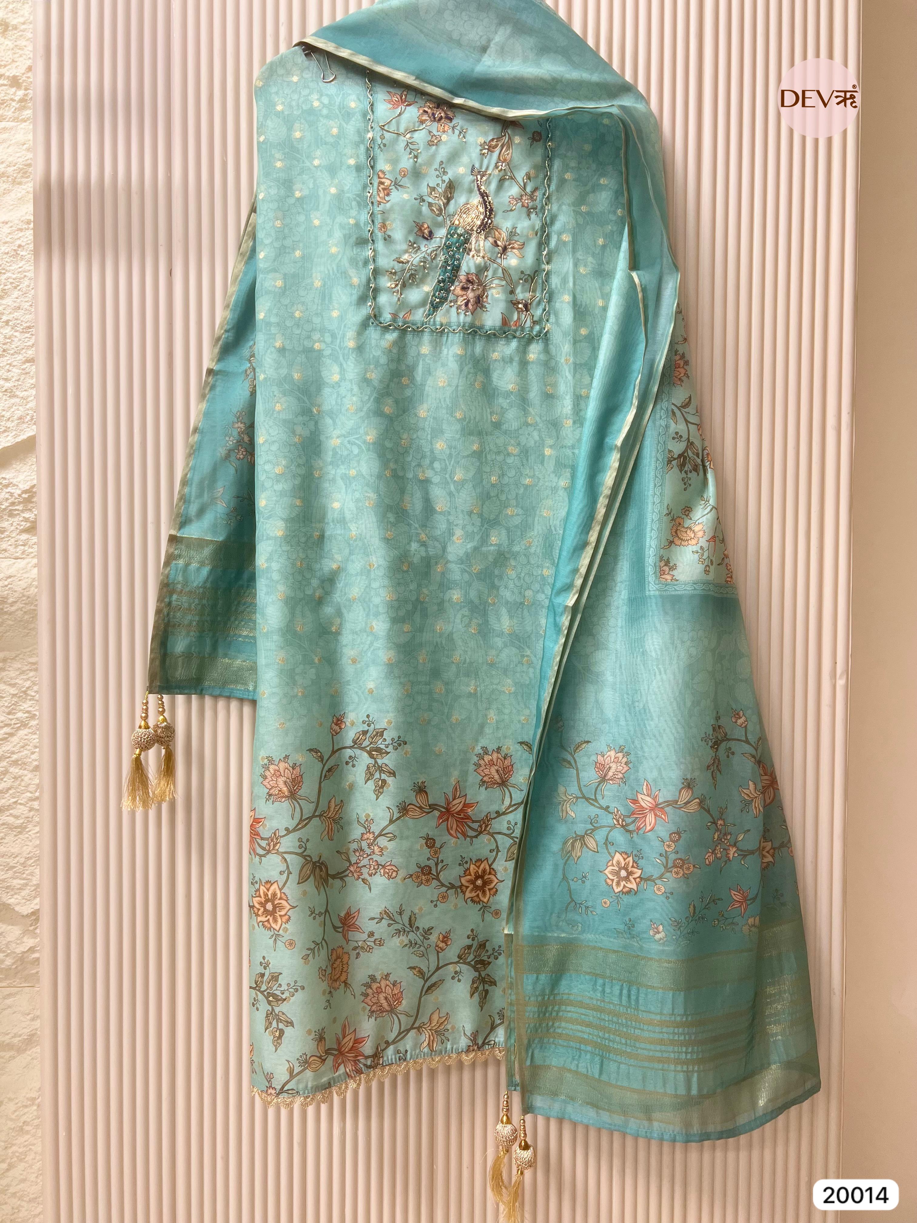 This refreshing sea green ensemble is masterfully crafted from pure chanderi, featuring a delicate floral print and an exquisite hand-embroidered peacock motif on the neckline. The shirt is highlighted with shimmering sequins and gold zari accents, beautifully contrasting the soft, silken texture of the fabric. Paired with a matching pure chanderi dupatta with woven gold borders and a smooth shantoon bottom, this set offers a regal and sophisticated look for festive occasions.