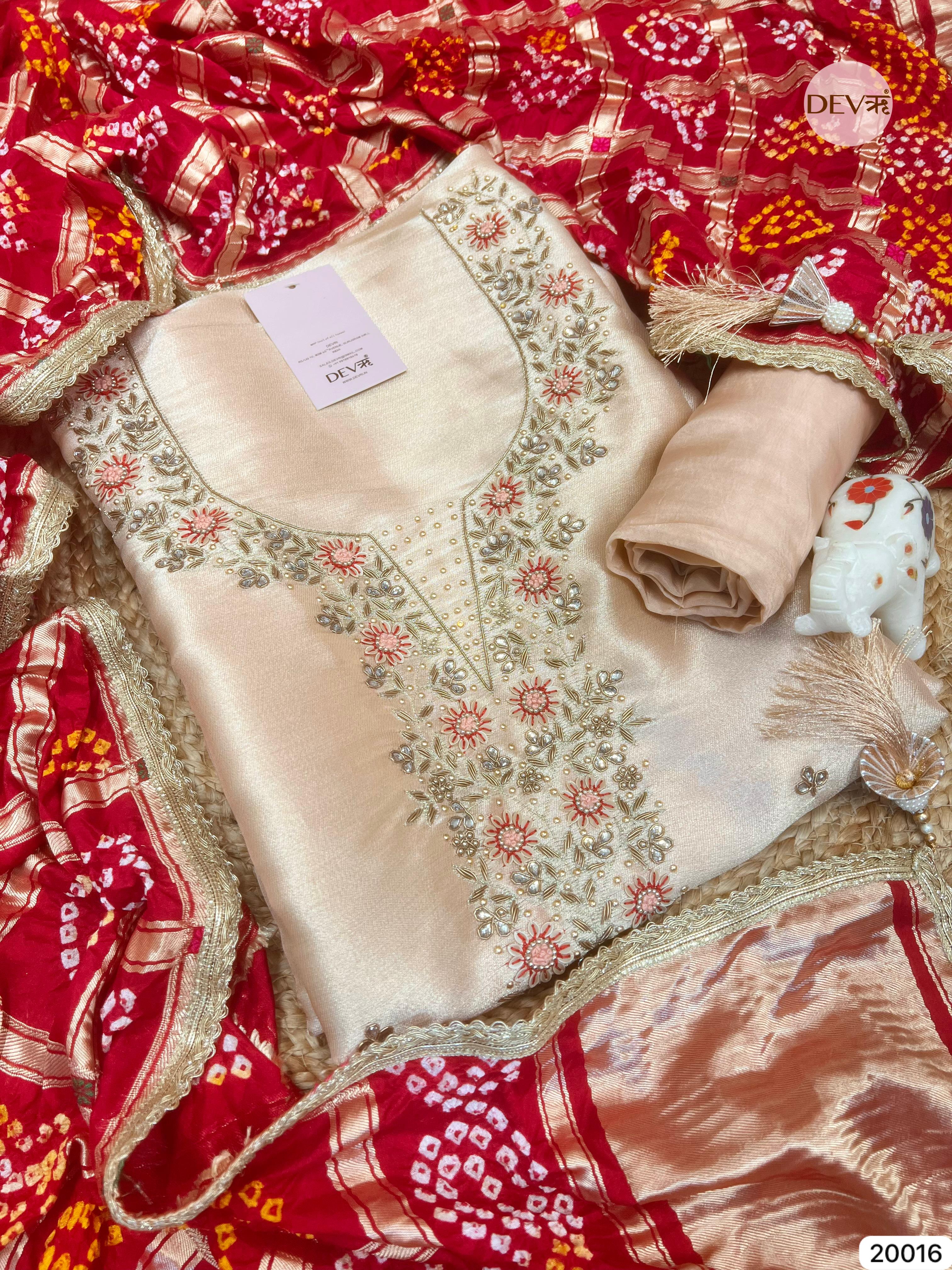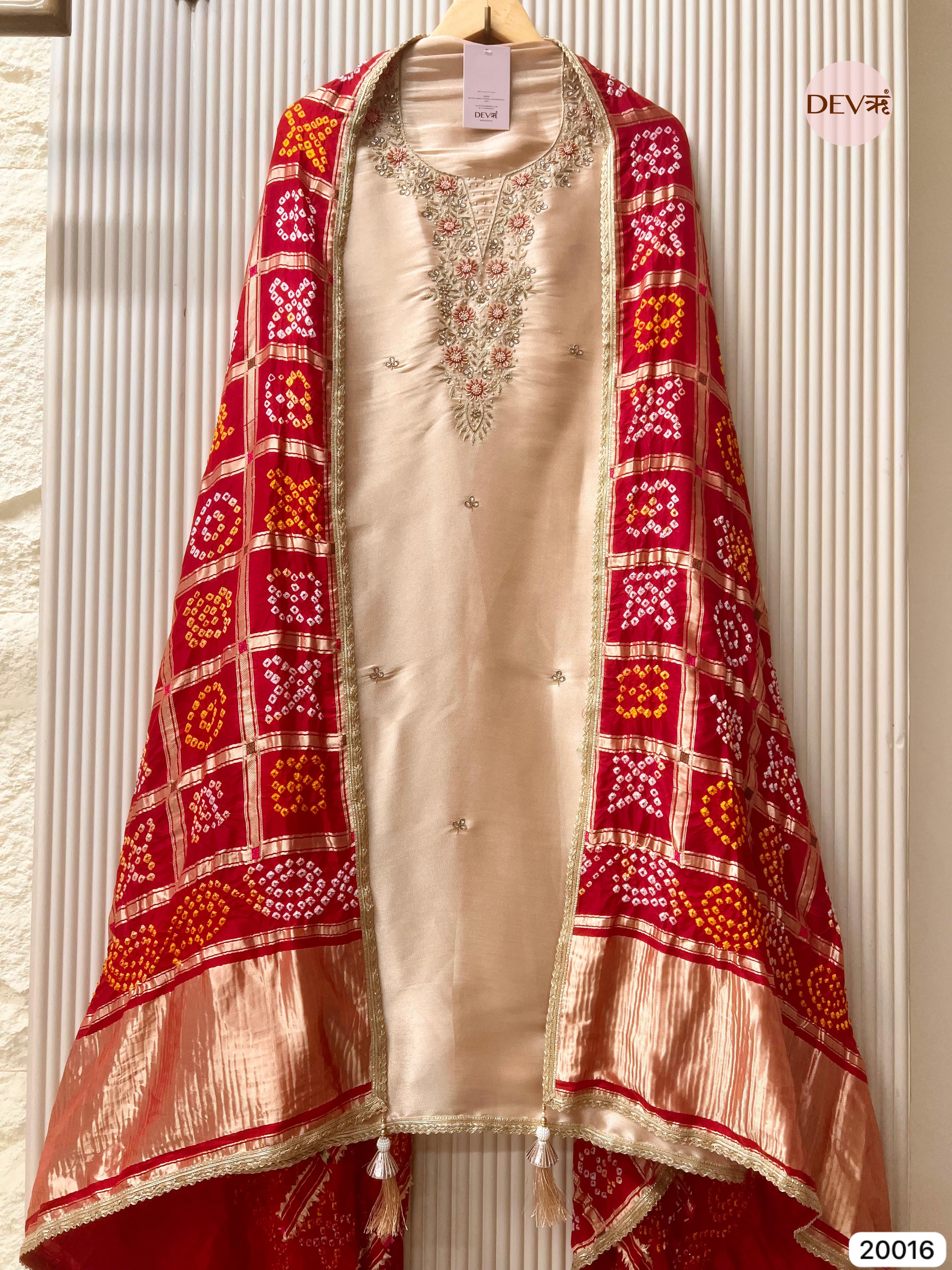An elegant ivory unstitched suit crafted in smooth giraffe silk, showcasing a soft sheen and delicate embroidery accenting the neckline. Paired with a richly patterned gaji silk dupatta and a coordinated shantoon bottom, this ensemble reflects Devri’s refined balance of tradition and quiet sophistication.