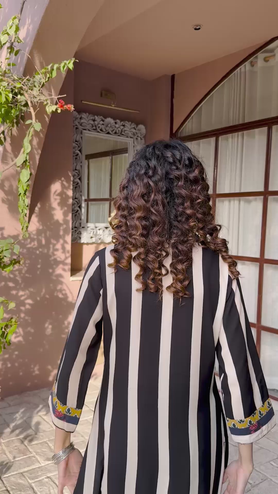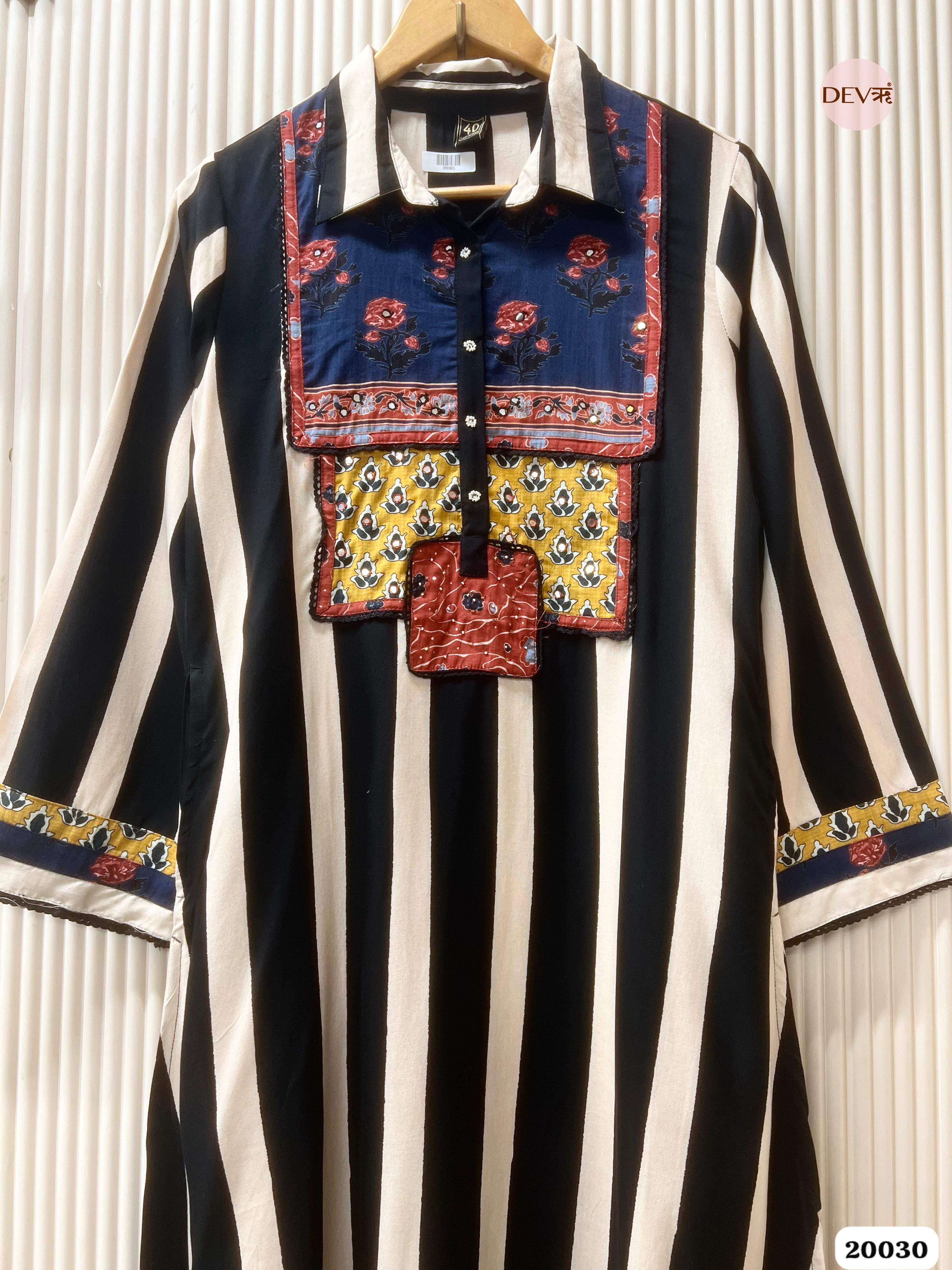A striking play on geometry and heritage, this ensemble features bold monochrome stripes contrasted by a vibrant, multi-patterned yoke. The collared shirt silhouette is adorned with traditional floral motifs and intricate border detailing on the cuffs, paired with smooth shantoon pants for a look that is both contemporary and culturally rooted.