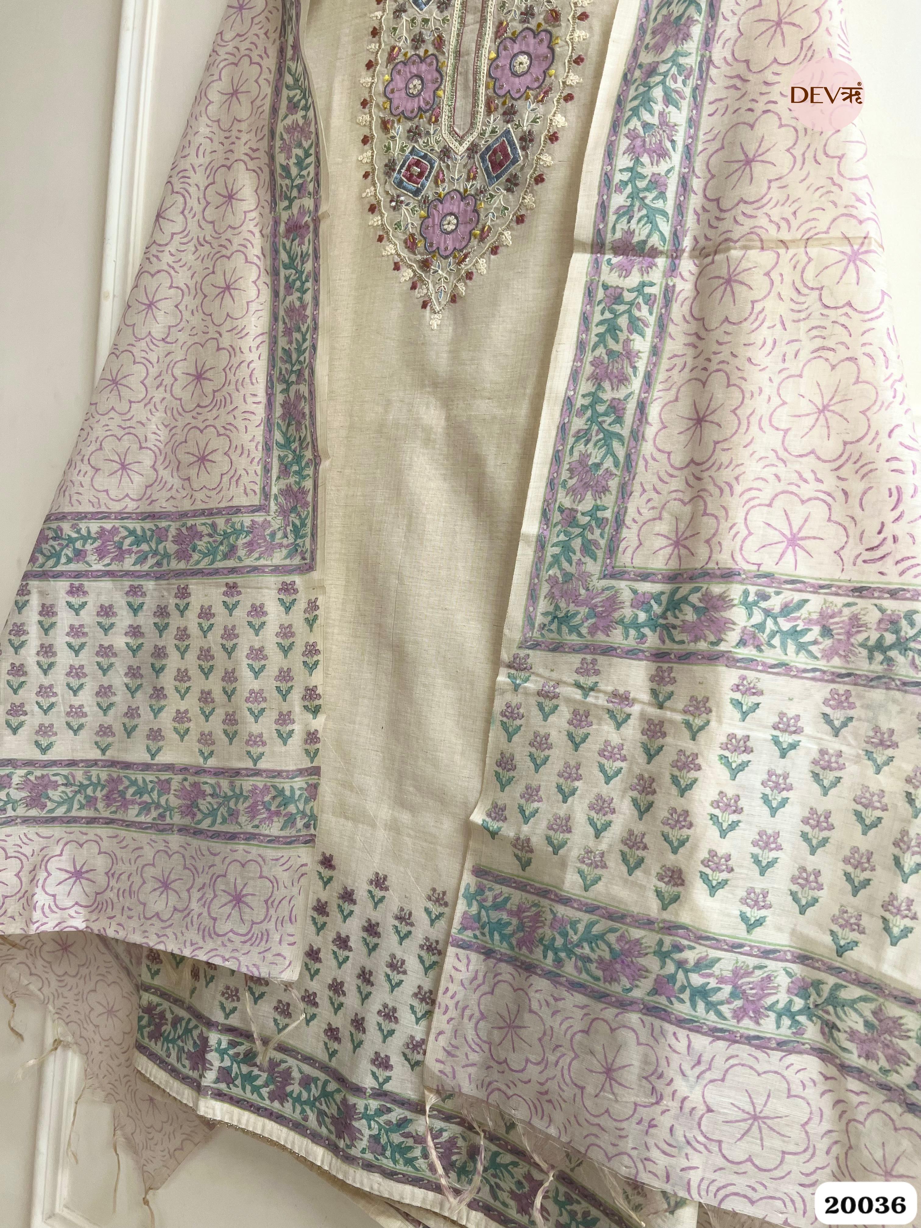 A refined ivory unstitched suit crafted in pure linen, highlighted with delicate multicolour embroidery along the neckline. The surface is adorned with soft floral and geometric motifs, balanced by an intricately printed linen dupatta that adds depth and elegance to the ensemble.