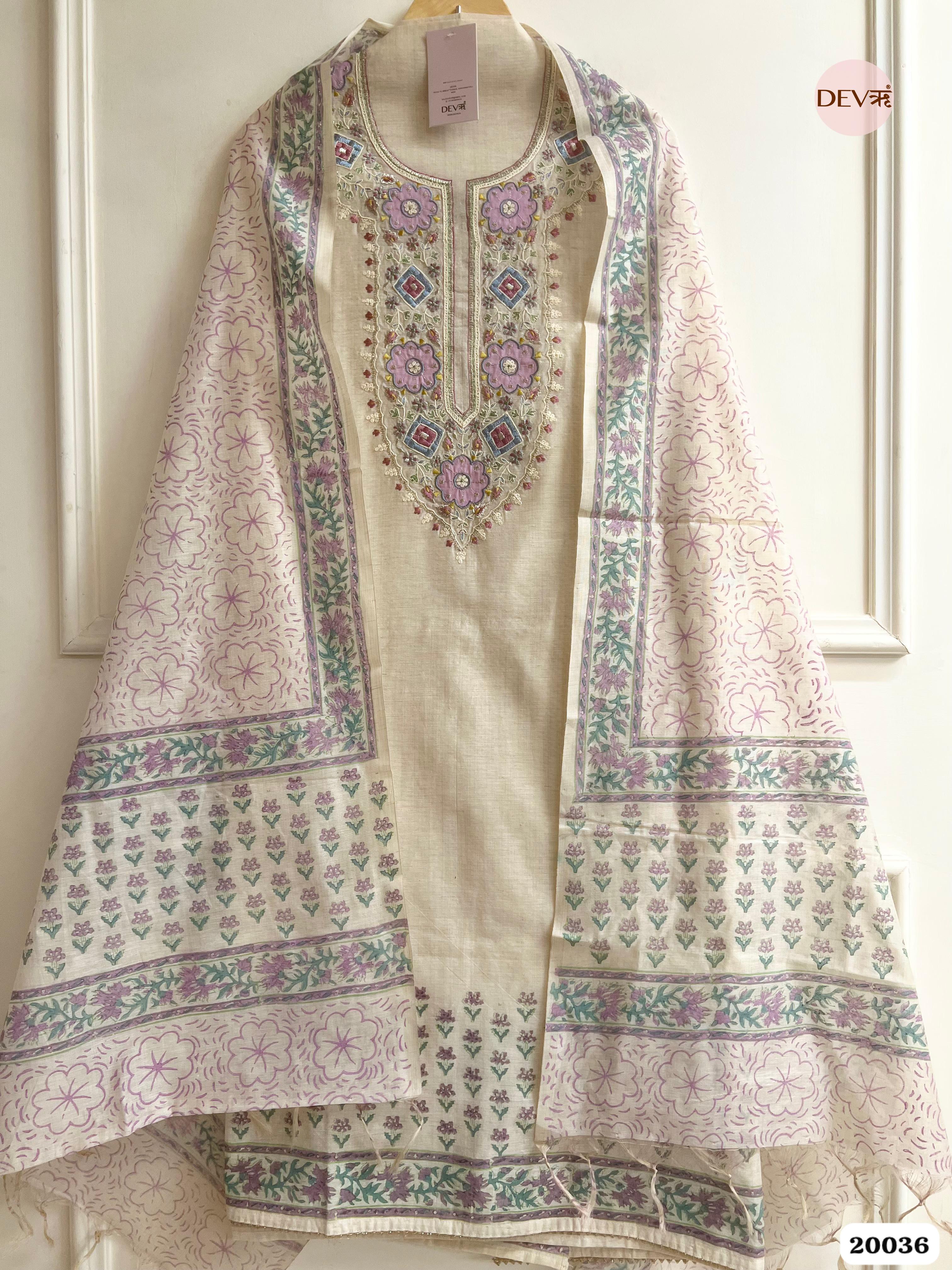 Ivory Pure Linen Embroidered Unstitched 3-Piece Suit (Devri – D.No. 20036)
