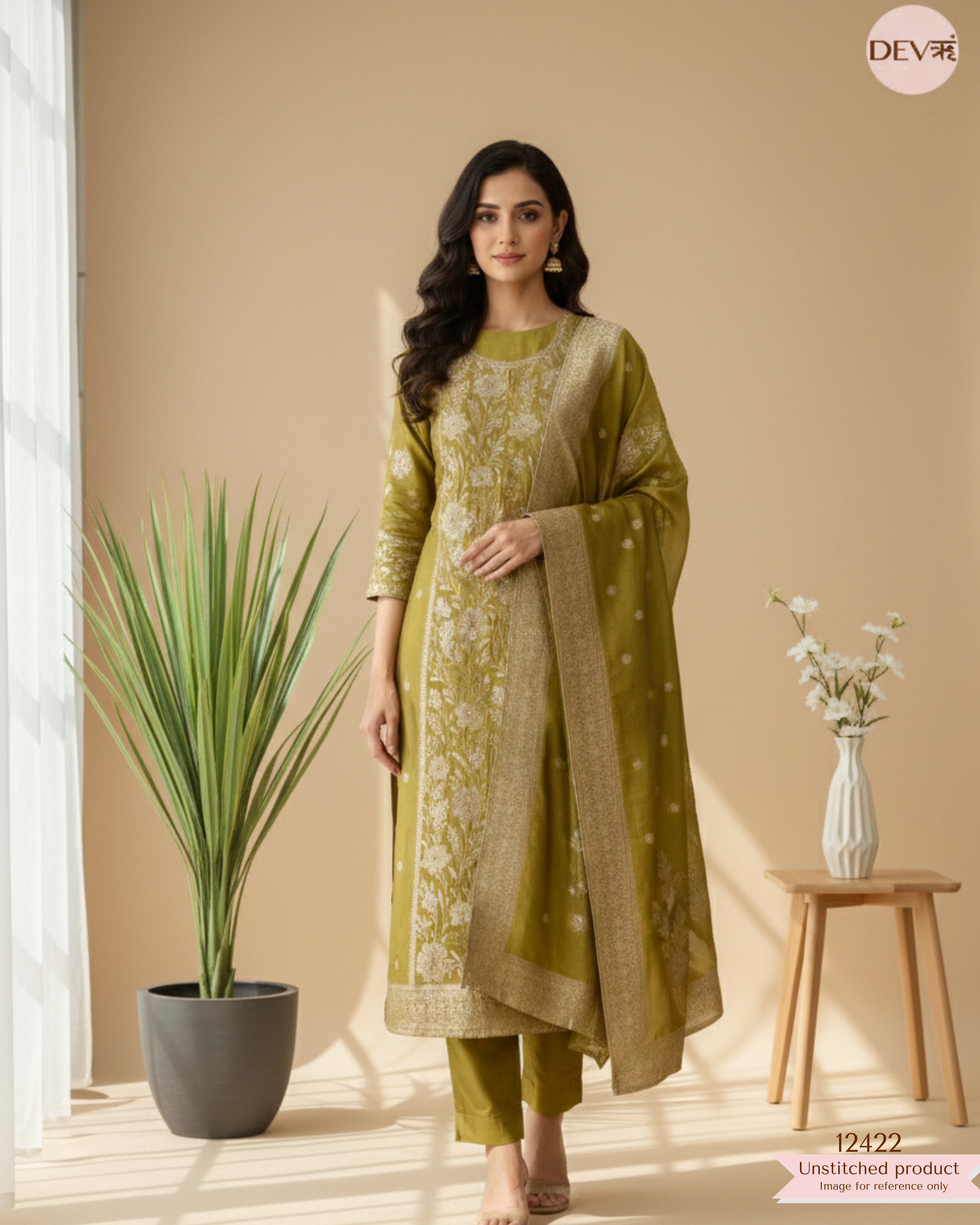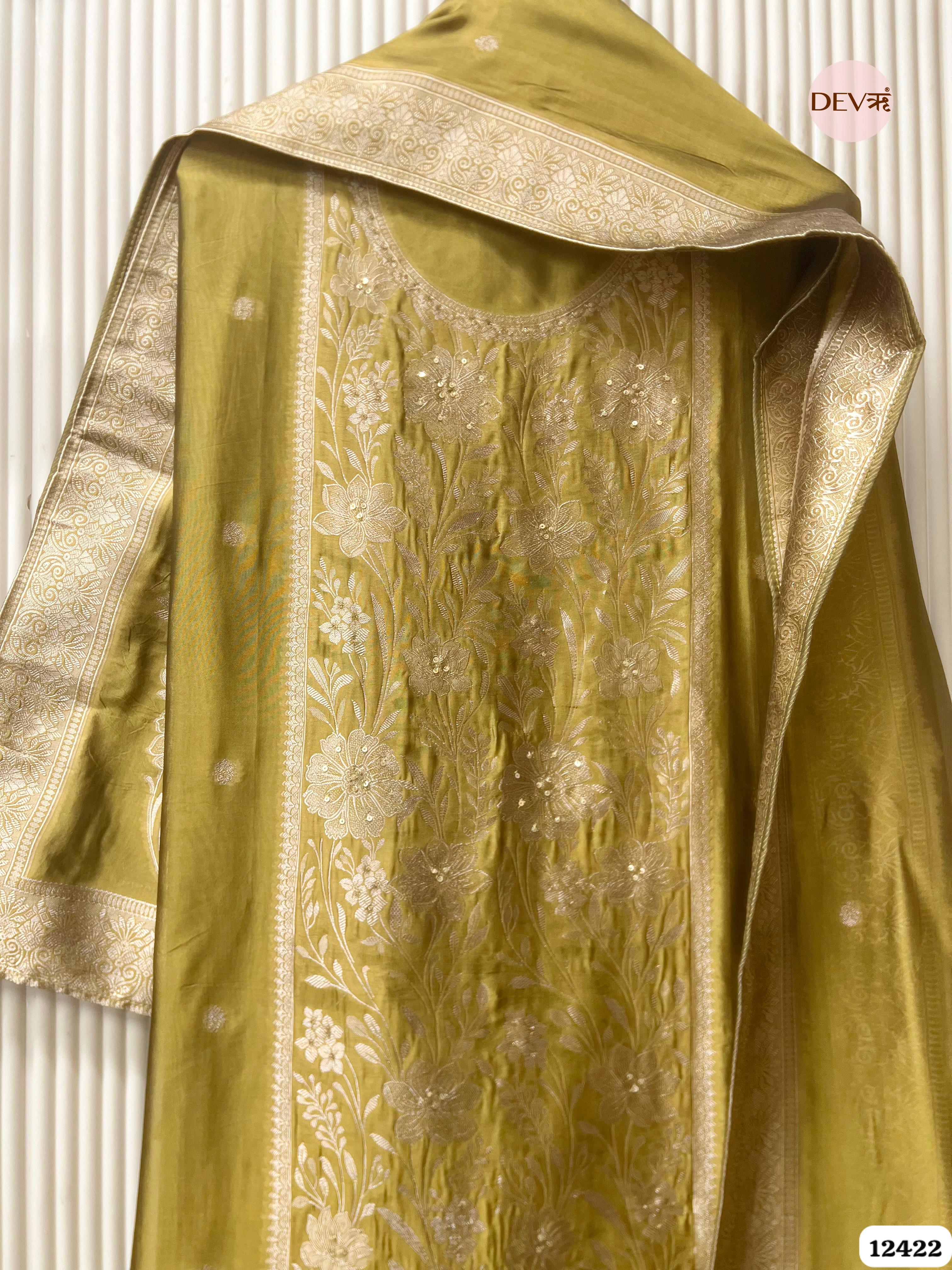 An elegant olive-toned unstitched suit enriched with intricate Banarasi floral weaving and delicate embroidery. The soft sheen of silk highlights the refined craftsmanship, complemented by ornate borders and a graceful, heritage-inspired finish that reflects Devri’s timeless aesthetic.