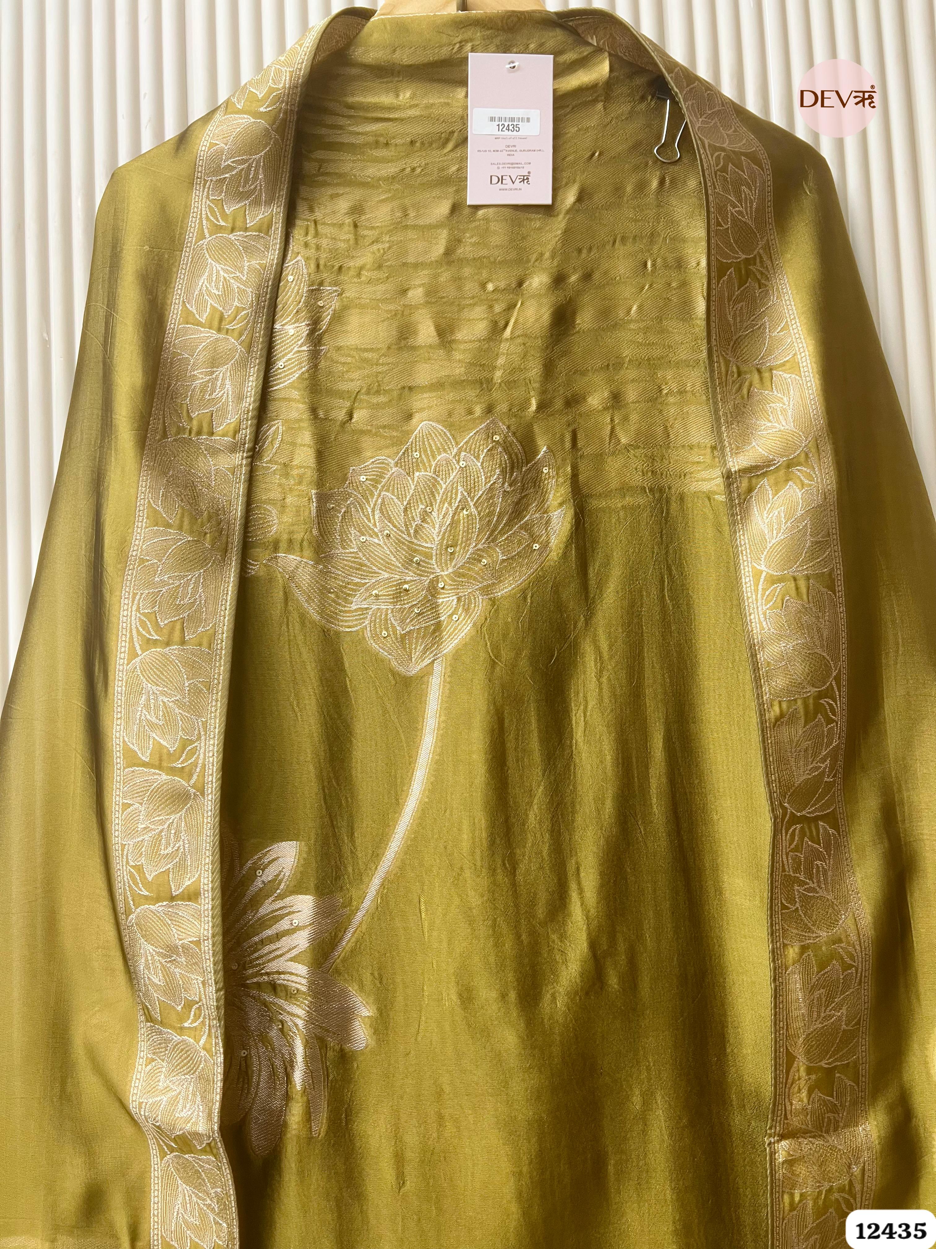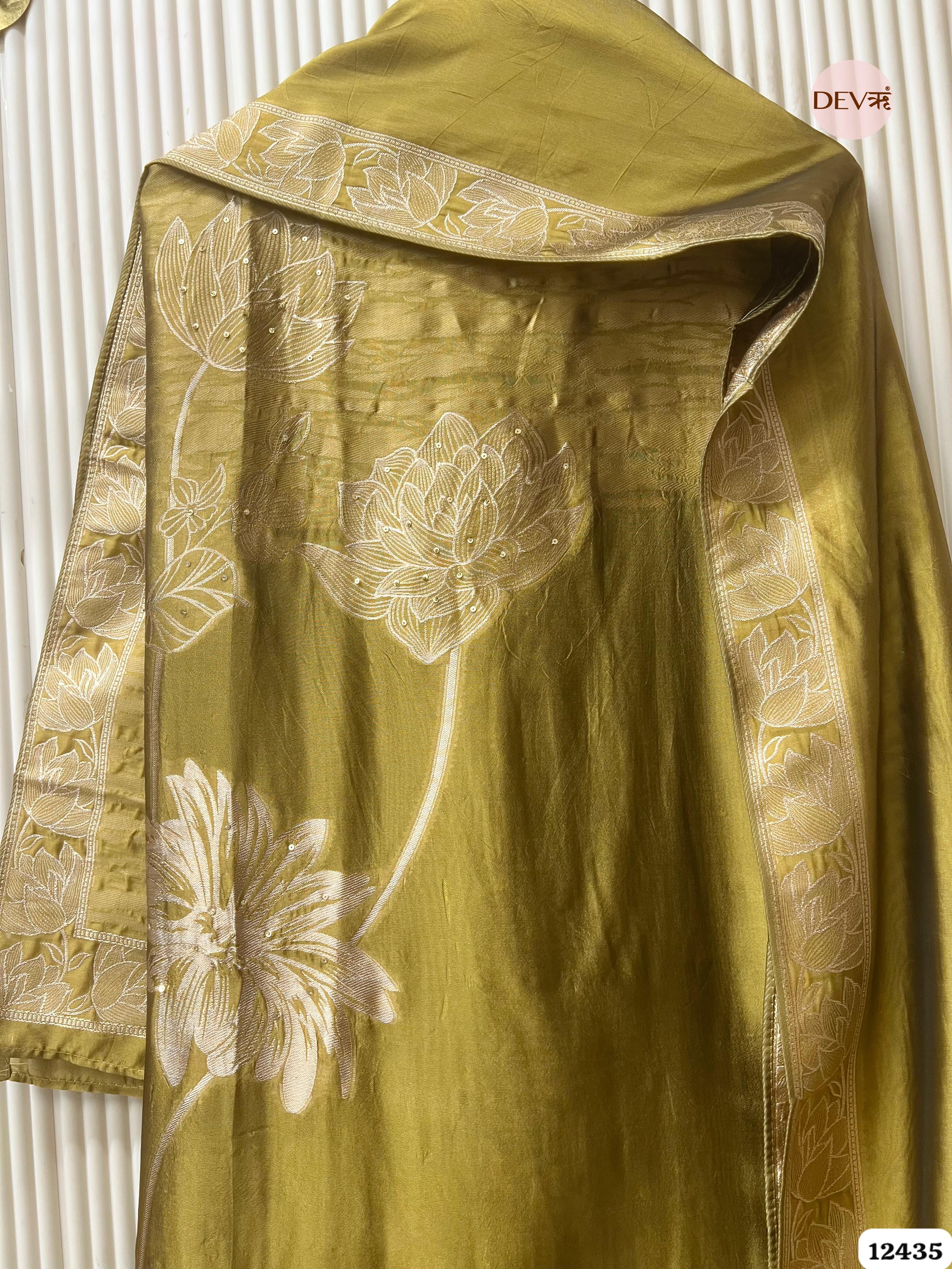 This olive green unstitched three-piece suit is crafted in luminous Banarasi silk, highlighted with softly printed floral motifs and subtle woven texture. The fabric carries a gentle sheen and depth, while the coordinated dupatta mirrors the same refined detailing, resulting in a composed and elegant Devri signature ensemble.