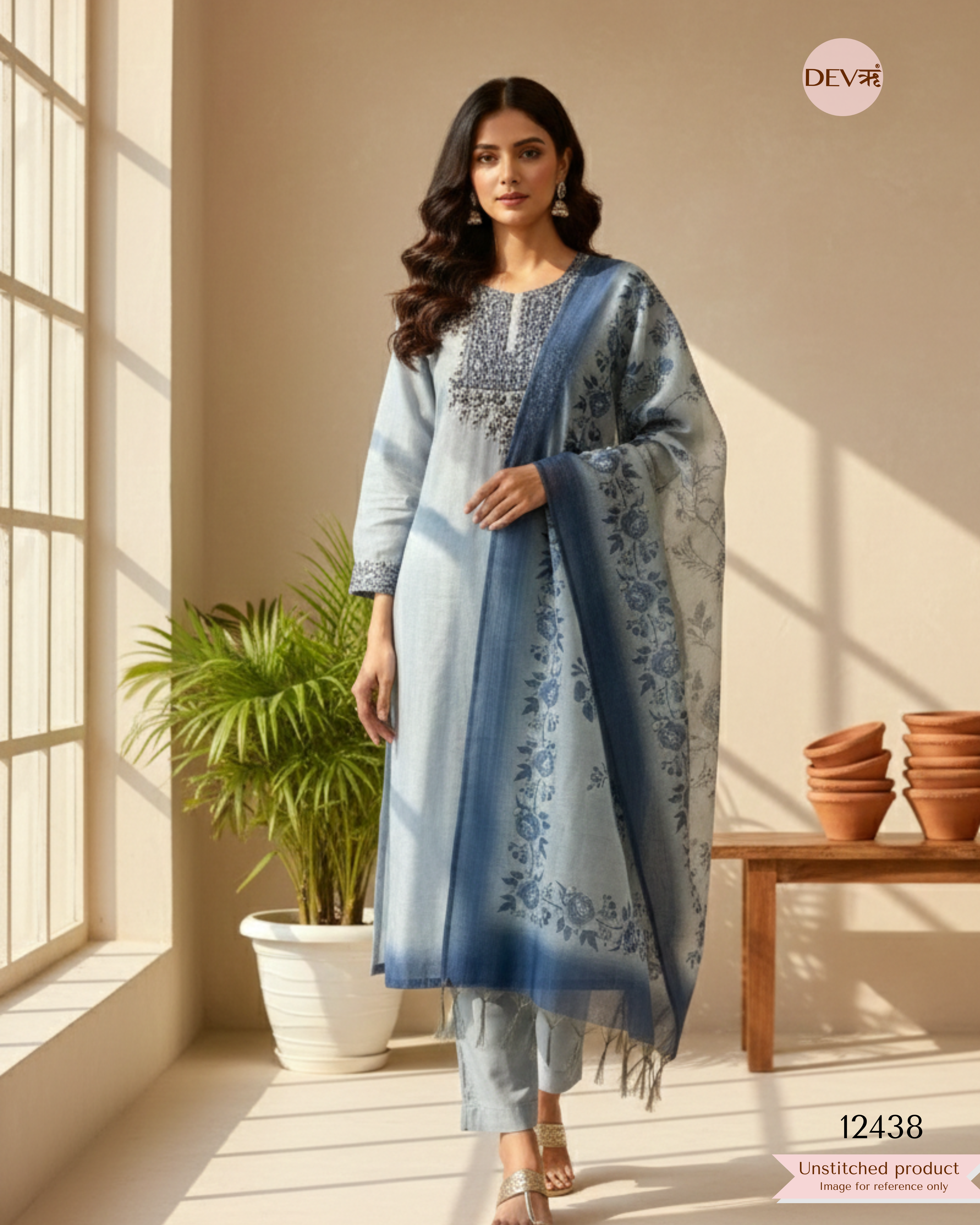 Rendered in a muted dusty blue tone, this unstitched suit is crafted from lightweight pure linen tissue with a soft, breathable feel. The shirt is highlighted with dense tonal embroidery and fine embellishment arranged in a structured neckline pattern, creating a refined focal point. The matching dupatta features delicate floral printing with shaded borders, maintaining a calm and cohesive aesthetic true to Devri’s understated elegance.
