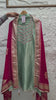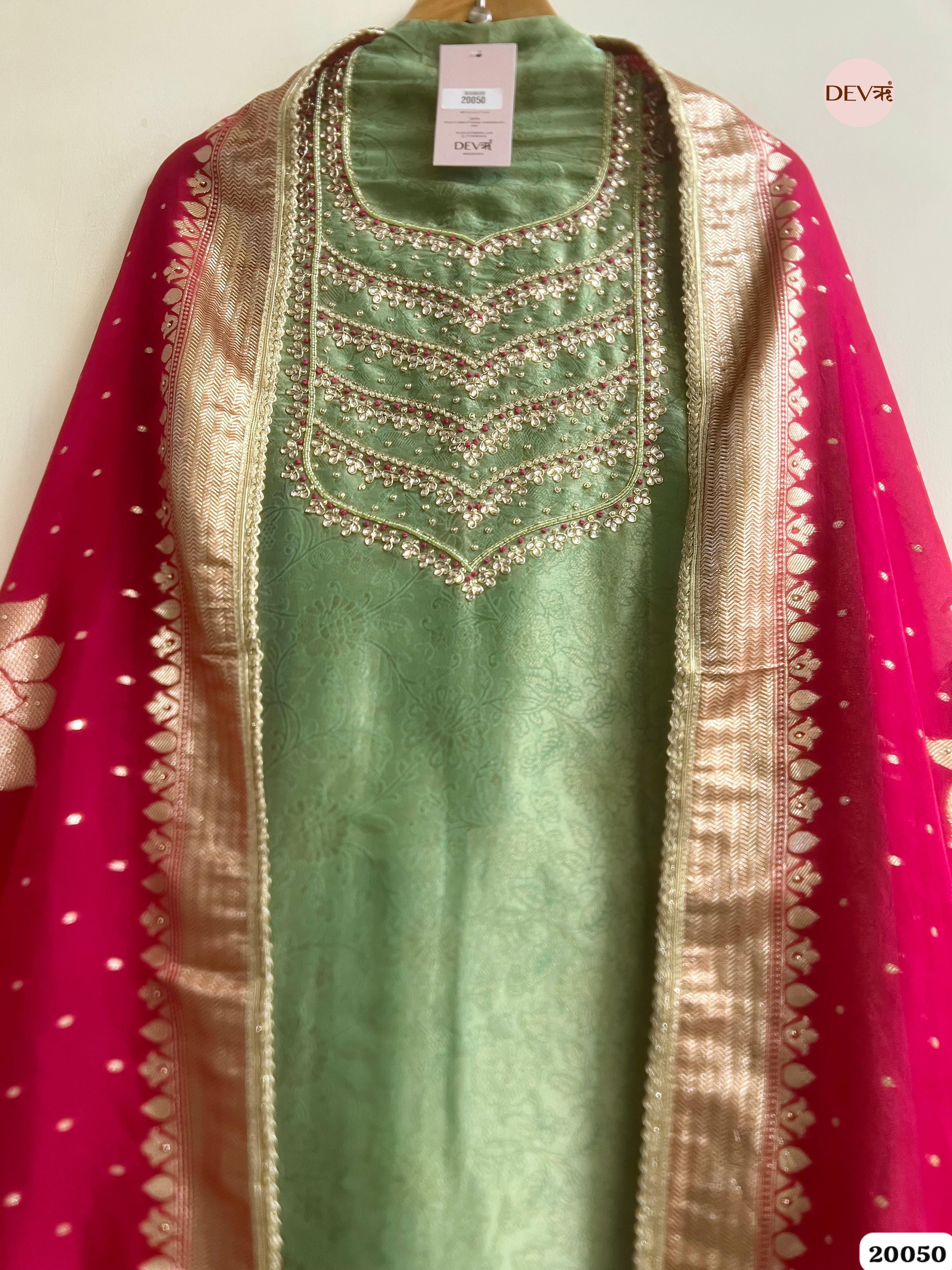 A graceful unstitched ensemble in a refreshing pistachio green hue, crafted in lustrous pure tissue silk. The shirt features a rich self-woven texture enhanced with finely detailed zari and sequin embroidery arranged in an elegant layered neckline pattern. Paired with a striking Banarasi organza silk dupatta in deep magenta, highlighted by traditional gold floral motifs and a broad woven border, the set reflects timeless festive charm. The coordinated Upada silk bottom completes the look with understated sophistication.