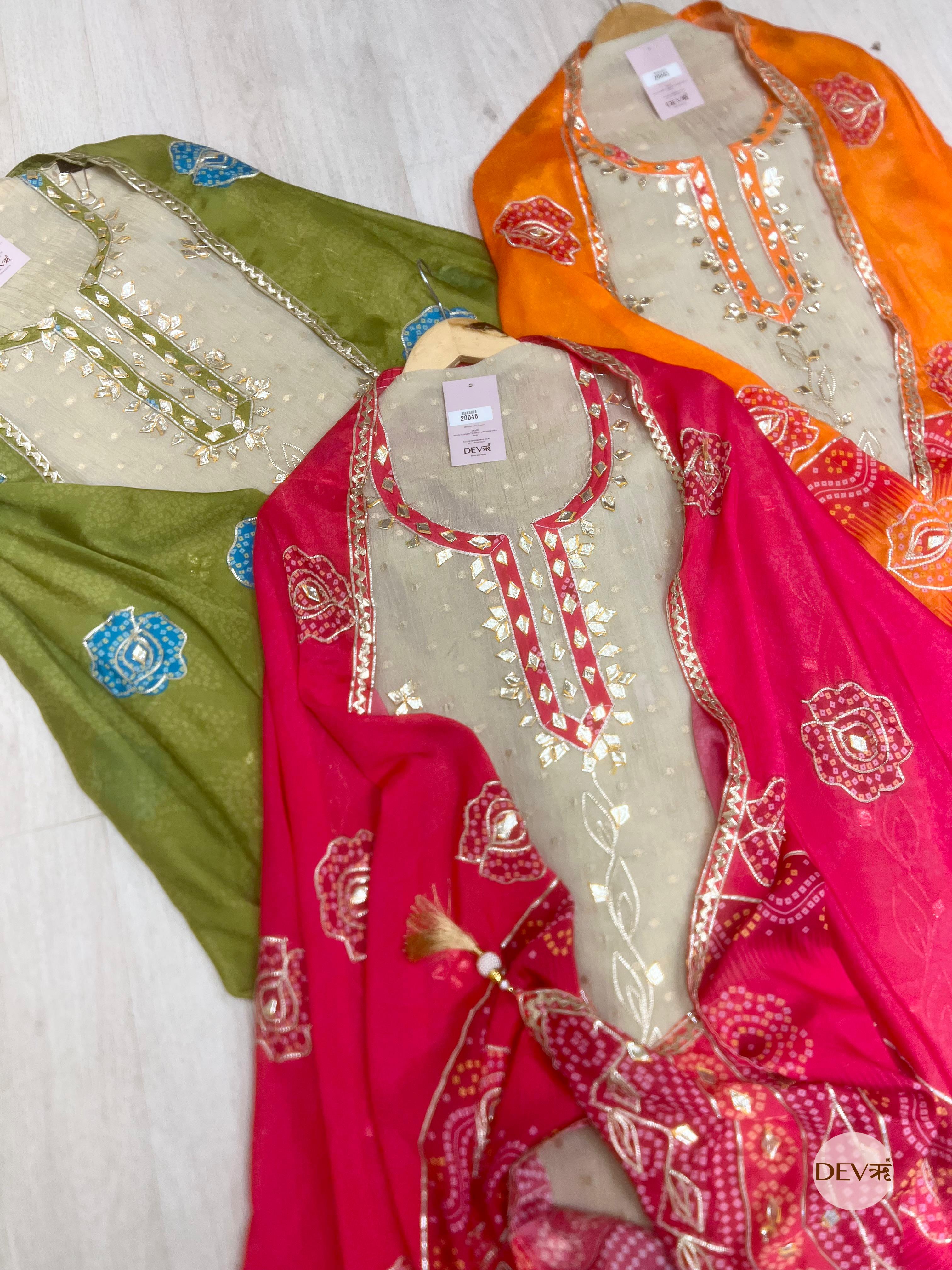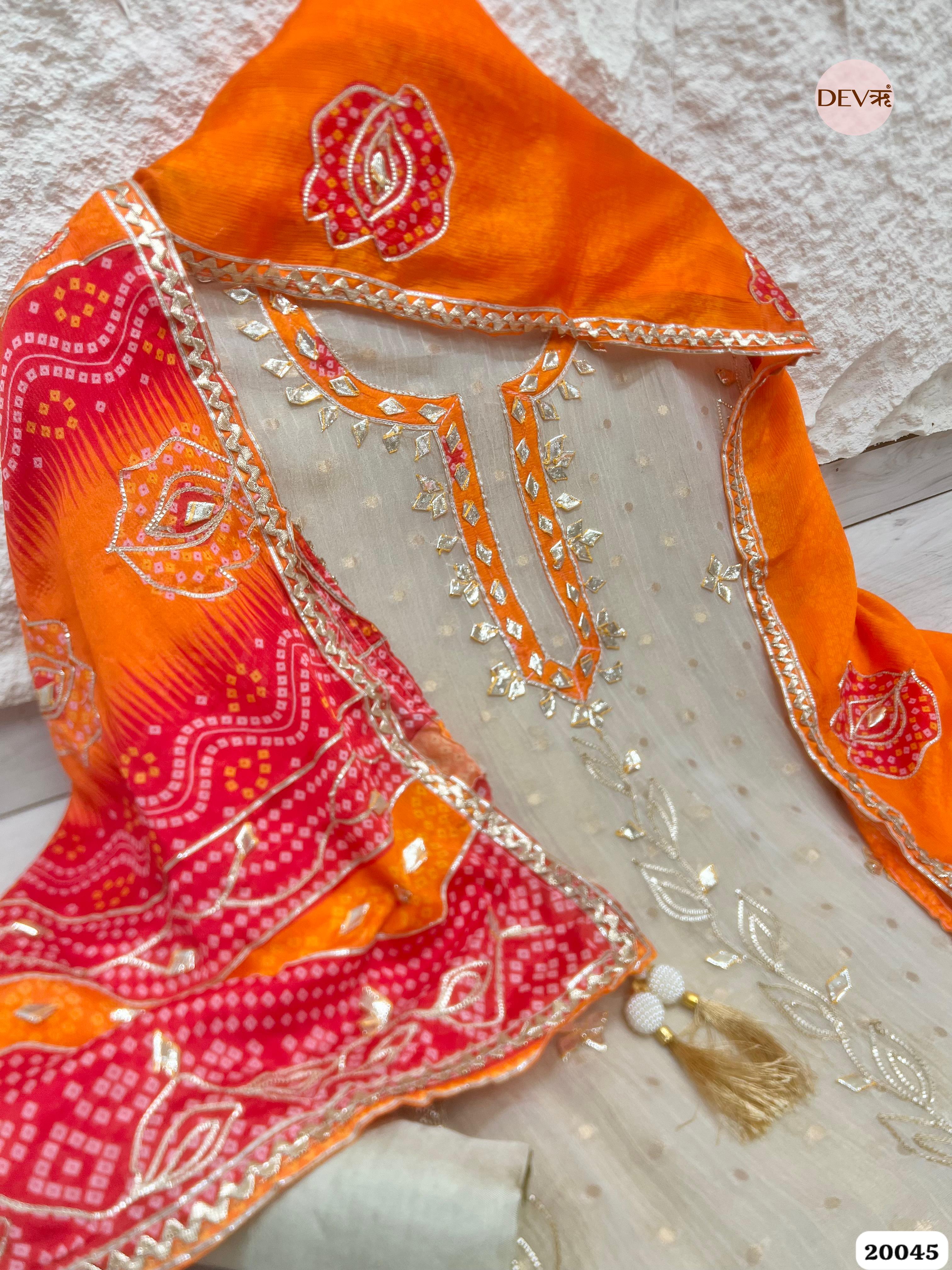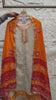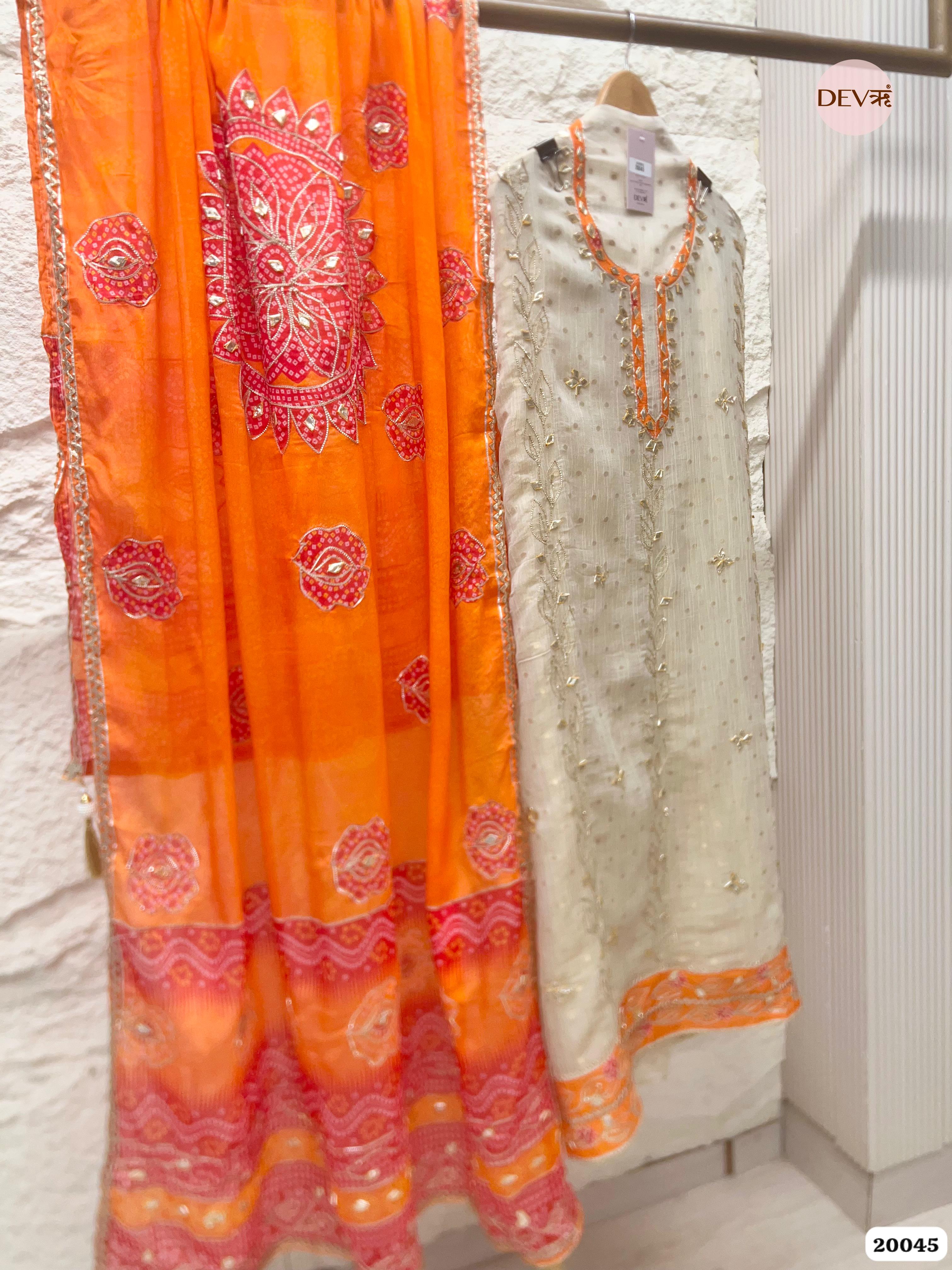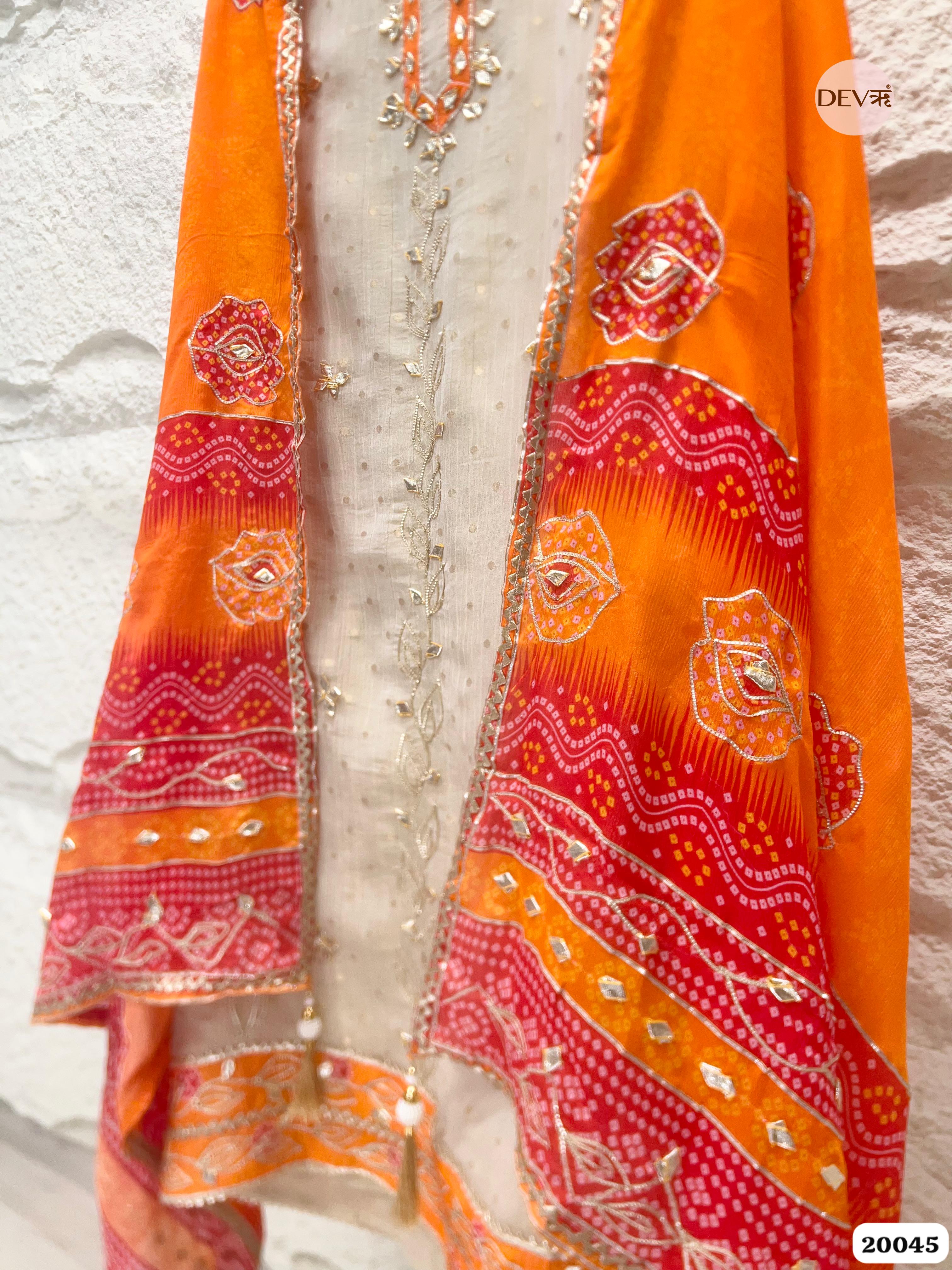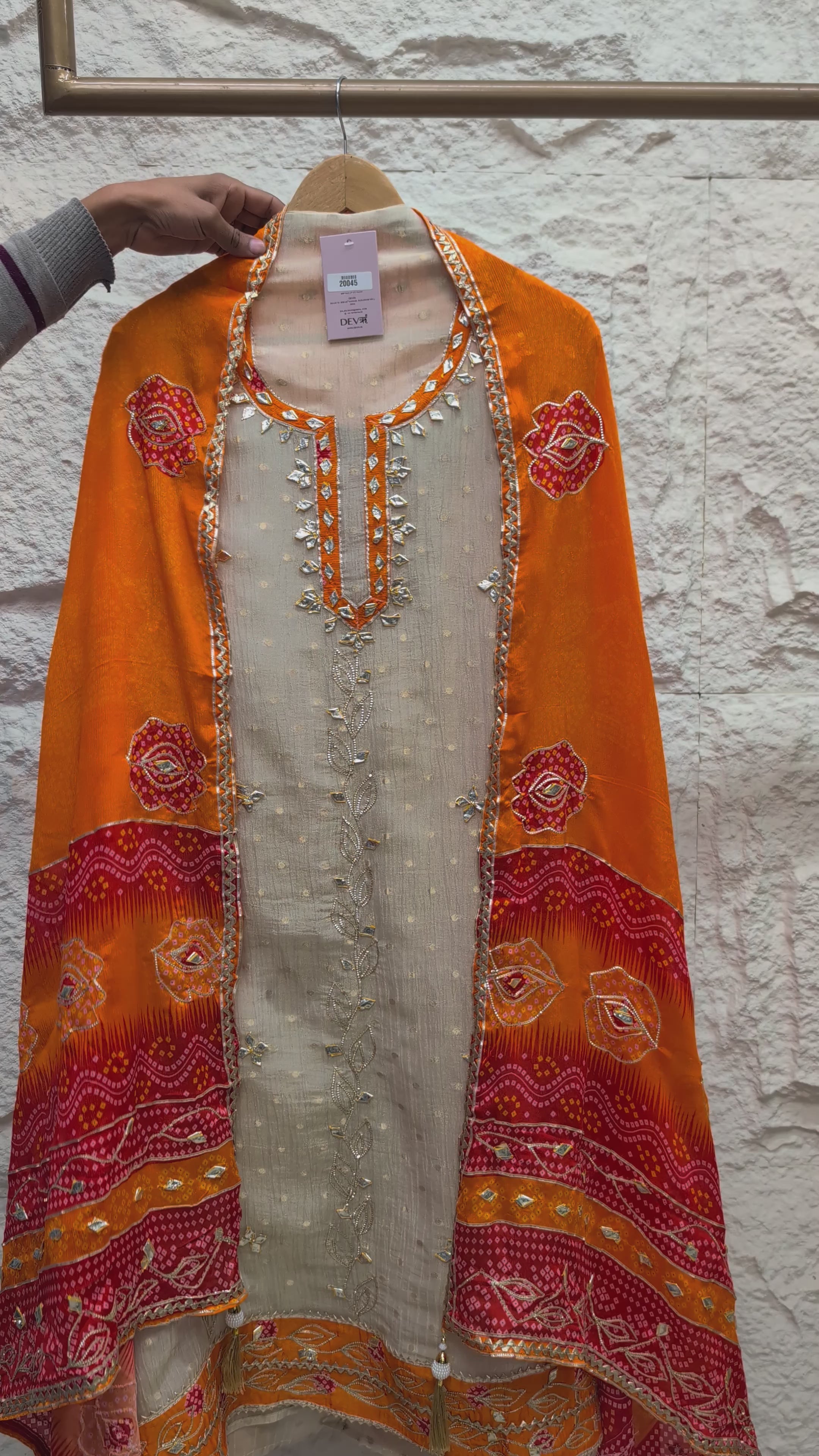 An elegant unstitched set featuring an ivory pure tissue crush shirt adorned with delicate embroidery that adds subtle texture and refined detail. The ensemble is paired with a vibrant orange pure chinon dupatta, highlighted by traditional printed motifs and an intricately finished border that brings warmth and contrast. Completed with a coordinated Upada silk bottom, this design reflects Devri’s signature craftsmanship and timeless aesthetic.