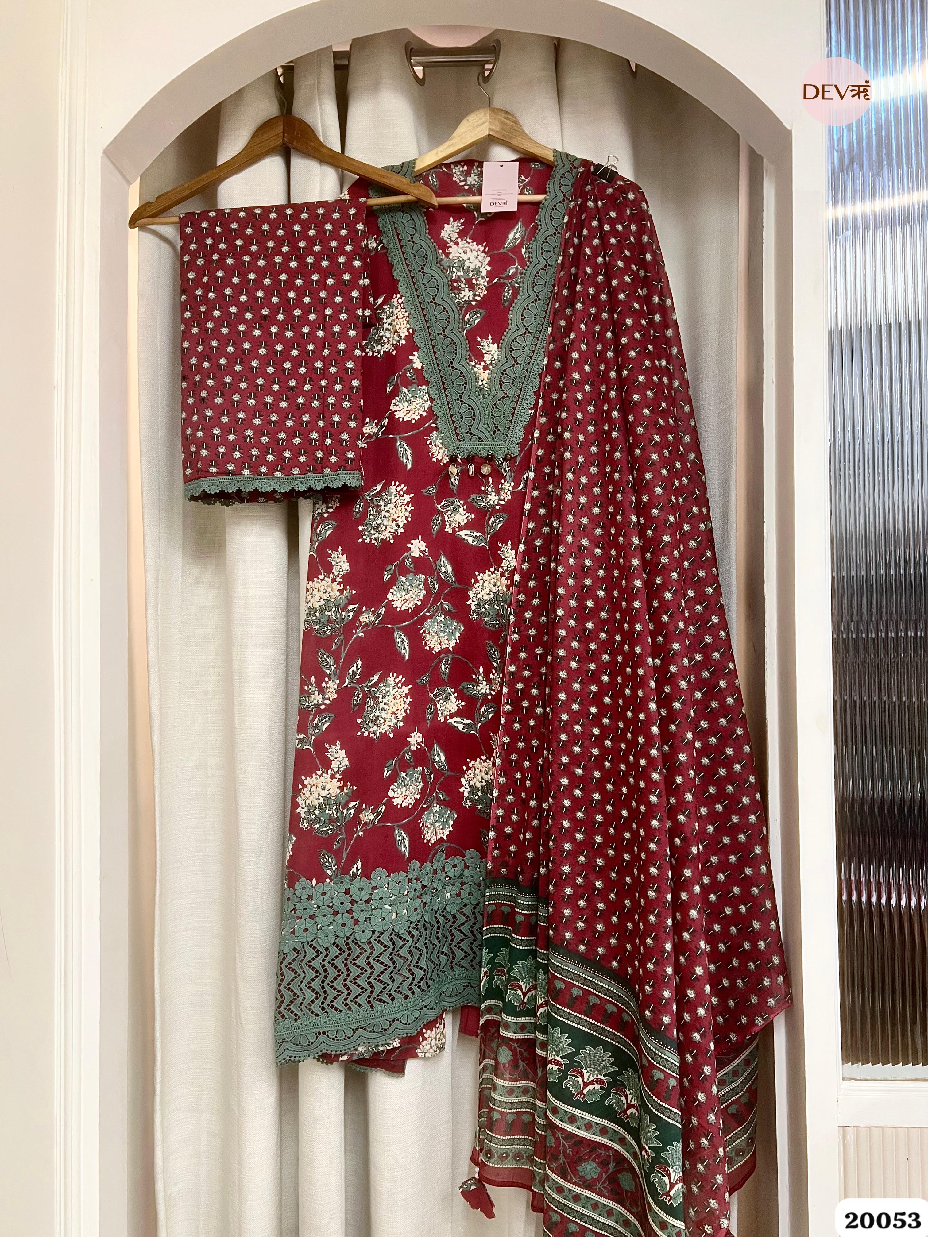 A rich maroon unstitched suit set adorned with delicate all-over prints and contrast detailing. Crafted in breathable pure cotton, the design is elevated with coordinated patterns and a softly balanced color palette, reflecting Devri’s understated elegance and timeless appeal.