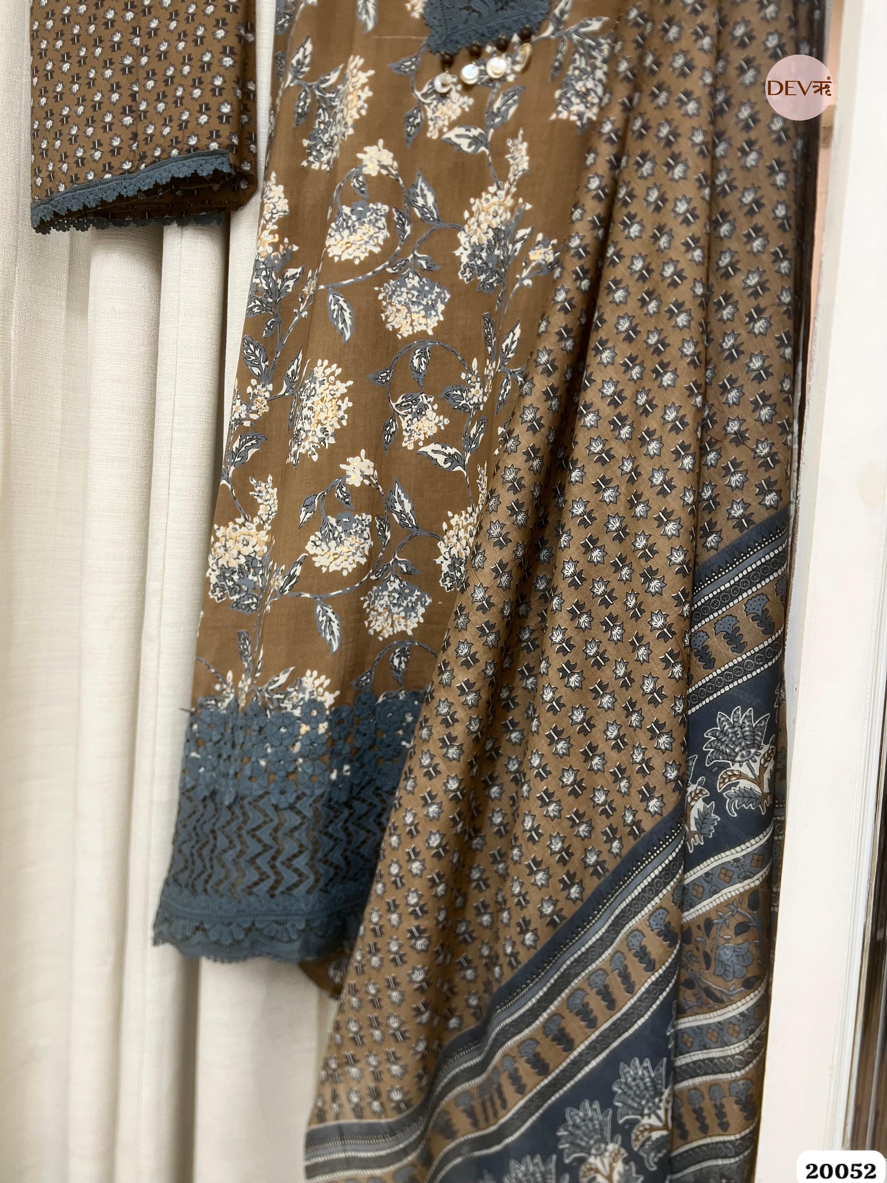 Olive Brown Pure Cotton Printed Unstitched 3-Piece Suit (Devri – D.No. 20052)