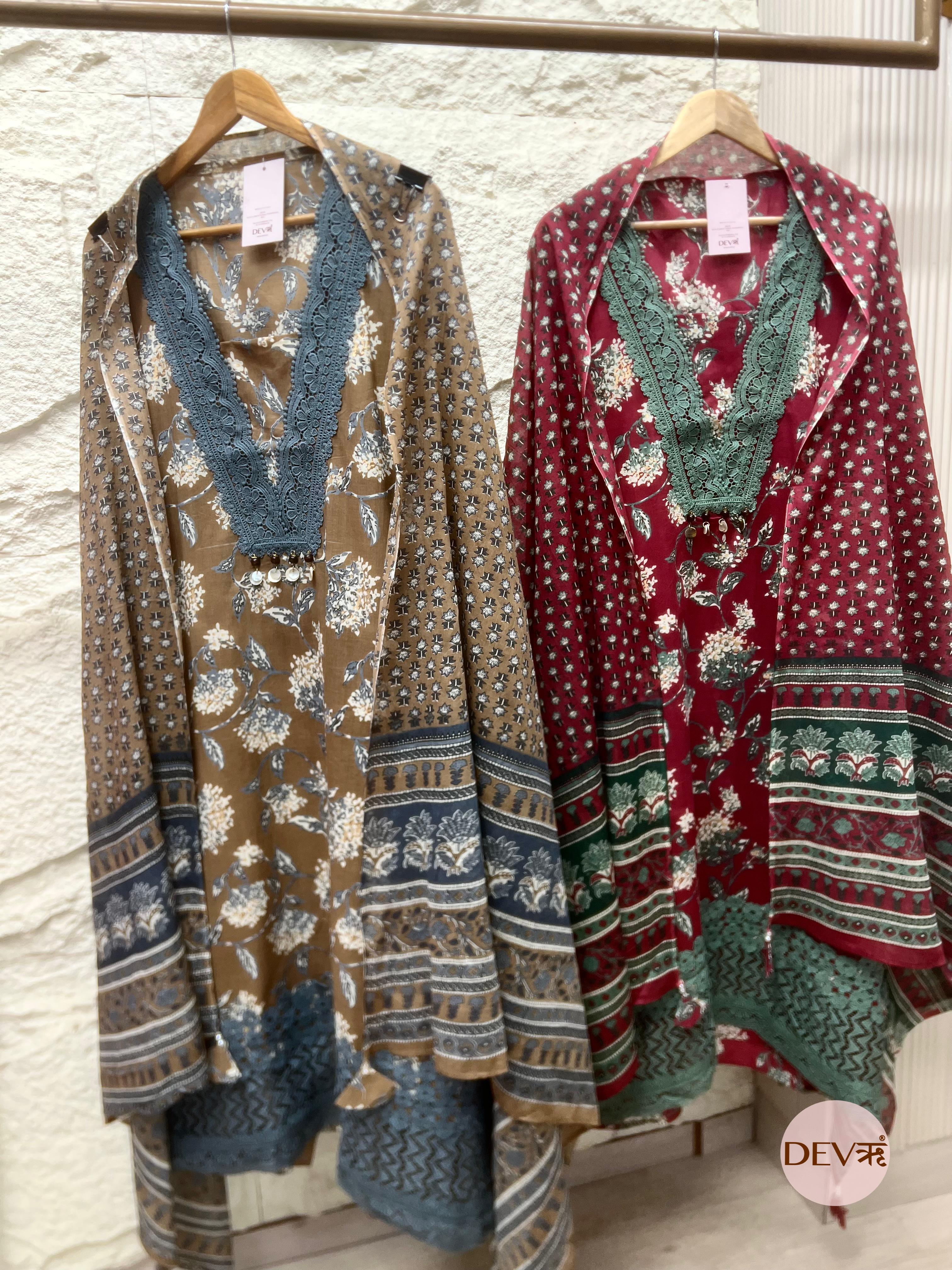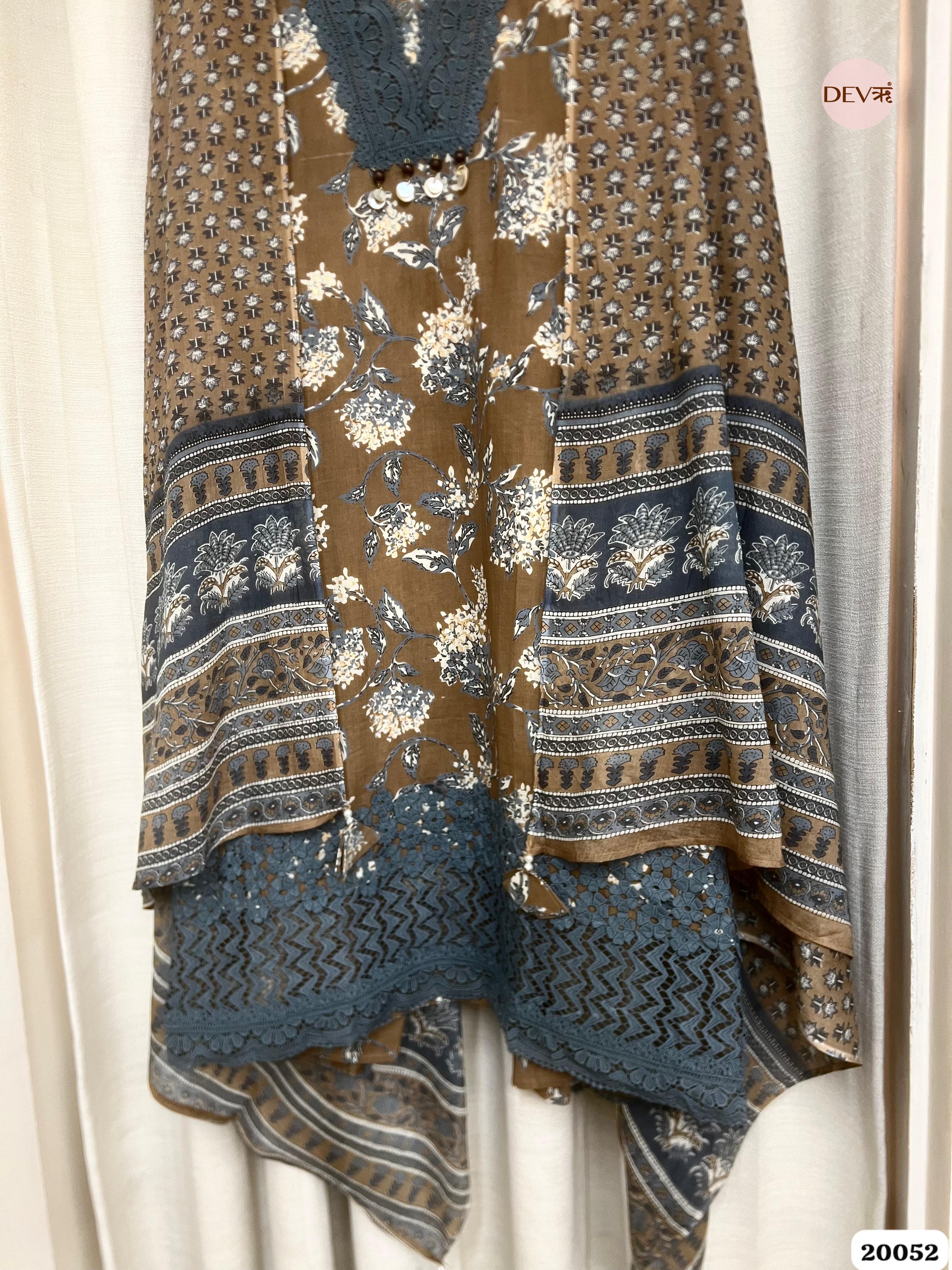 An elegant olive brown unstitched suit set highlighted with soft floral prints and contrast borders. Crafted in breathable pure cotton, the design balances intricate motifs with a calm, earthy palette, bringing together comfort and Devri’s signature understated sophistication.