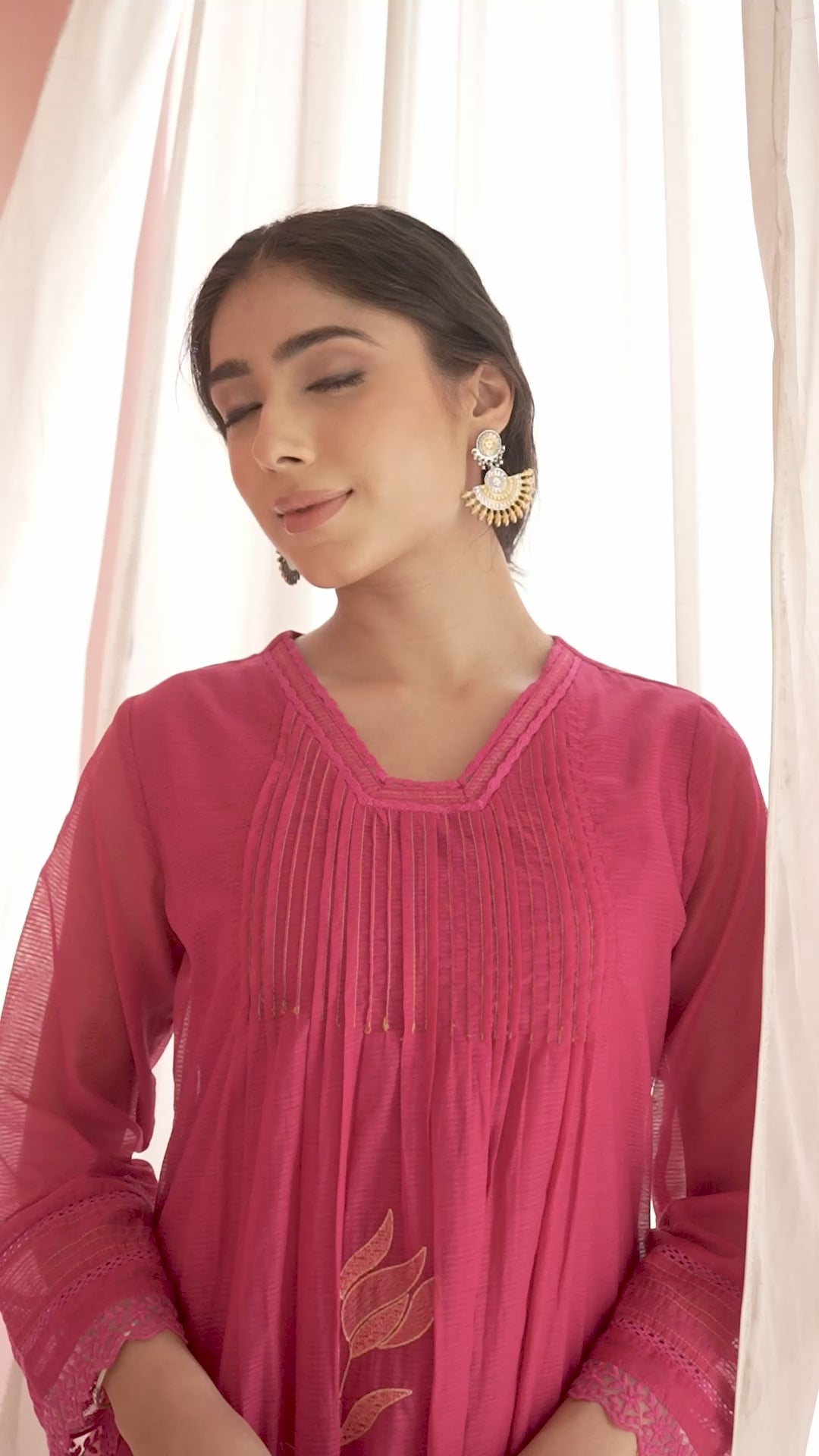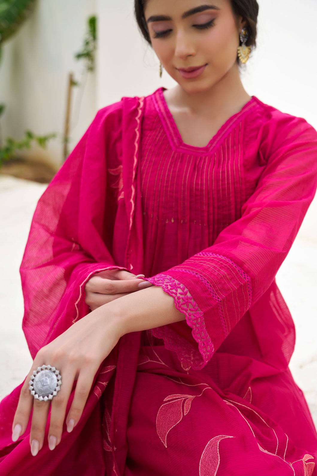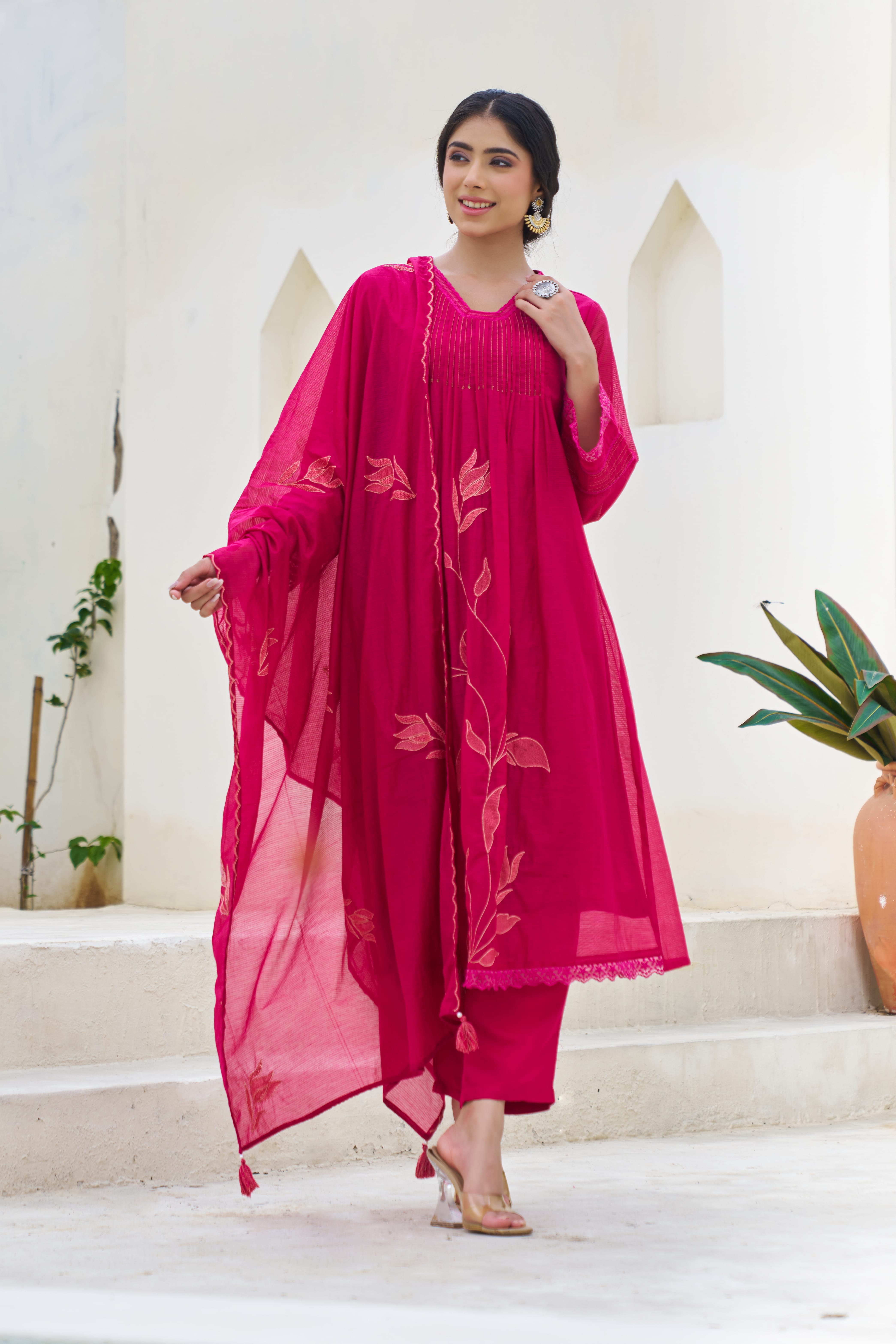 A fluid wine-hued 3-piece set adorned with delicate embroidered botanical motifs and fine pintuck detailing along the yoke. The airy mul cotton kurta flows gracefully over a straight silhouette, paired with a soft dupatta and coordinated bottoms for a balanced, elegant finish.