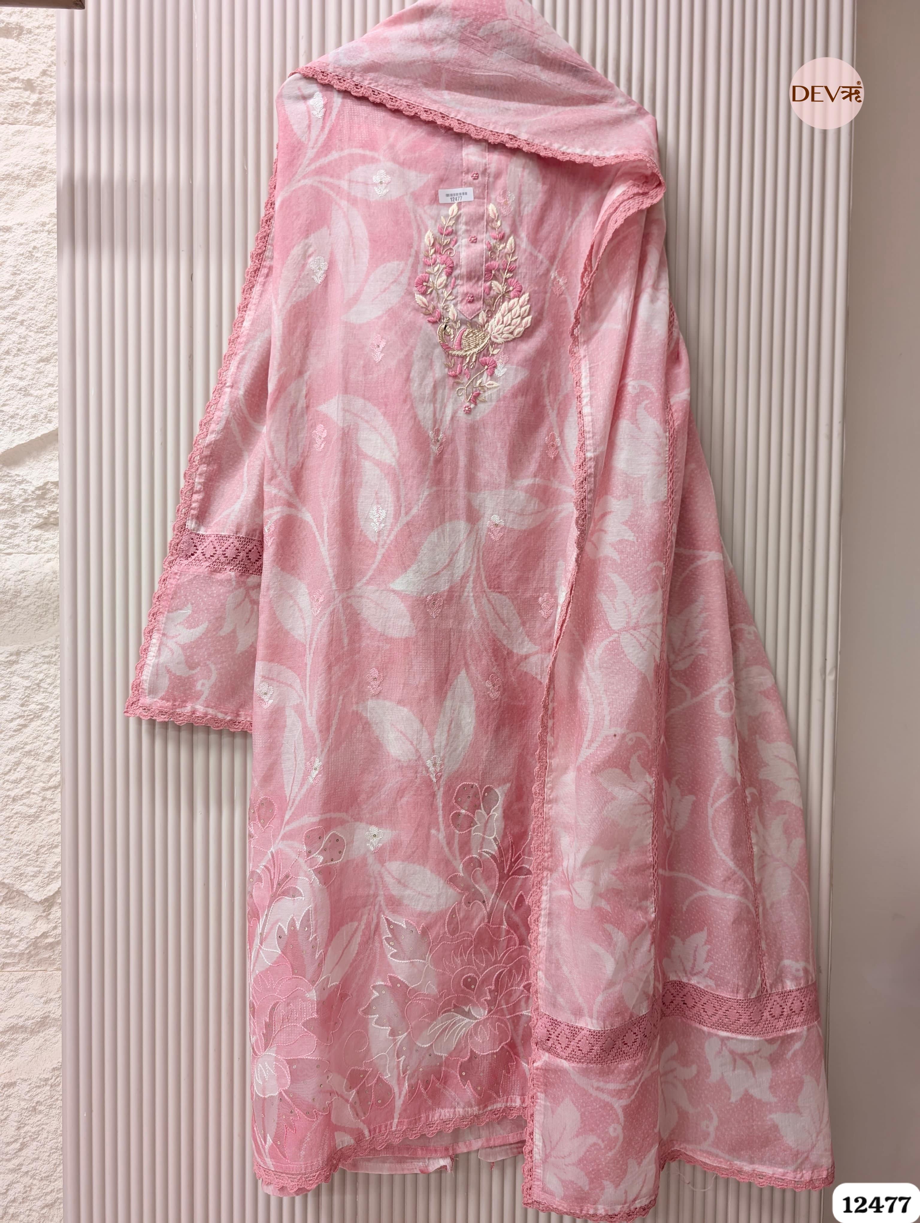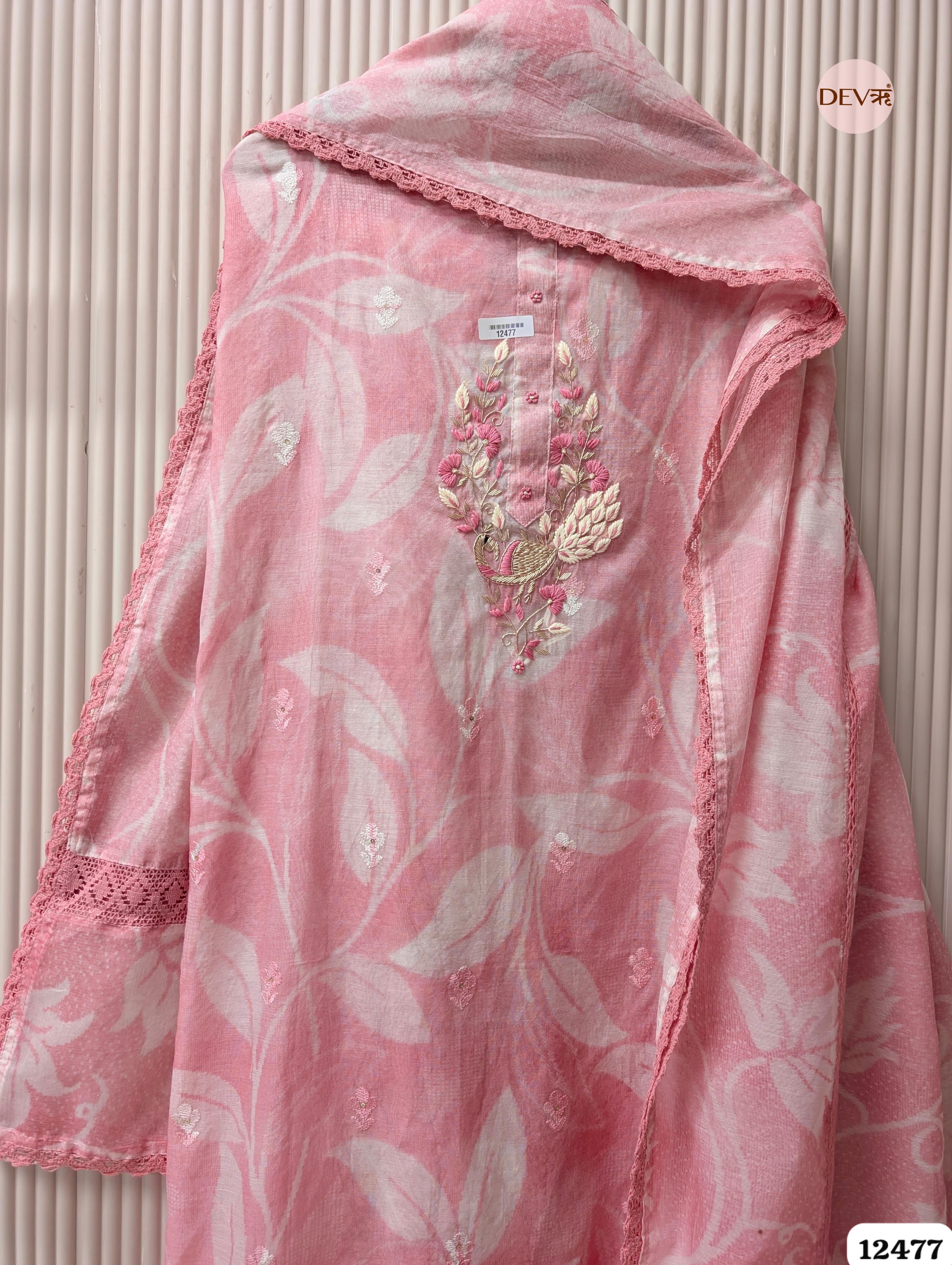 This Blush Pink unstitched suit set is crafted in mul chanderi, featuring a soft printed base enhanced with delicate embroidery that lends an elegant, airy appeal. The fabric carries a fine, lightweight texture with a subtle sheen, balanced with refined lace accents to maintain Devri’s calm and graceful aesthetic.