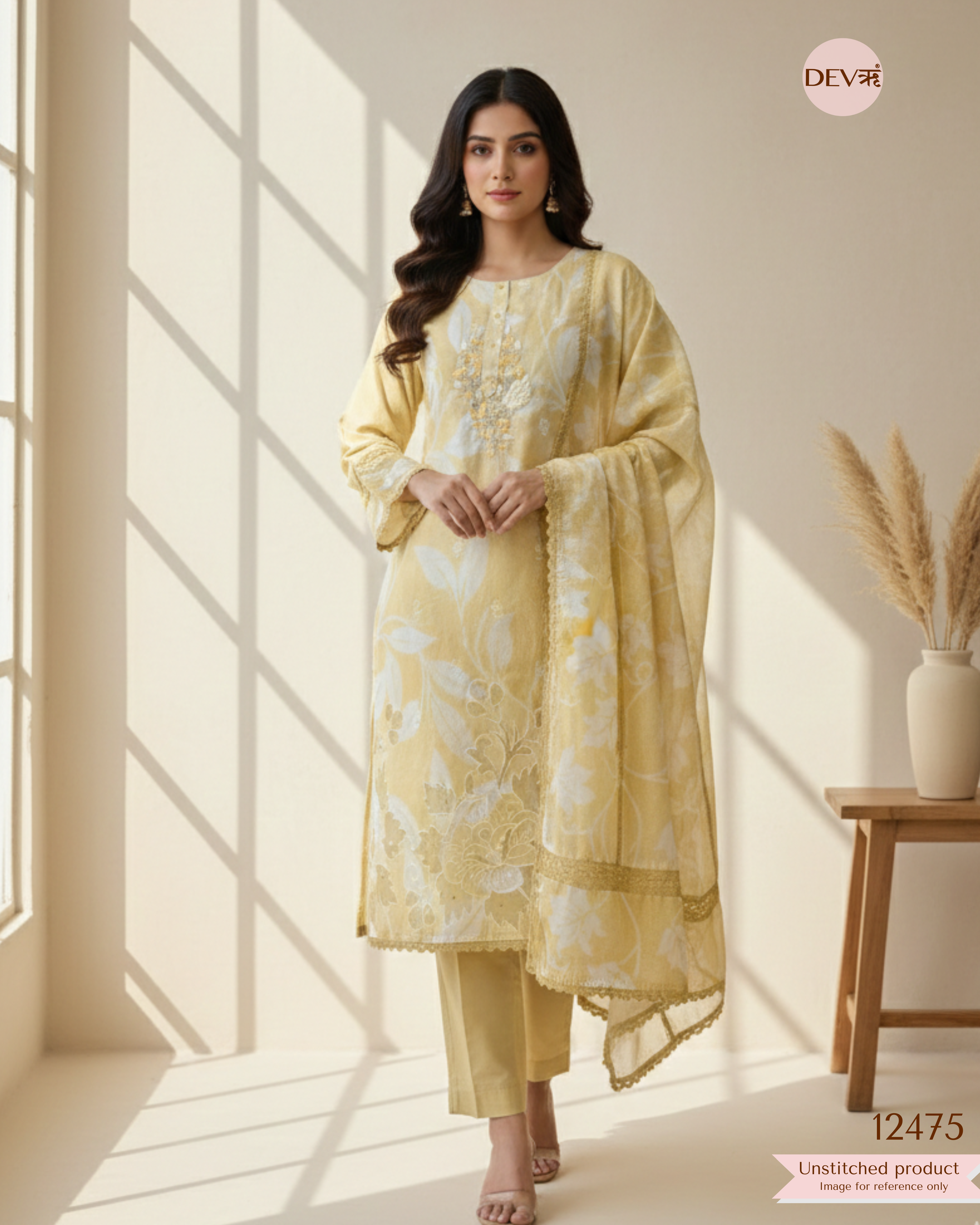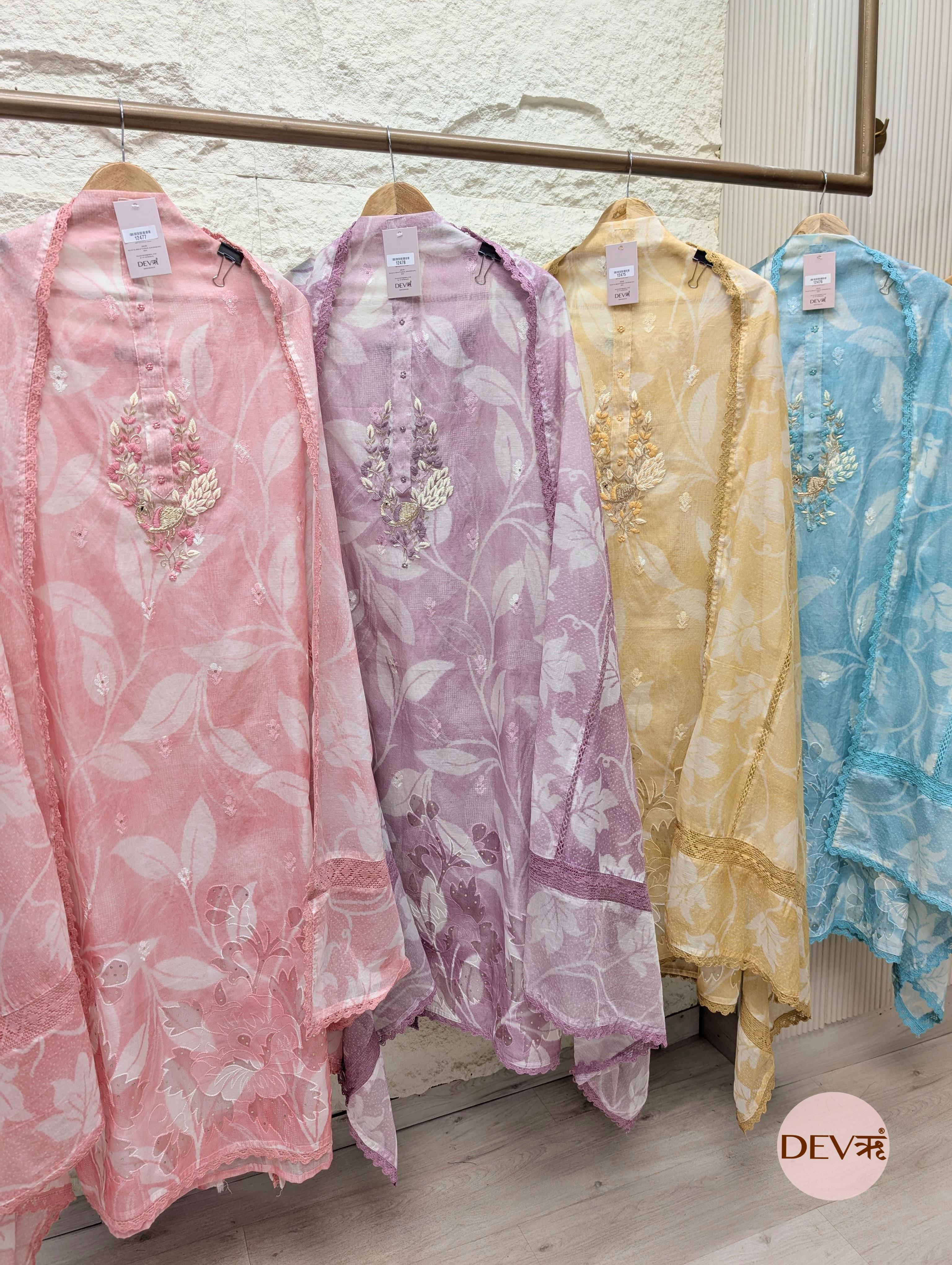 This Soft Mustard unstitched suit set is crafted in mul chanderi, featuring a softly printed base enriched with delicate embroidery that brings depth and quiet elegance to the design. The fabric’s fine, lightweight texture with a subtle sheen is balanced by refined lace accents, reflecting Devri’s signature calm and understated aesthetic.