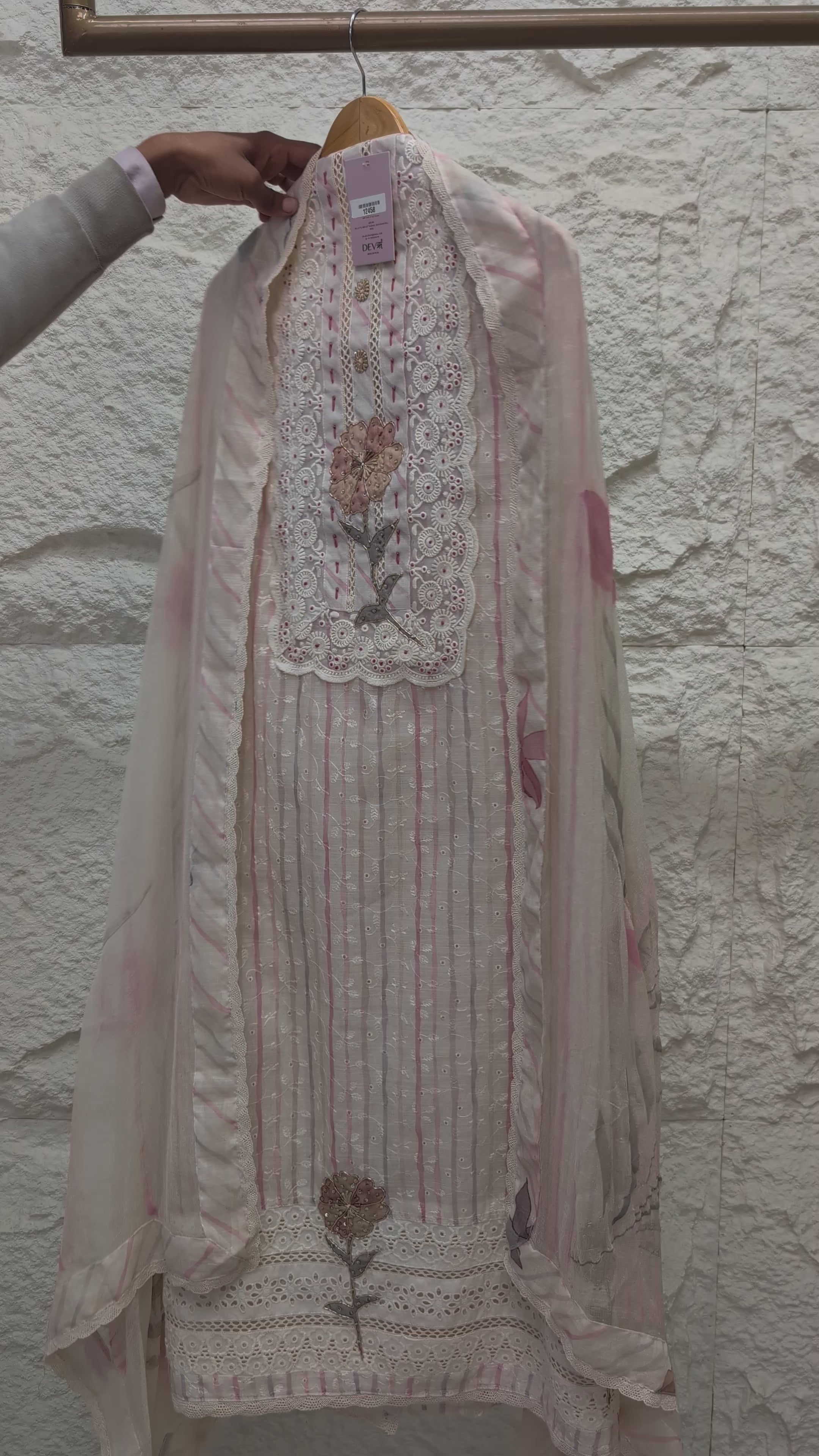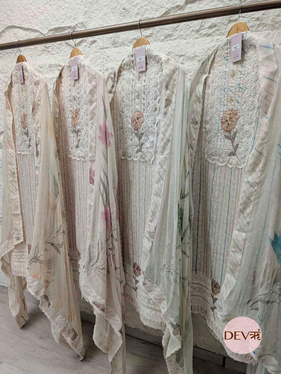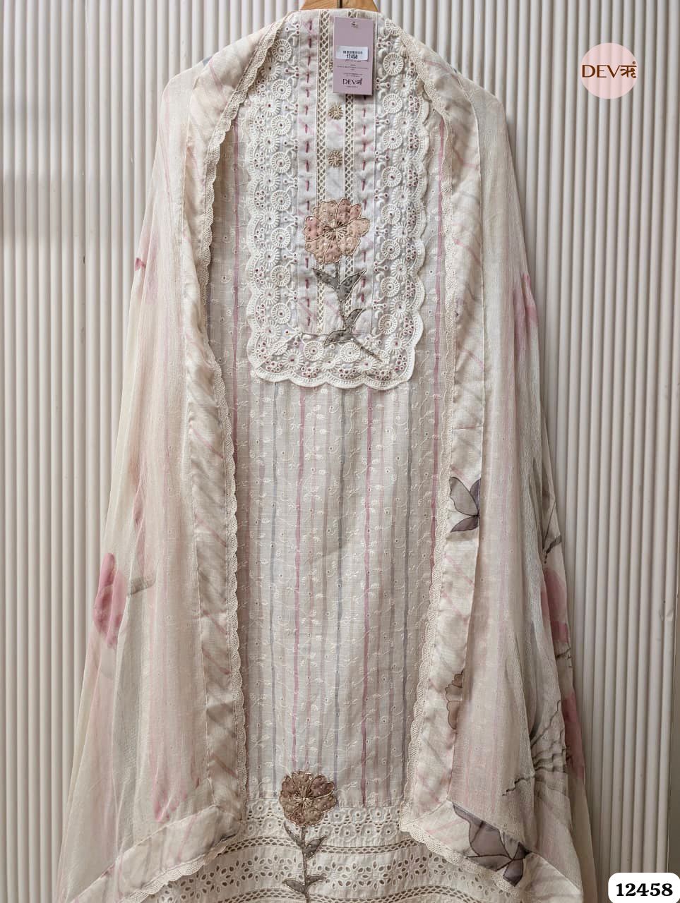 This graceful ensemble features a soft beige base elevated by delicate pink vertical stripes and ethereal floral accents. Crafted from premium pure linen, the design is highlighted by an ornate white schiffli lace yoke and matching heavy lace-work at the hem. A handcrafted 3D floral patch with subtle beadwork serves as a refined centerpiece, embodying Devri’s signature aesthetic of understated luxury and airy elegance.