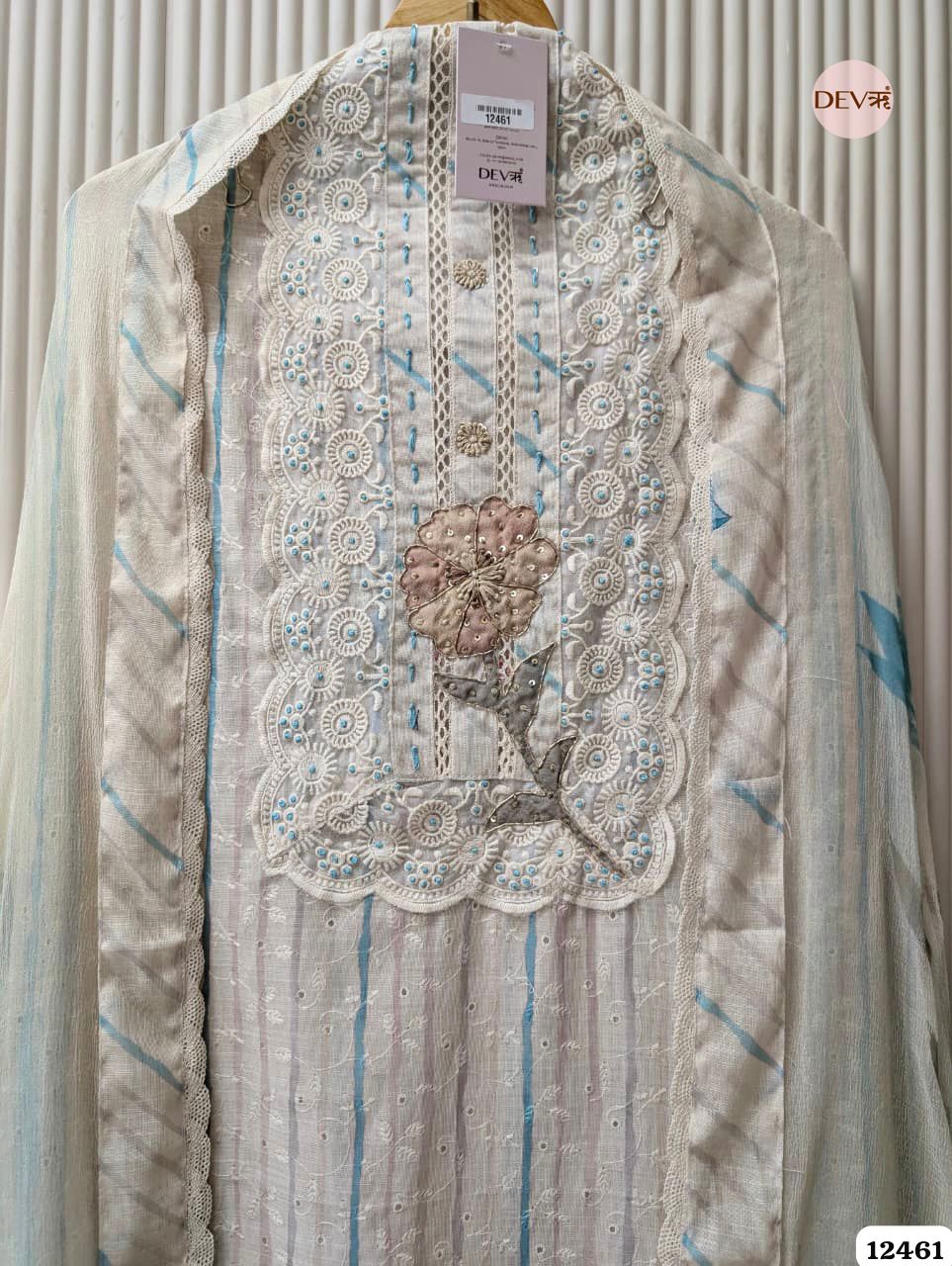 Description: This serene ensemble features a soft beige base elevated by cool blue vertical stripes and delicate floral accents. Crafted from premium pure linen, the design is highlighted by an ornate white schiffli lace yoke and matching heavy lace-work at the hem. A handcrafted 3D floral patch with subtle beadwork serves as the elegant focal point, embodying Devri’s signature aesthetic of understated luxury and airy elegance.