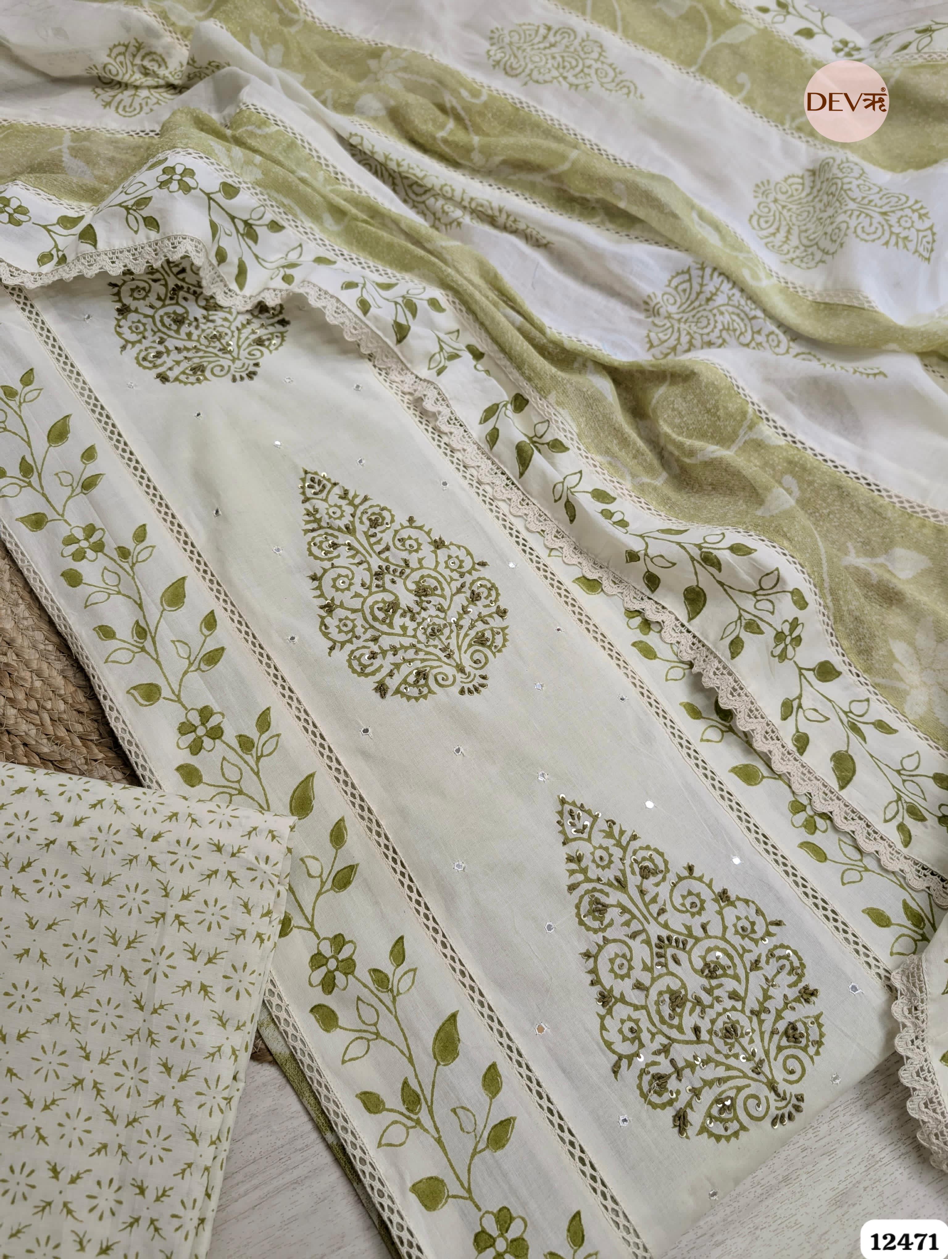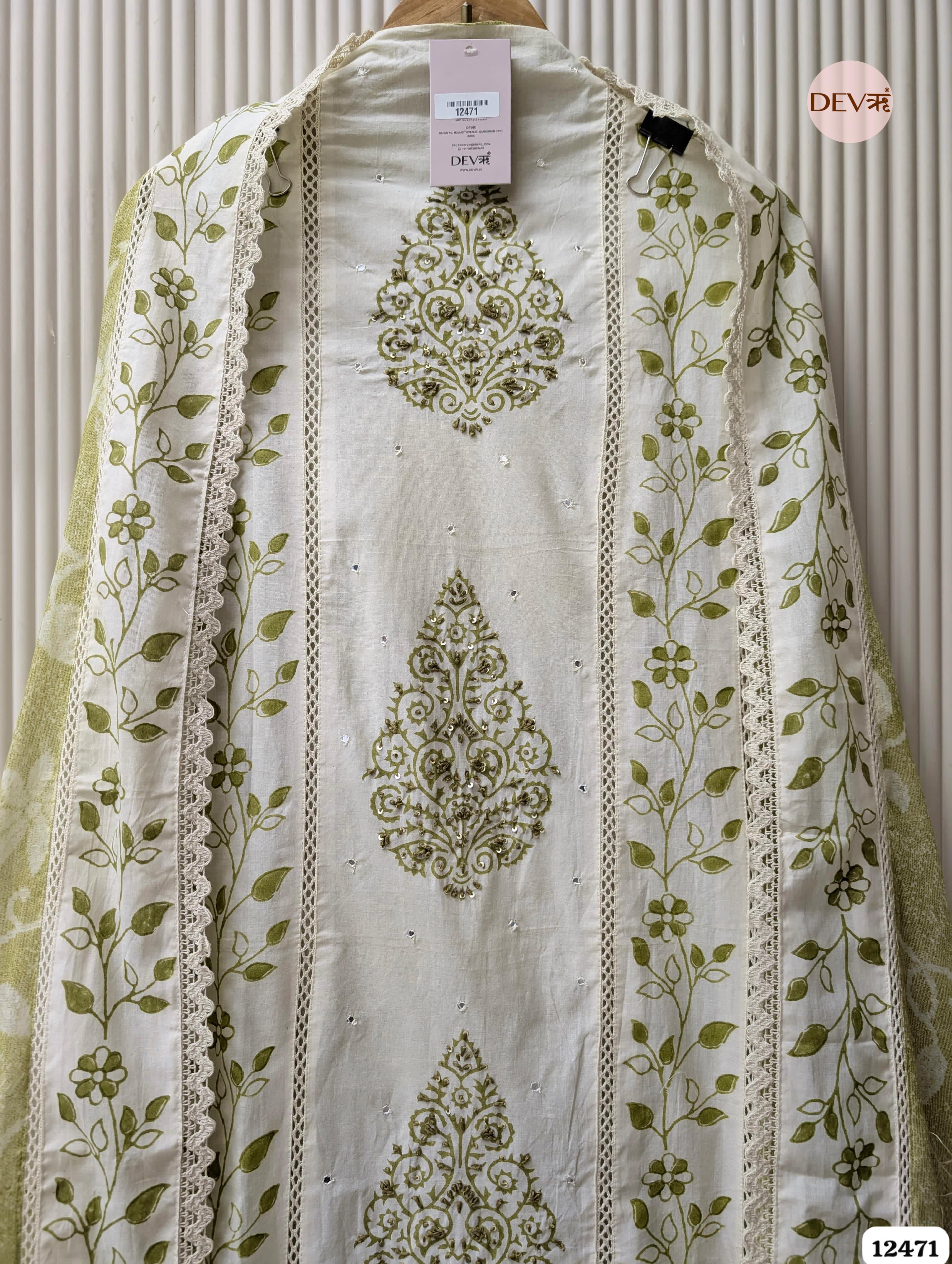 This serene white ensemble is adorned with sophisticated olive green damask motifs and delicate floral vine borders. Crafted from premium pure cotton, the design features subtle sequin highlights and fine ladder lace inserts, providing a breathable texture and a polished aesthetic that reflects Devri’s signature refined, neutral-toned style.
