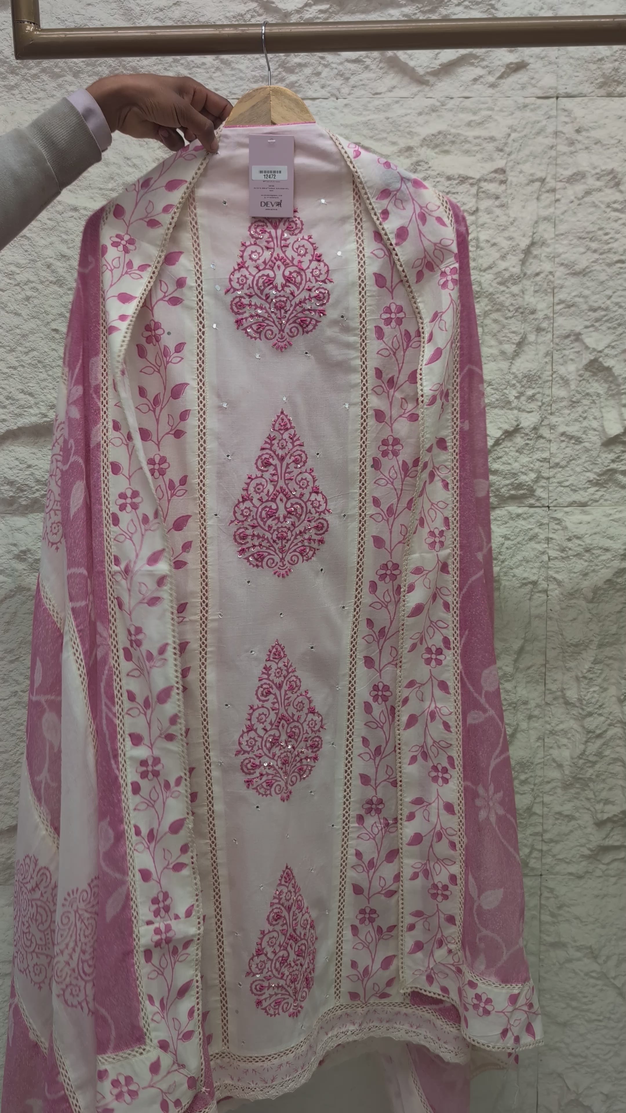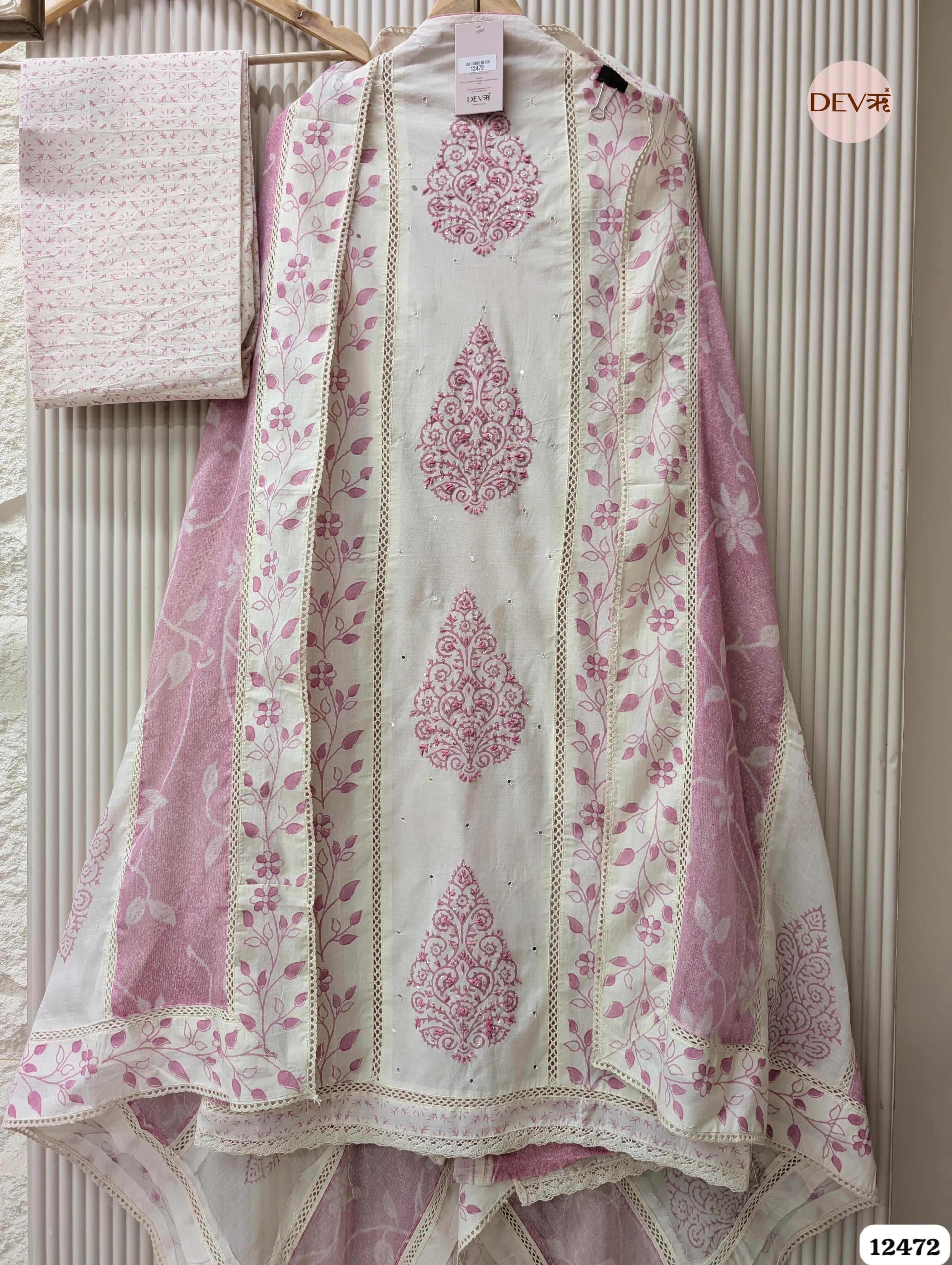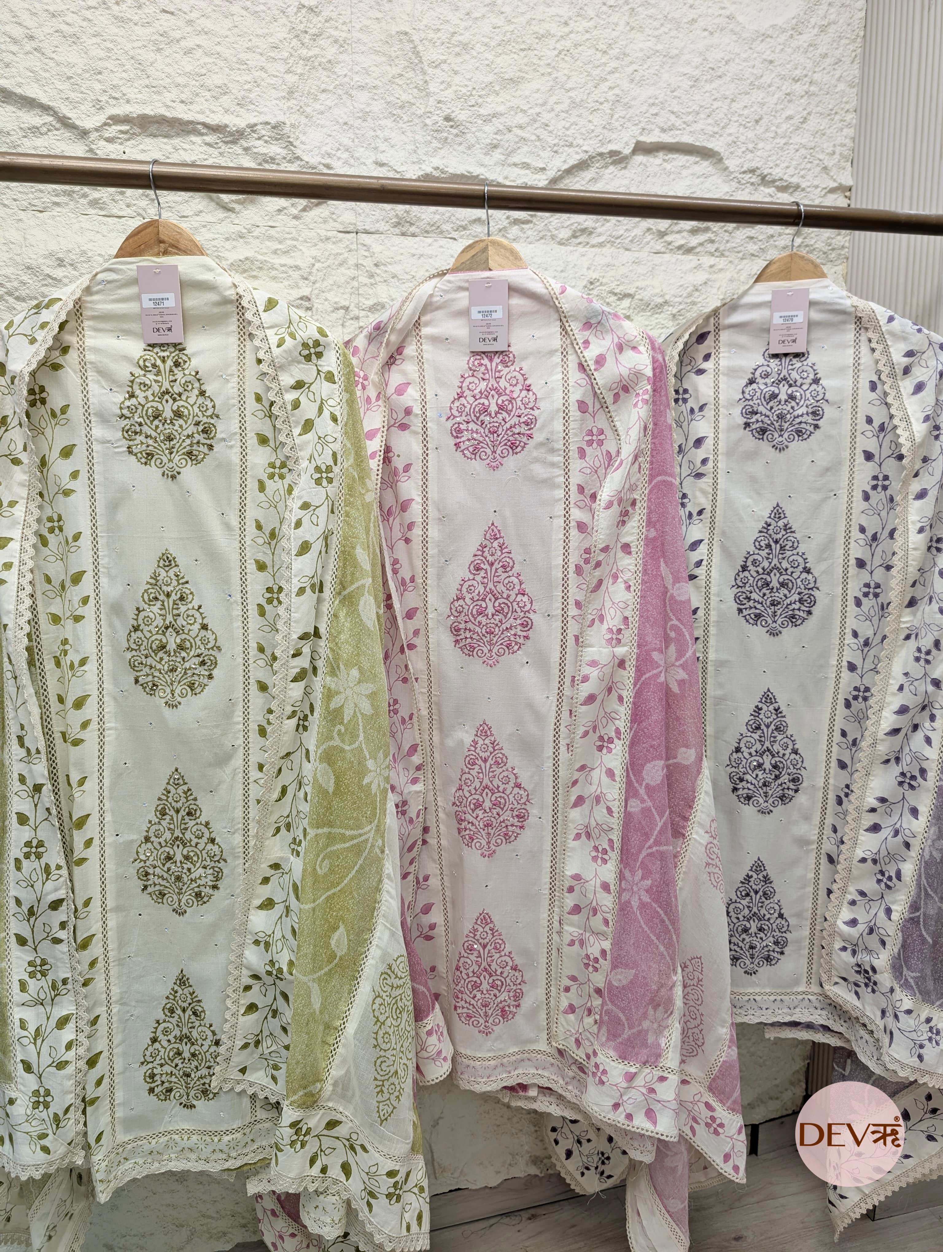 This charming white ensemble features delicate pink floral vine borders and intricate damask motifs. Crafted from premium pure cotton, the design is elevated by subtle sequin highlights and fine ladder lace inserts, offering a breathable texture and a polished, airy aesthetic that perfectly captures Devri’s refined, neutral-toned elegance.